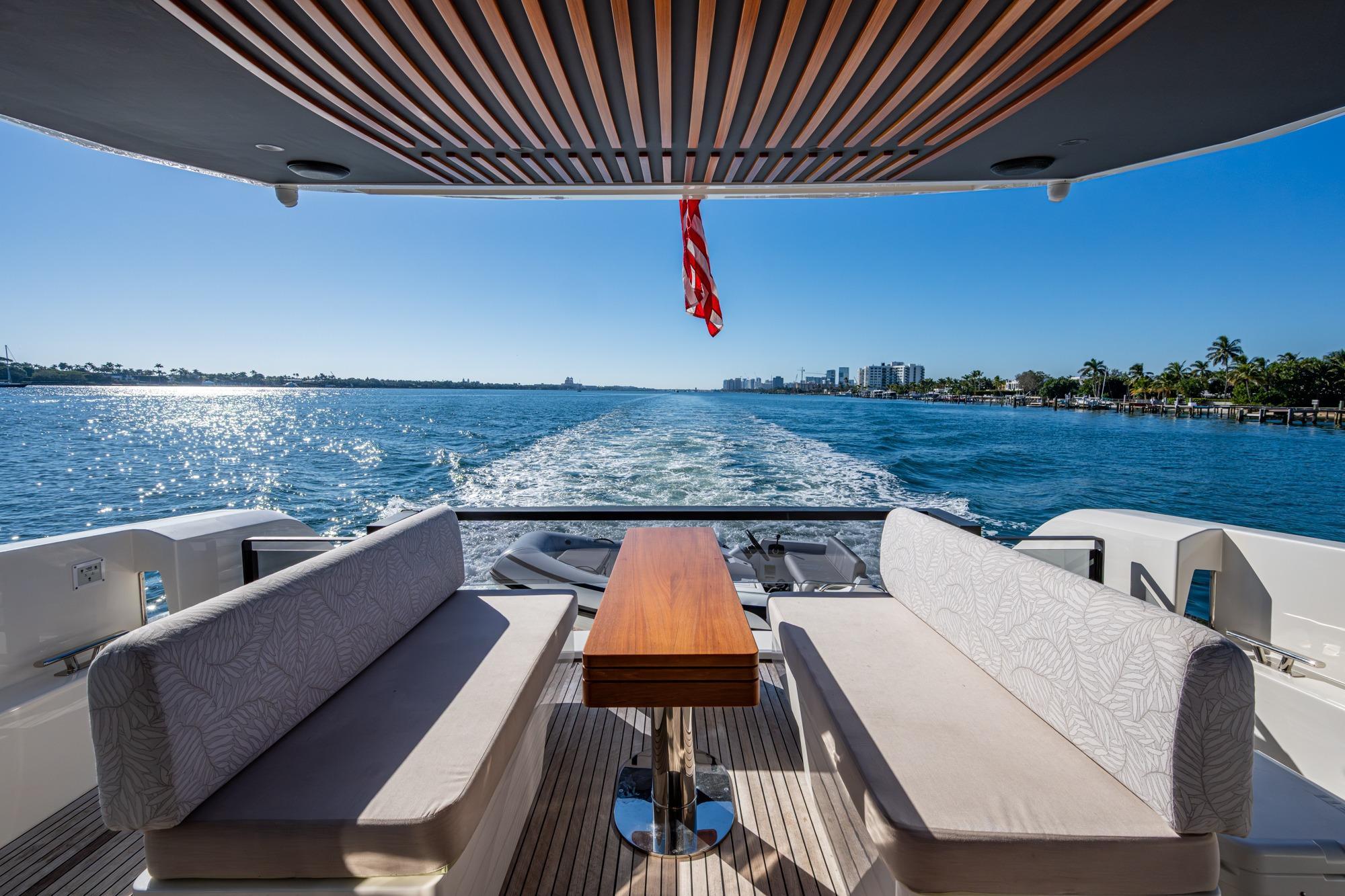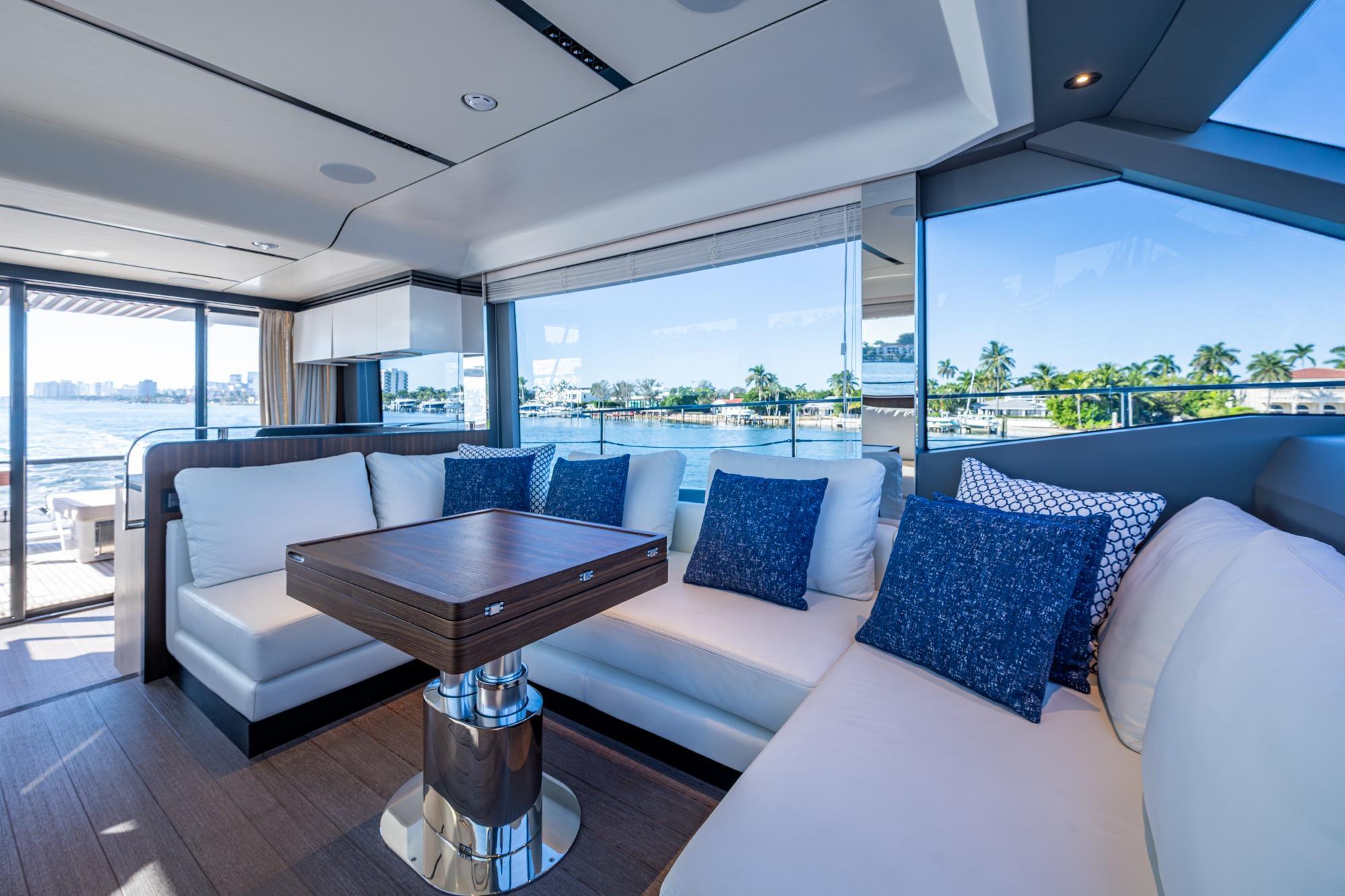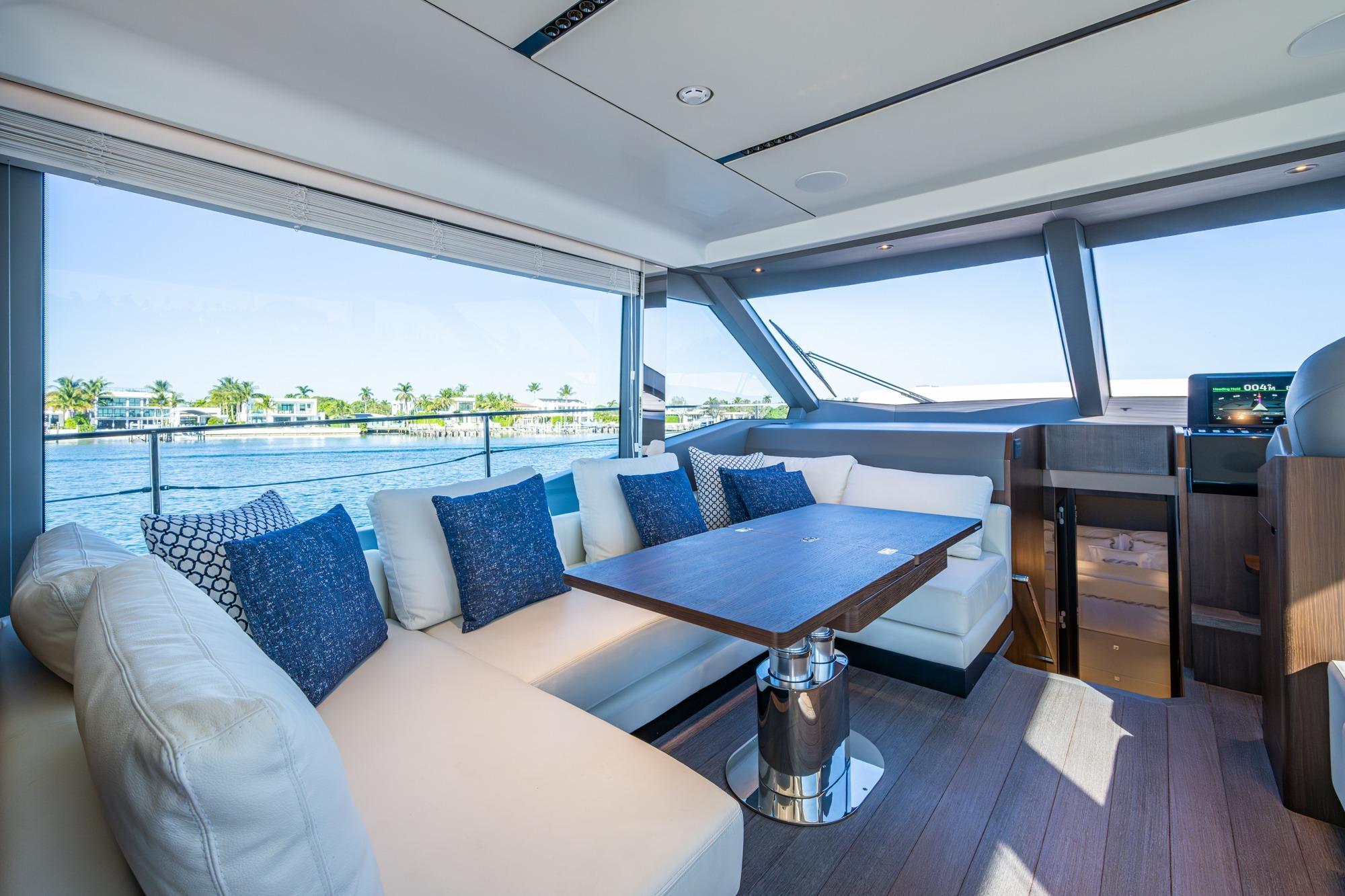 The Flybridge on the AS5 is massive and has plenty of room for everyone. As you make your way up the stairs you will find multiple seating areas, and a large sun pad forward of the helm. The area to port has a U shaped seating arrangement with storage and an expandable table for dining. All the way aft is another larger U shaped seating area that also has storage underneath and two custom teak tables. In-between the two seating areas is a nice wet bar with sink, electric grill and freezer/refrigeration for all your entertaining needs.