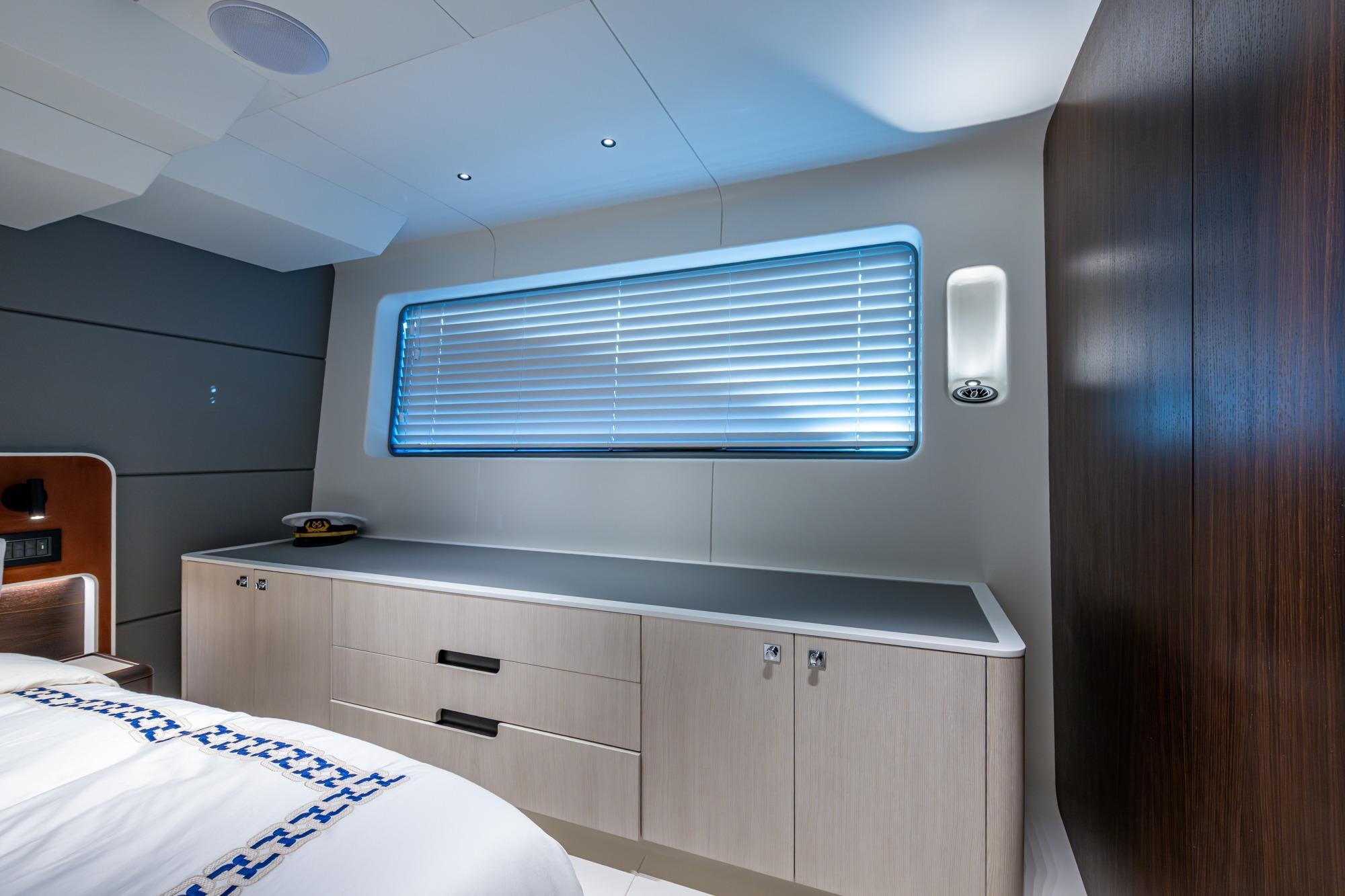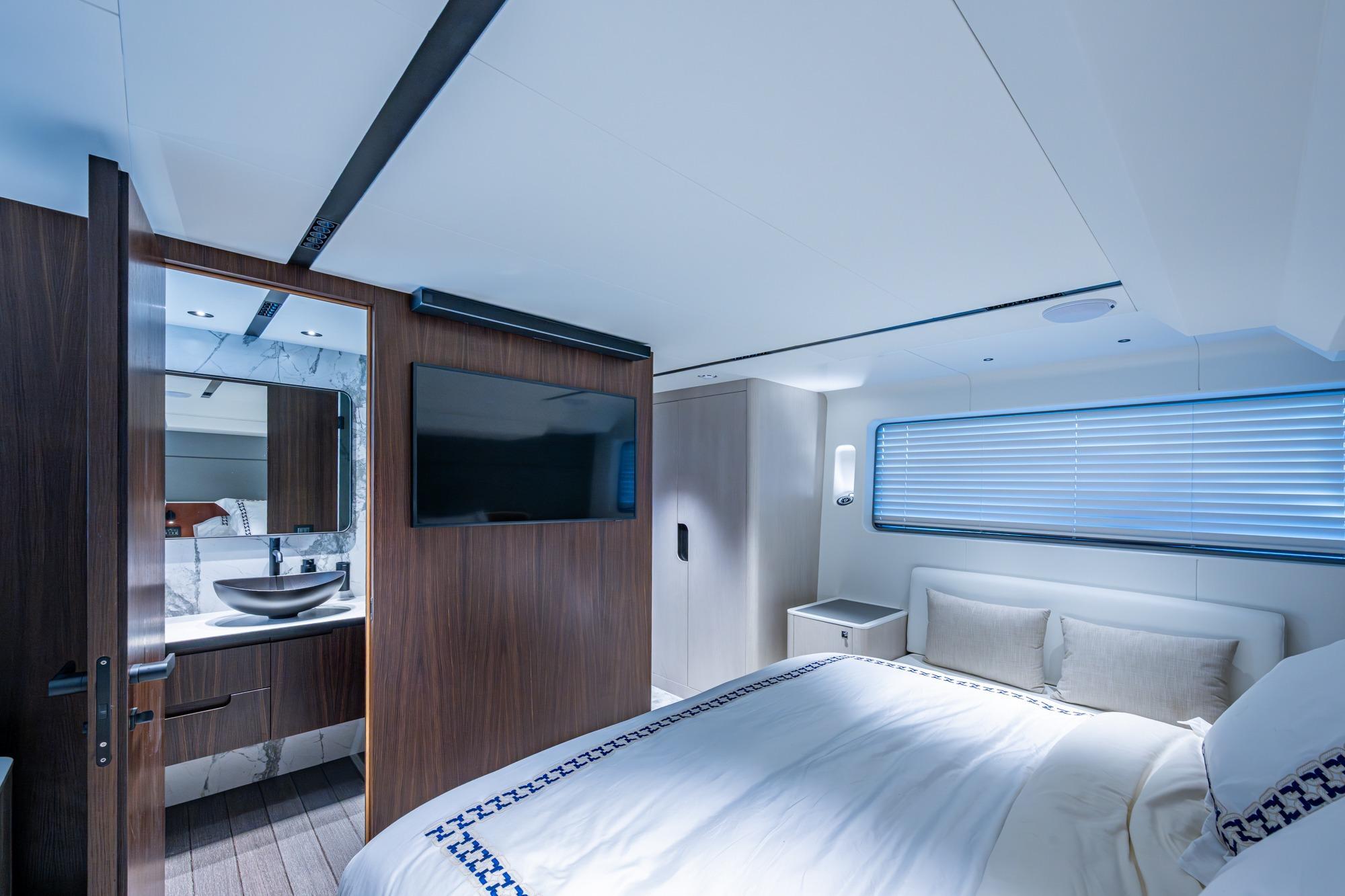 The Master Stateroom is spacious with its full beam configuration, huge windows, and king size bed, it also offers a leather seatee to stbd, Dual nightstands with hdmi and usb ports, a Samsung smart tv with sound bar, Fusion speakes and head unit ,full height cedar lined hanging locker, abundant storage throughout and luxurious head with beautiful stonework and a glass shower enclosure.