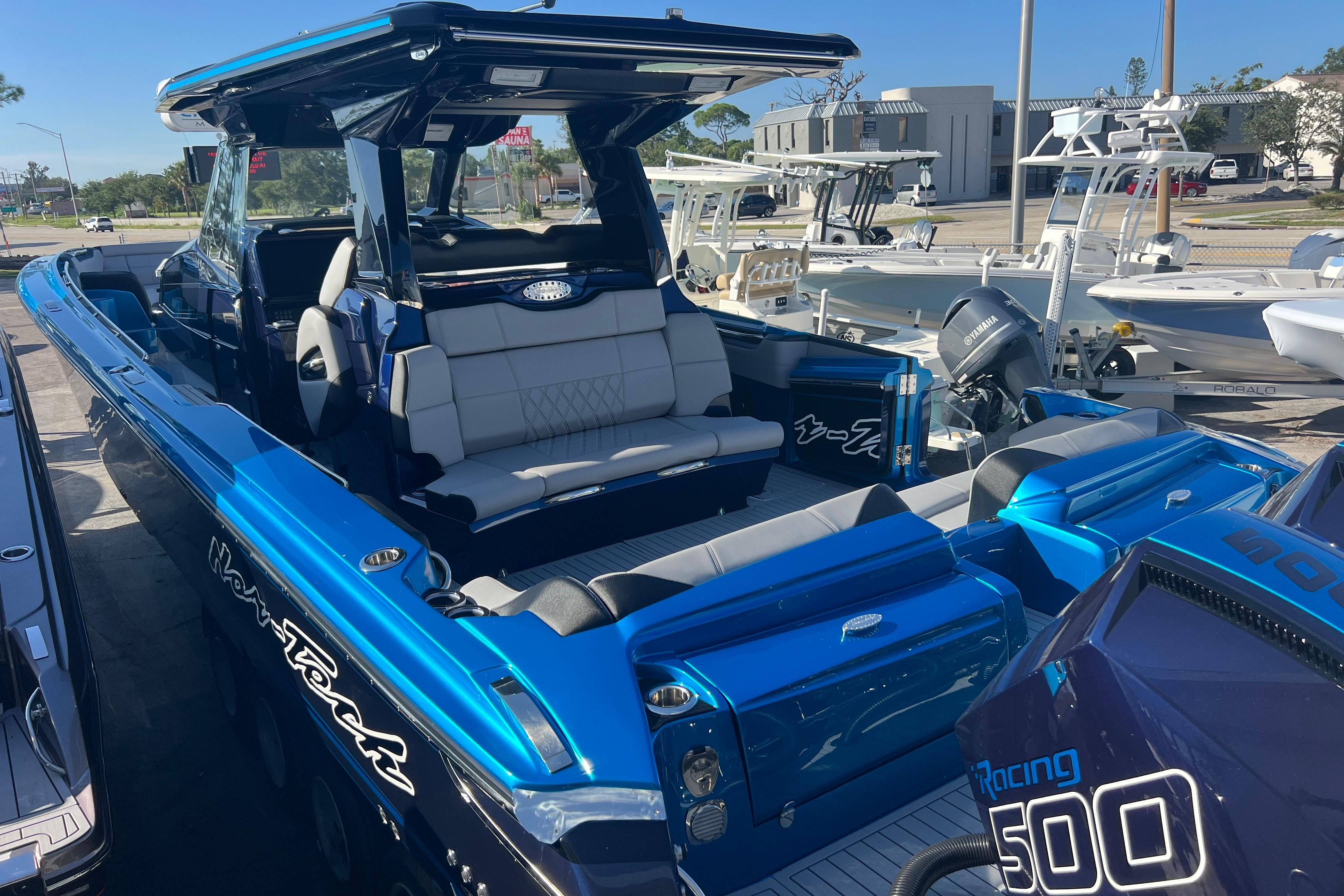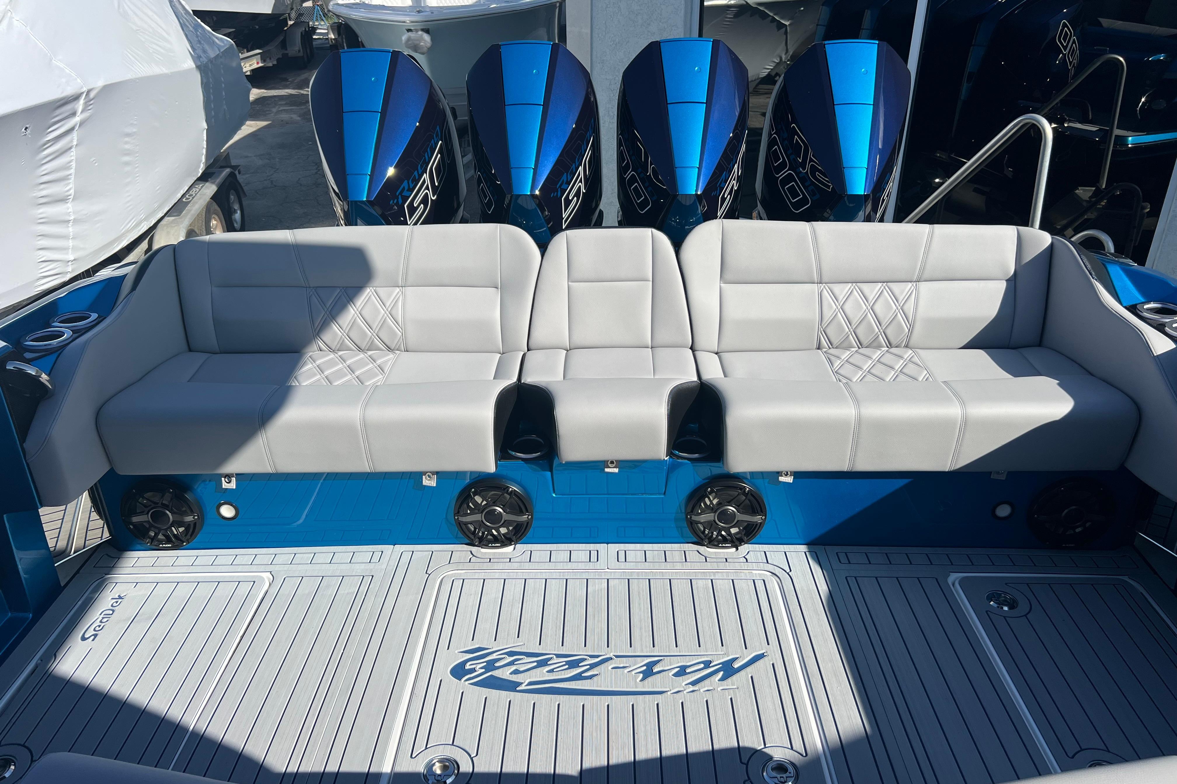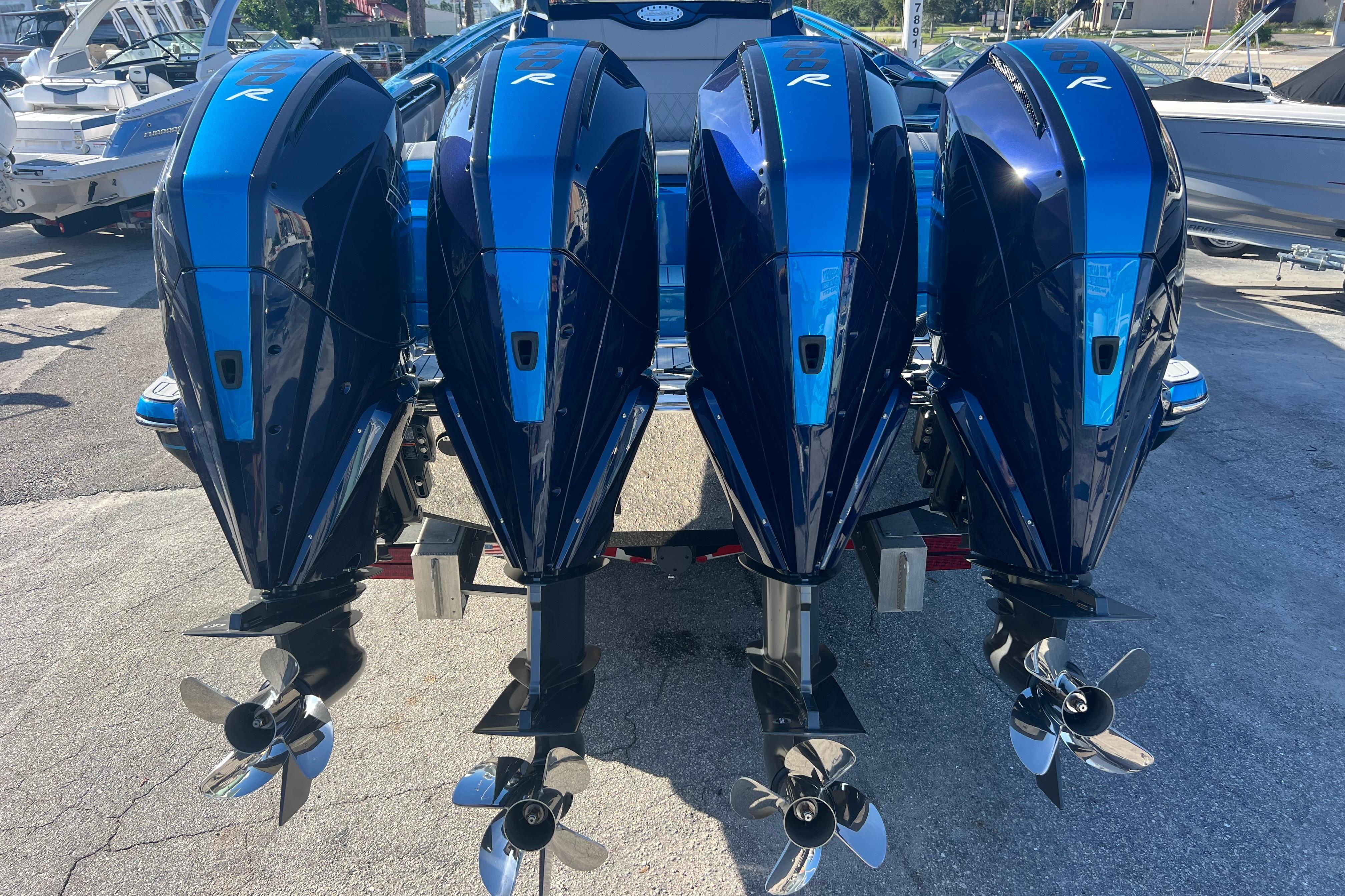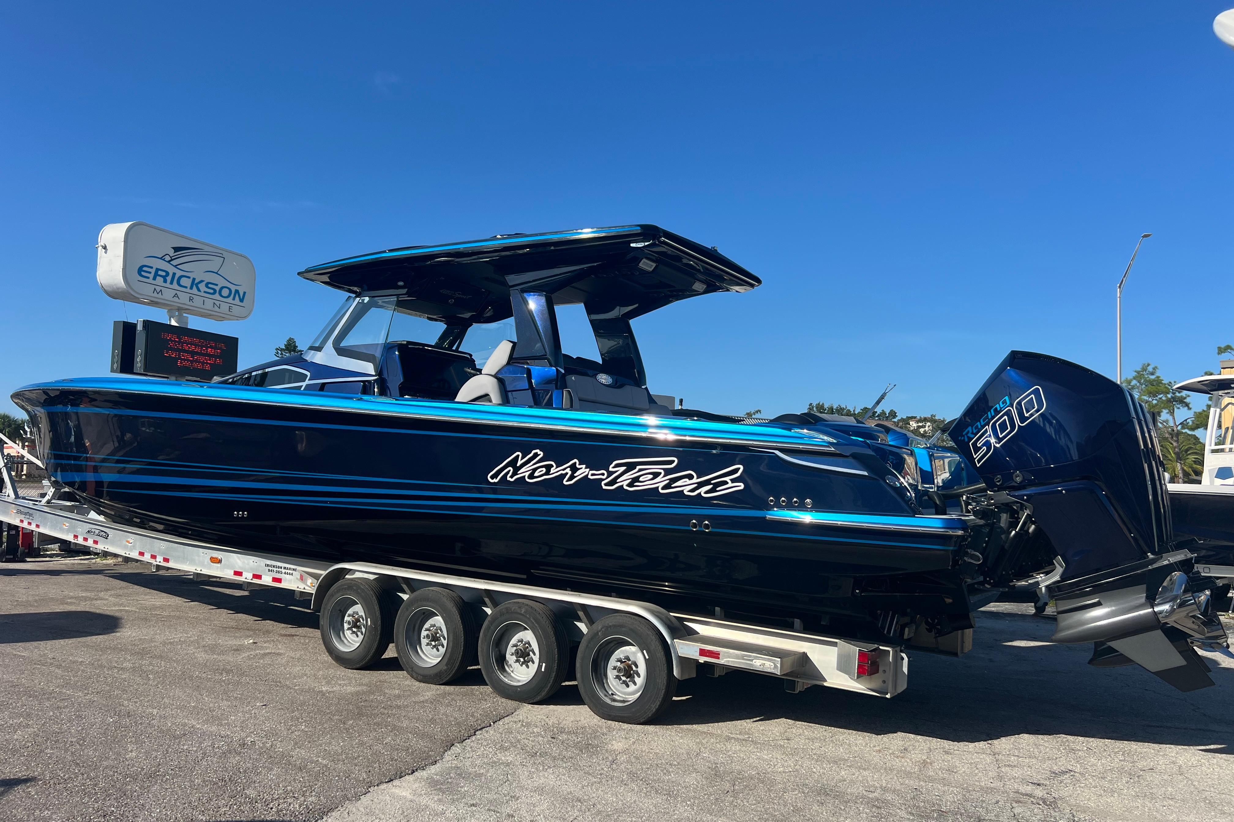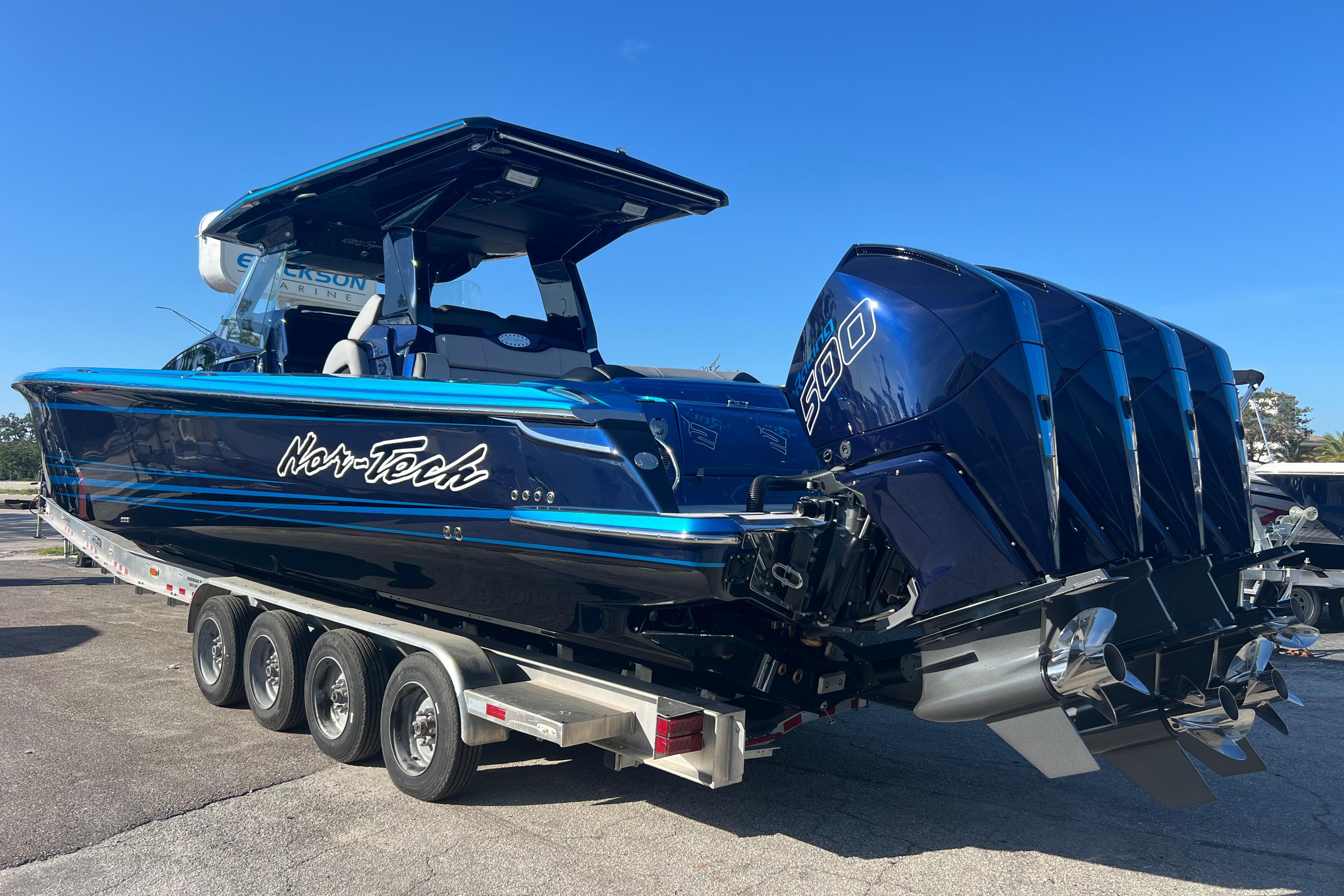 This Nor-Tech 450 Sport Center Console is here at the dealership right now and it is absolutely beautiful! The boat has a Sea Keeper 6 Gyro Stabilizer in it and is powered by Quad 500 HP Mercury Racing Engines. The boat has two Garmin 9622's flush mounted in the dash, Auto Pilot, FLIR Night Vision, Radar, VHF Radio, XM Weather & Radio, and 1KW Transducer. It has the Upgraded Premium Stereo System and the Sure Shade - Power Retractable. The cabin is Air Conditioned and has an enclosed Head & Shower. It has large windows that give you a very open feel inside. The seating in the rear of the boat is very large and comfortable. There is a Northern Lights Generator - Diesel, which is in an easily accessible compartment under the rear seat. The bow has the Electric Table and a Bow Thruster. There is Sea Deck flooring throughout the boat. Custom Painted Graphics, Paint console, Helm Seat, & Interior walls. The engines are hooked up to a Reverso Flush System making it very easy to flush the engines. Other options include, Bar w/ Cold Plate, Marine Guardian Security System, Black Oak LED Light Bar, & Underwater Lights color changing.