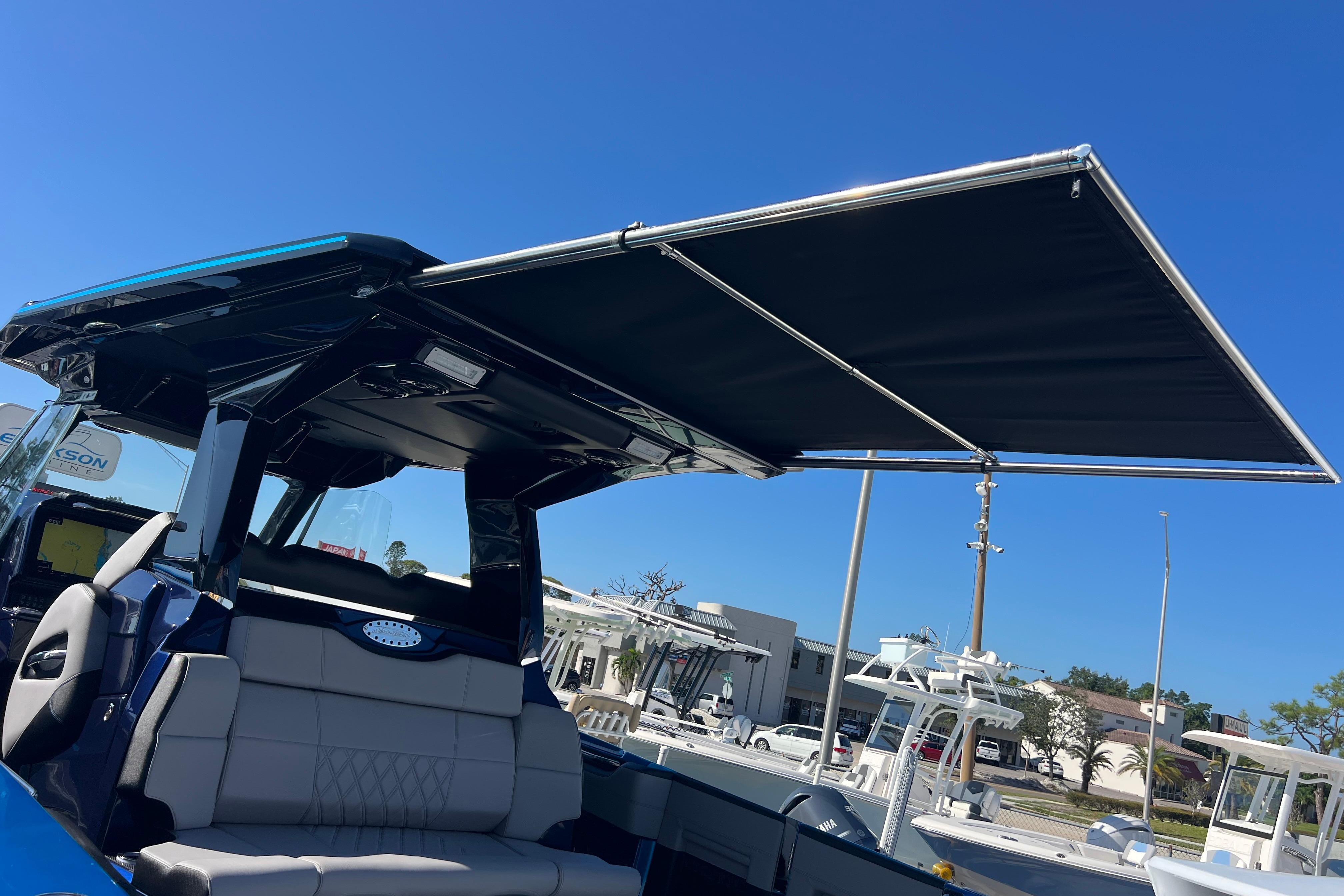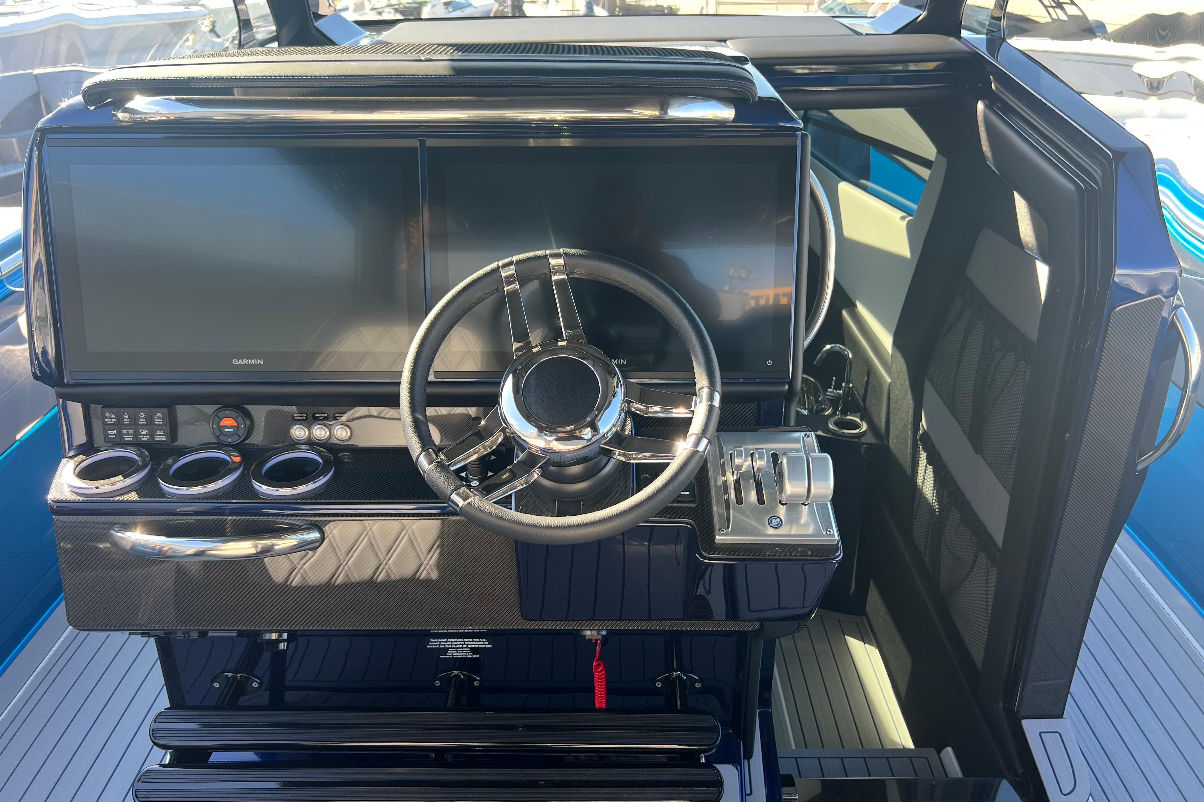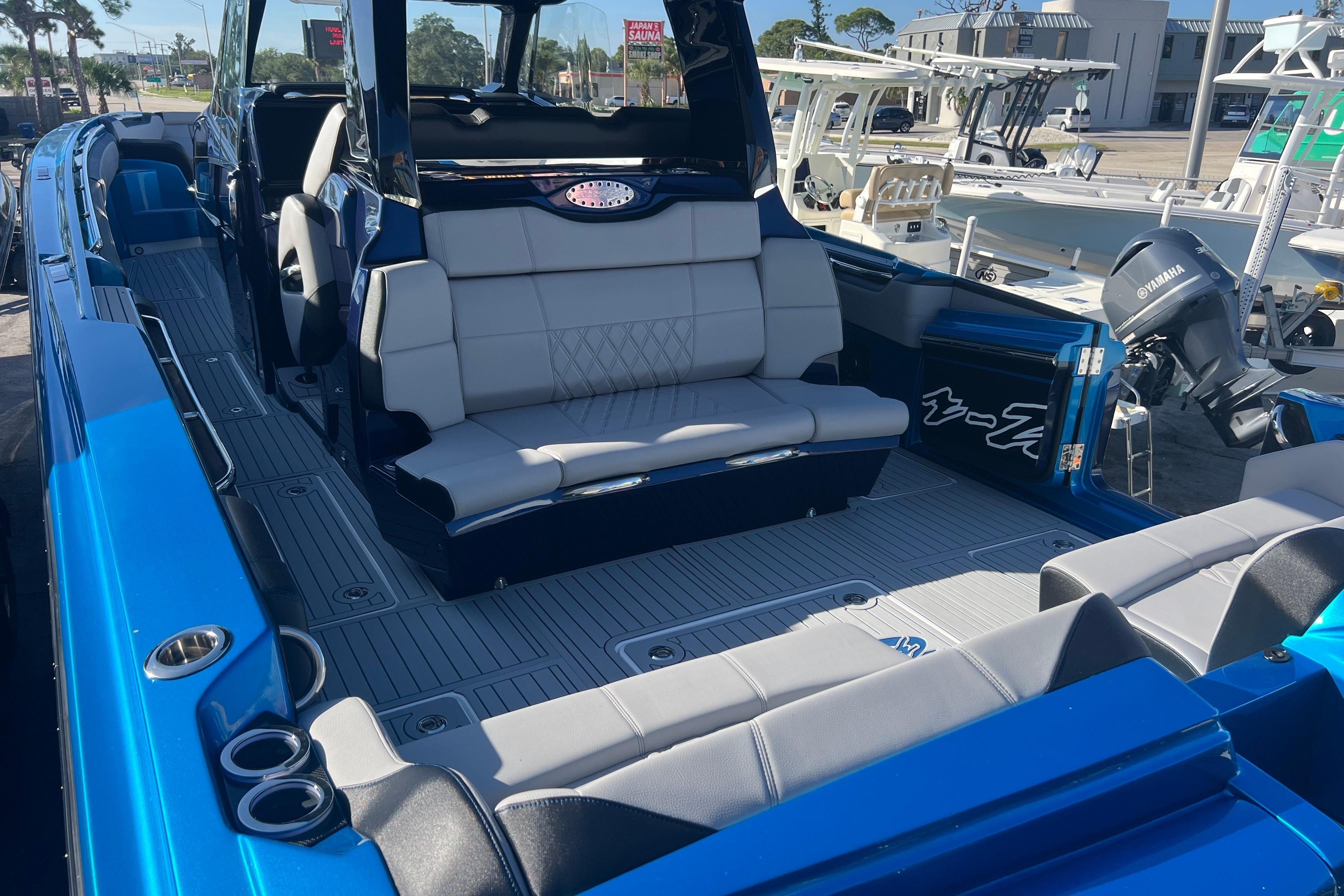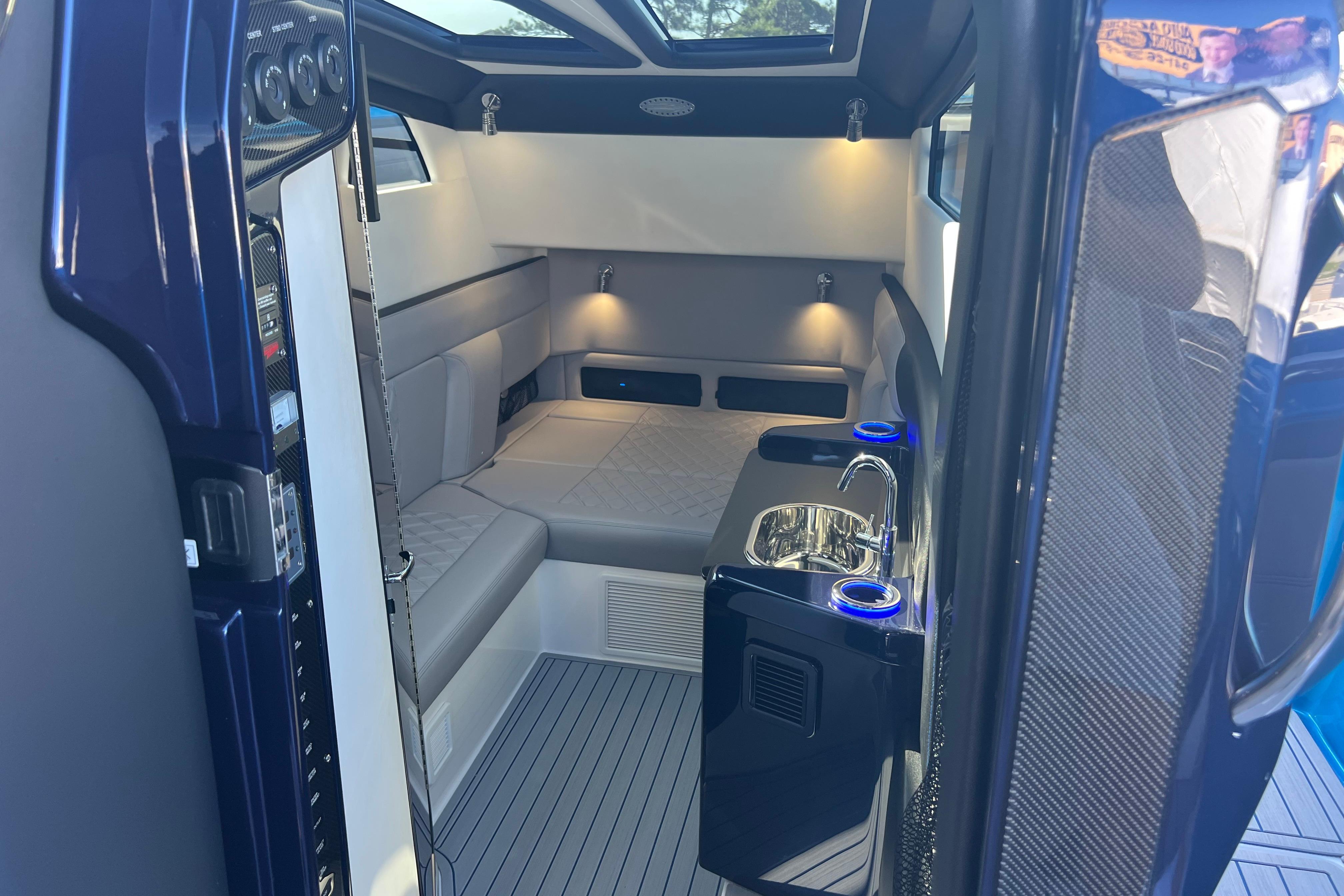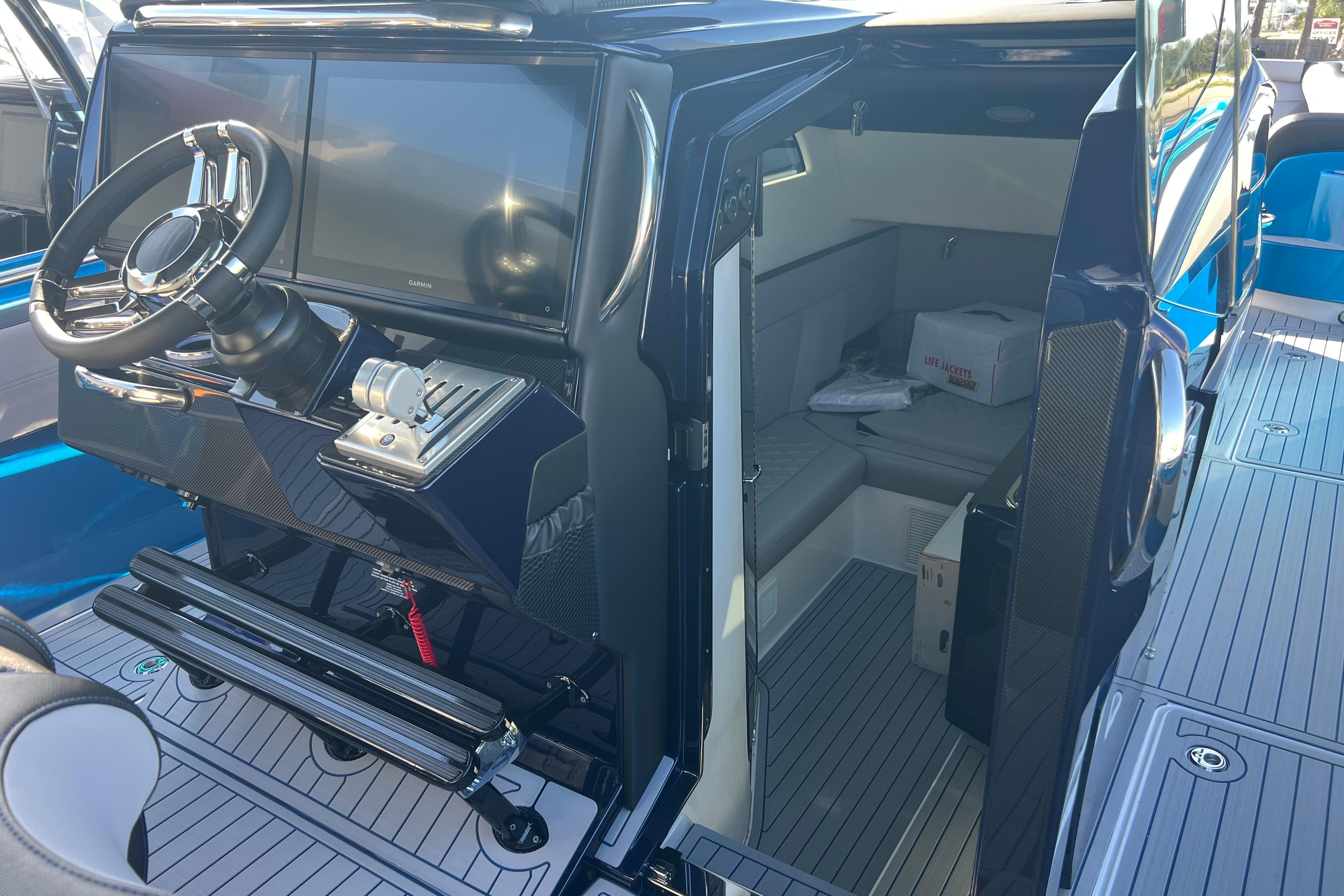 This Nor-Tech 450 Sport Center Console is here at the dealership right now and it is absolutely beautiful! The boat has a Sea Keeper 6 Gyro Stabilizer in it and is powered by Quad 500 HP Mercury Racing Engines. The boat has two Garmin 9622's flush mounted in the dash, Auto Pilot, FLIR Night Vision, Radar, VHF Radio, XM Weather & Radio, and 1KW Transducer. It has the Upgraded Premium Stereo System and the Sure Shade - Power Retractable. The cabin is Air Conditioned and has an enclosed Head & Shower. It has large windows that give you a very open feel inside. The seating in the rear of the boat is very large and comfortable. There is a Northern Lights Generator - Diesel, which is in an easily accessible compartment under the rear seat. The bow has the Electric Table and a Bow Thruster. There is Sea Deck flooring throughout the boat. Custom Painted Graphics, Paint console, Helm Seat, & Interior walls. The engines are hooked up to a Reverso Flush System making it very easy to flush the engines. Other options include, Bar w/ Cold Plate, Marine Guardian Security System, Black Oak LED Light Bar, & Underwater Lights color changing.