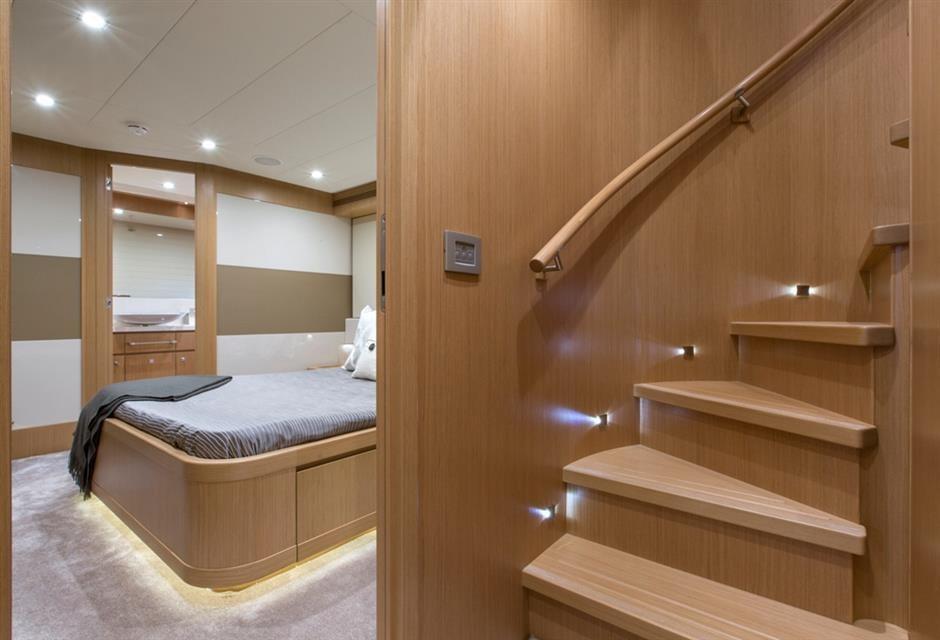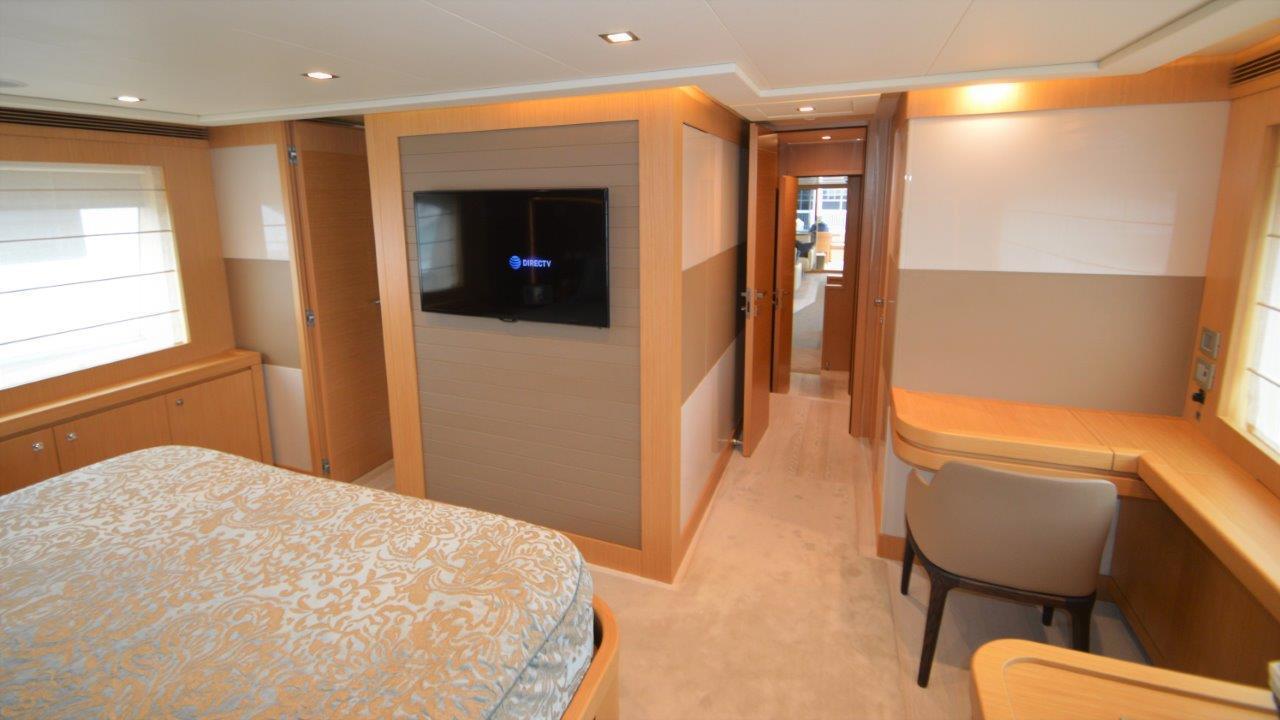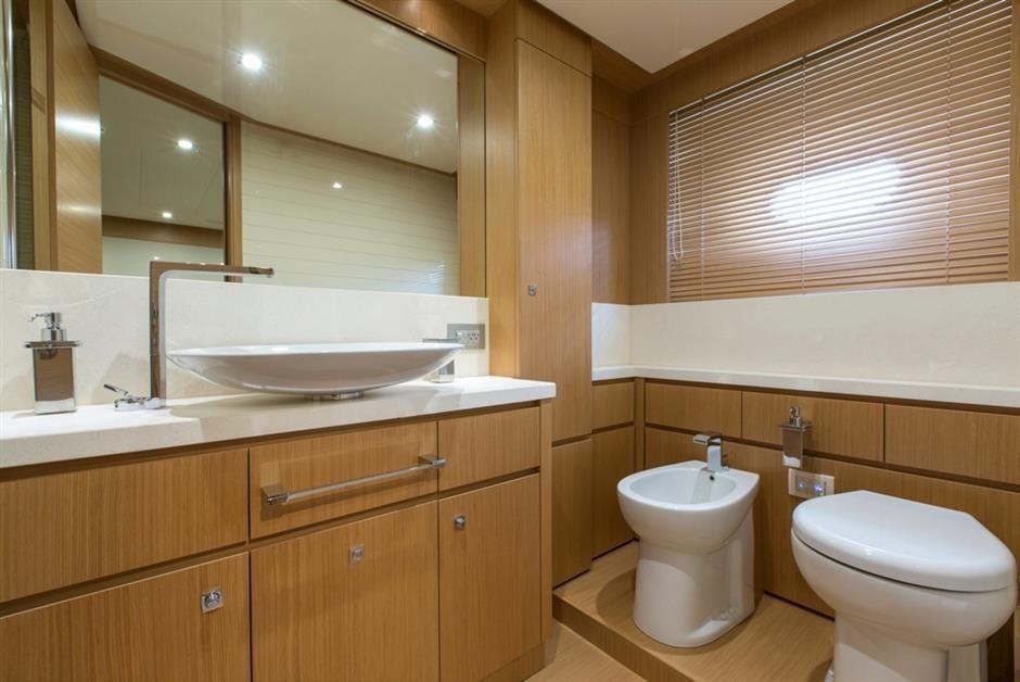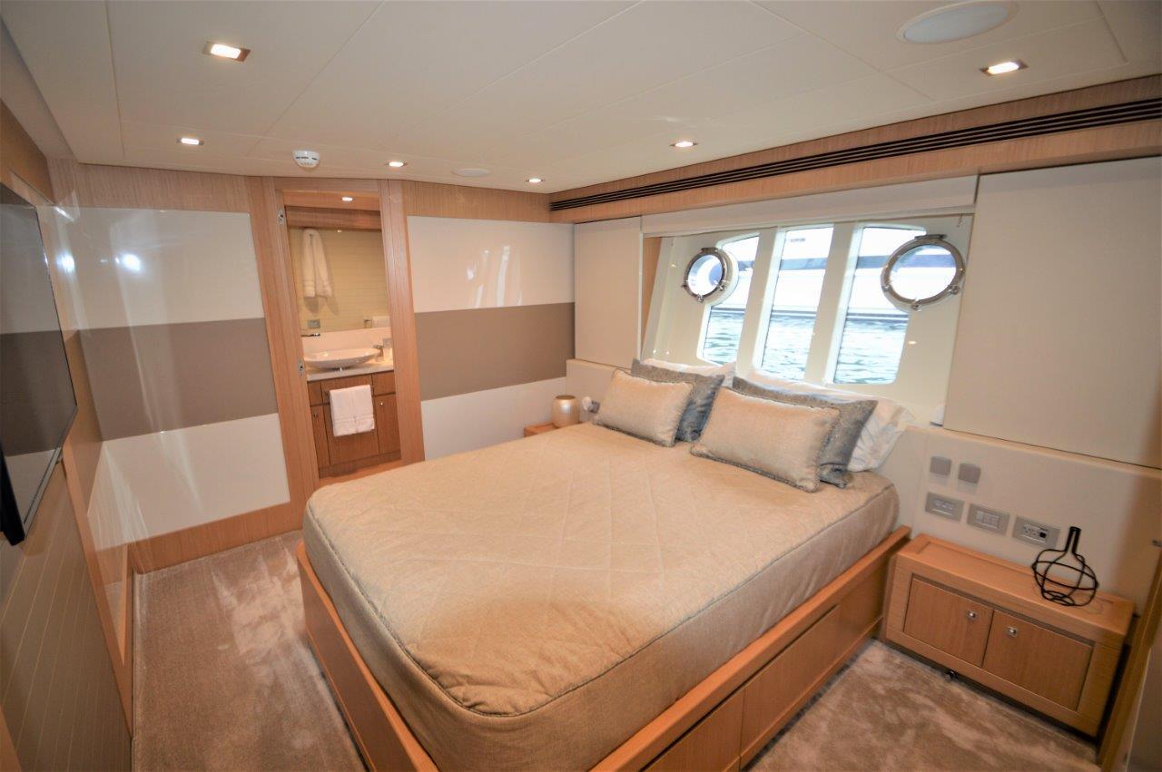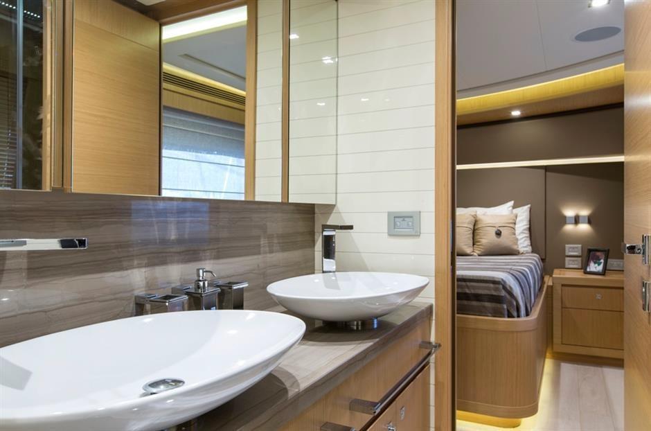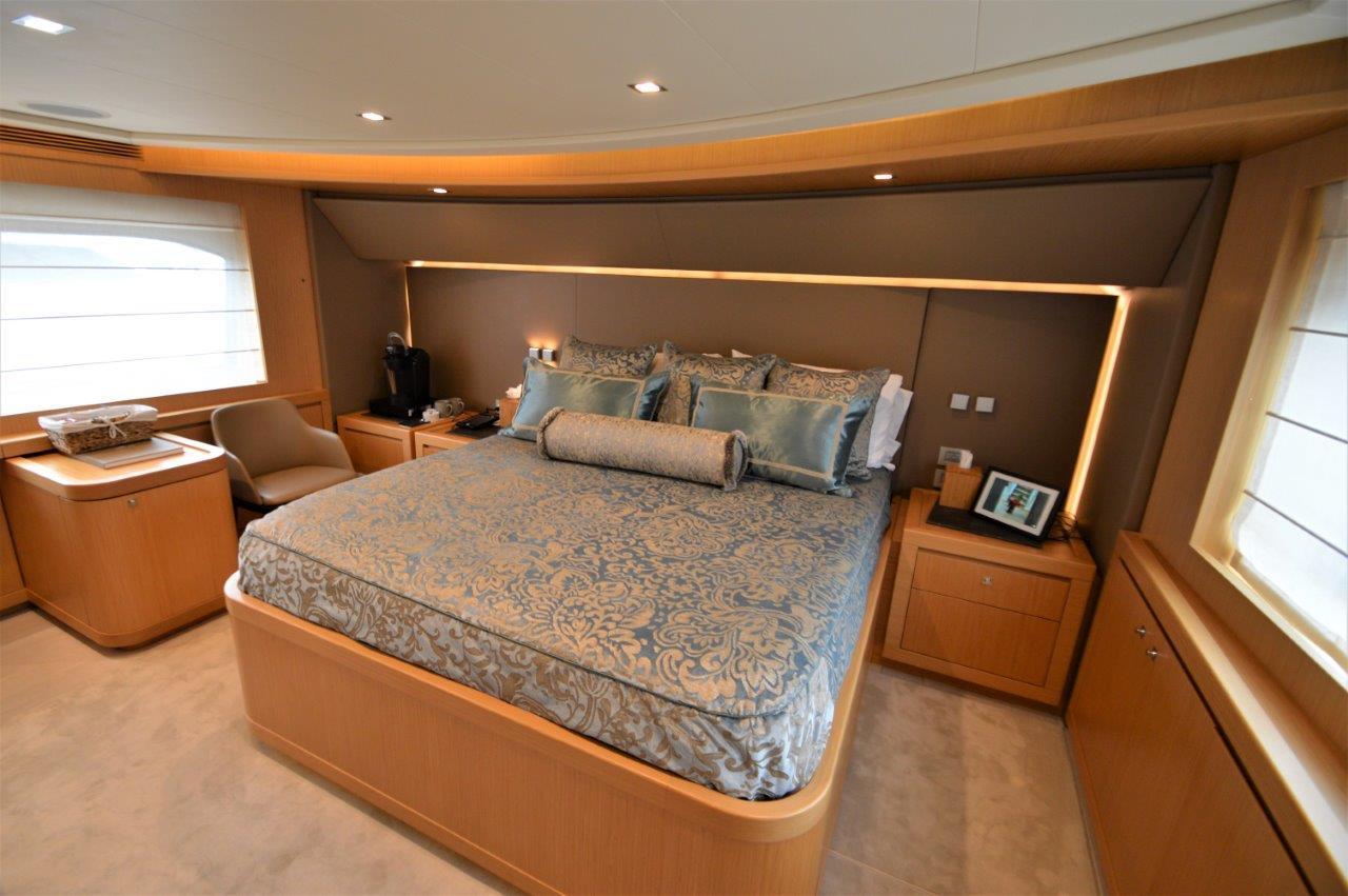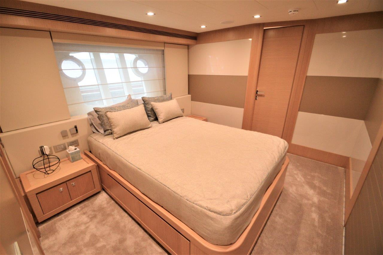The 86' Ferretti Custom Line Navetta offers a well-appointed on-deck master stateroom with an island berth. Storage drawers and indirect lighting can be found in the bed frame. Port and starboard nightstands, both with built-in reading lights. A full walk-in closet is located in the port companionway. The master head has marble counters with two custom vessel sinks, a shower stall, and a separate head/bidet.