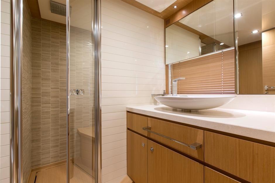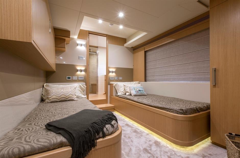 Two (2) twin berths with Pullman inboard are located port and starboard forward. Each one has an ensuite shower and head.