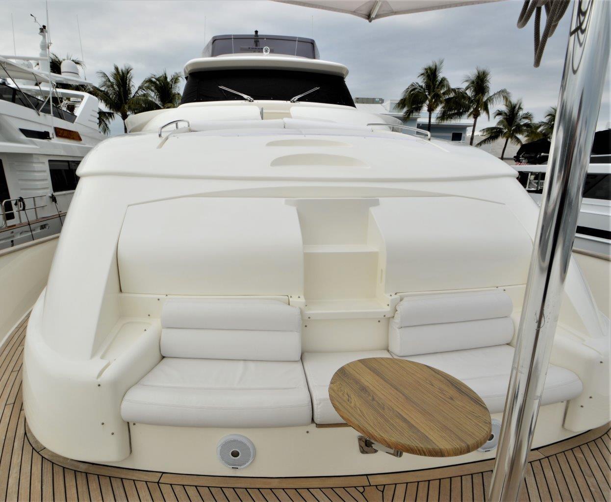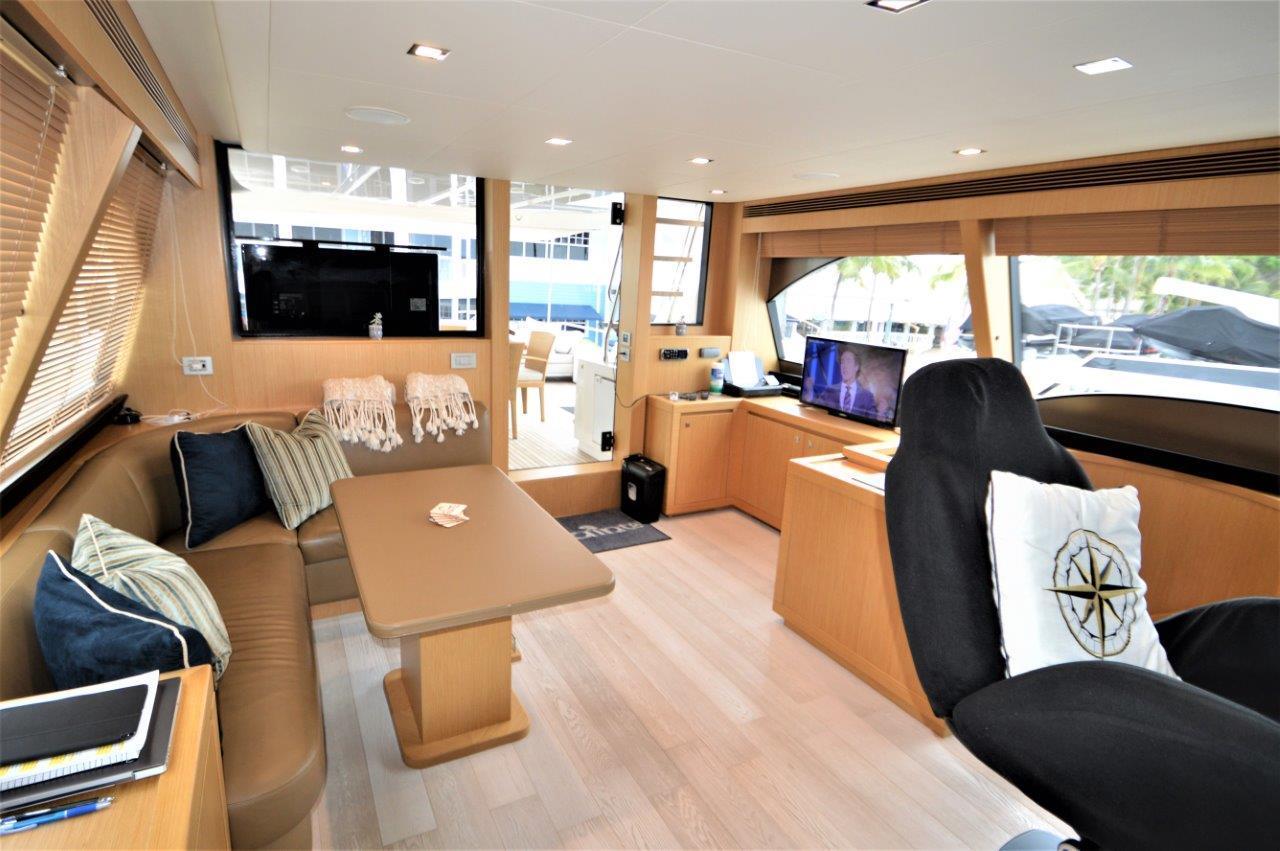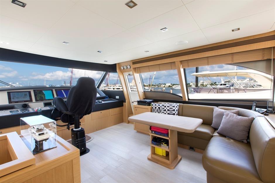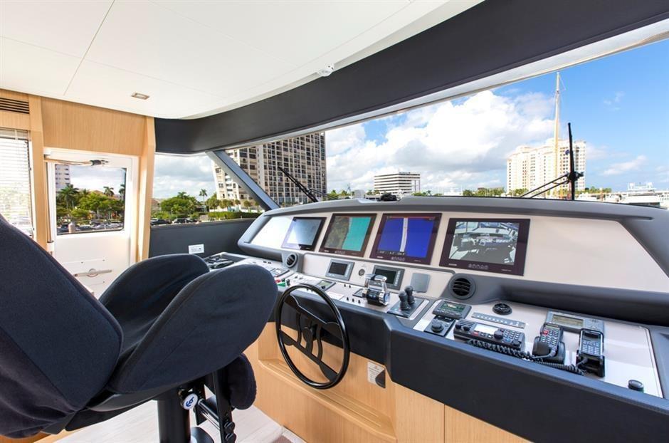 The pilothouse can be accessed by stairs from the main companionway or aft from the upper lounge deck. The pilothouse is fully equipped with electronics, including Furuno NavPilot, Furuno NavNet 3D, flat screen monitors, FLIR controls, and bow and stern thruster controls.