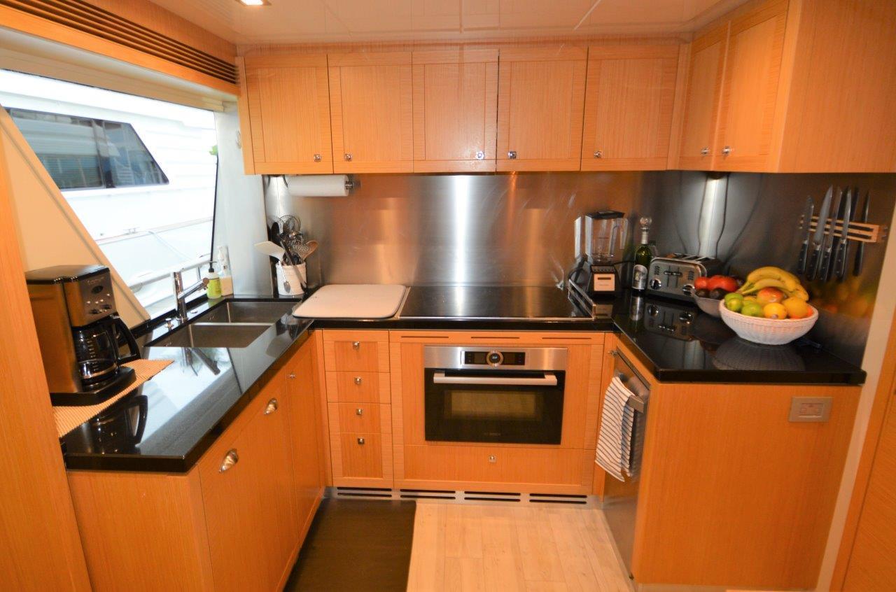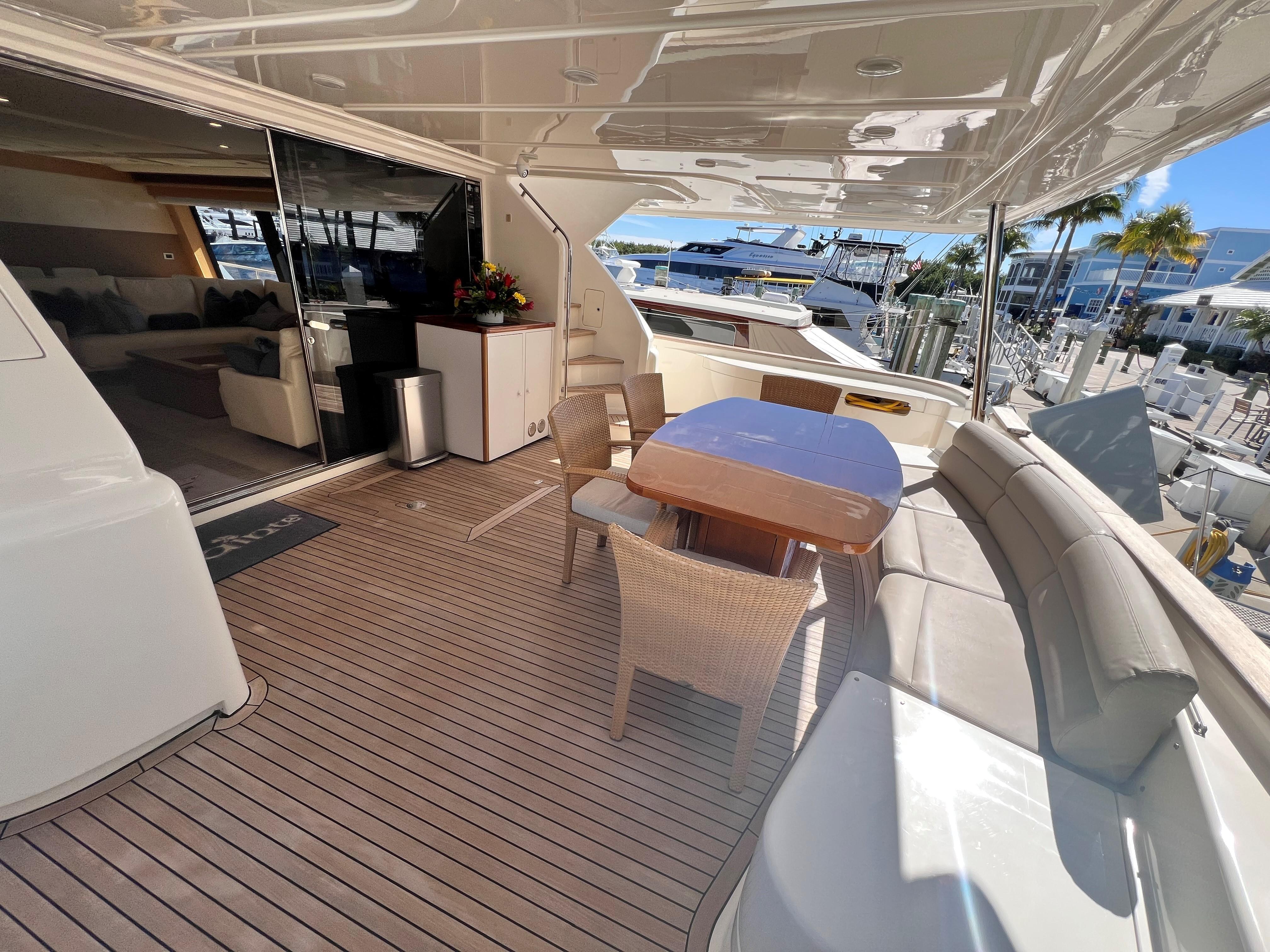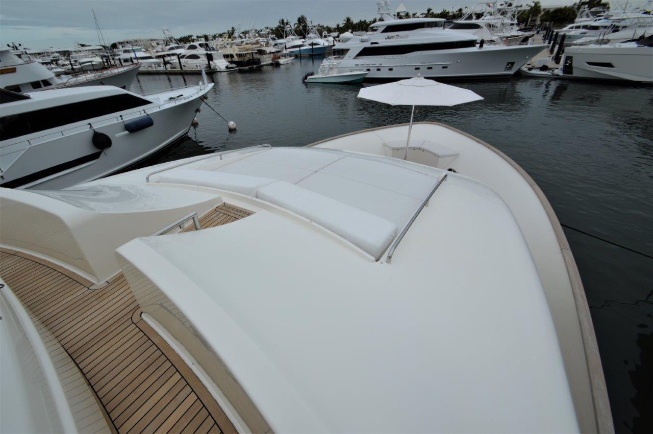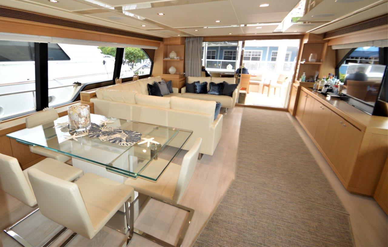 The pilothouse can be accessed by stairs from the main companionway or aft from the upper lounge deck. The pilothouse is fully equipped with electronics, including Furuno NavPilot, Furuno NavNet 3D, flat screen monitors, FLIR controls, and bow and stern thruster controls.
