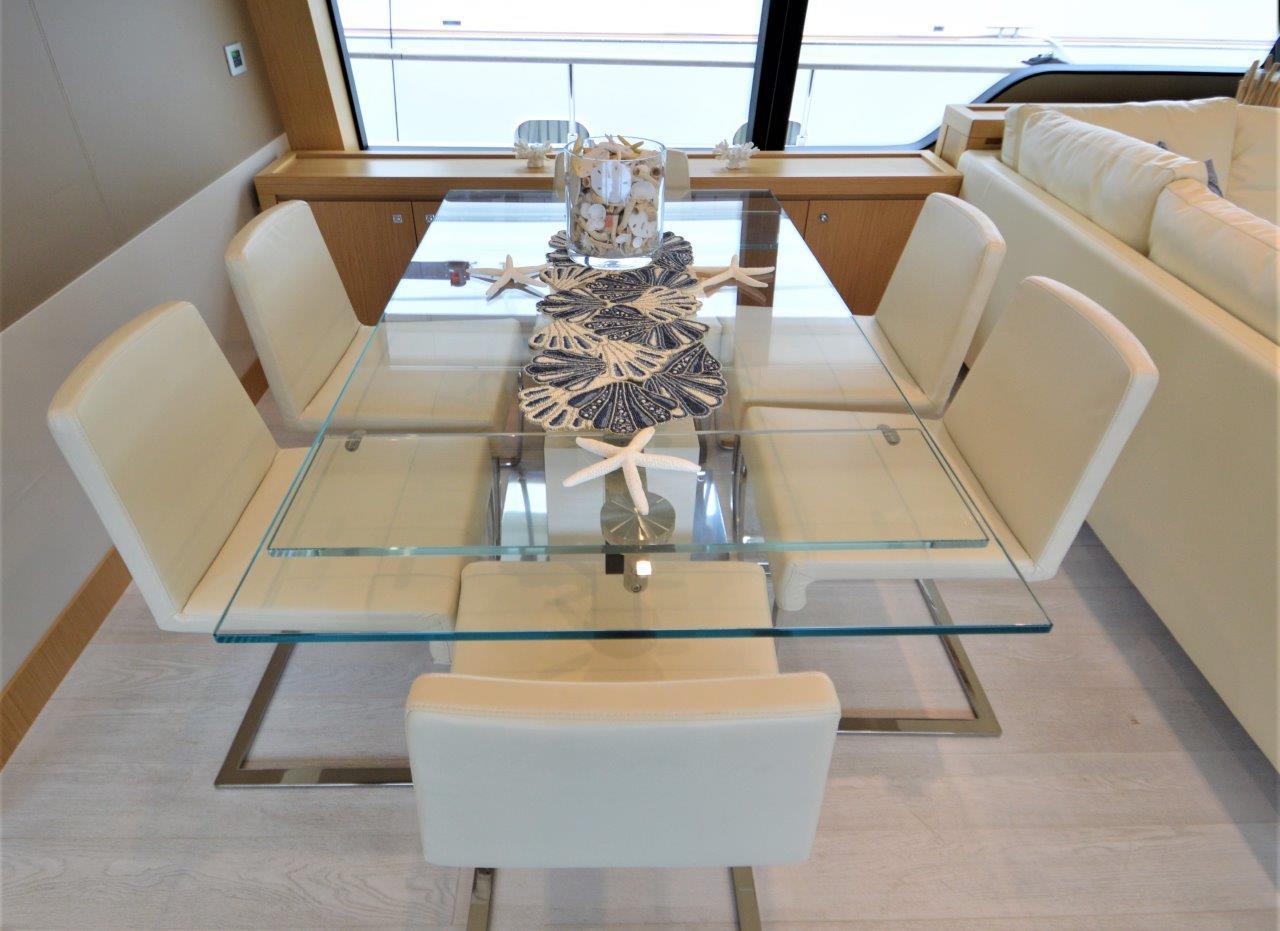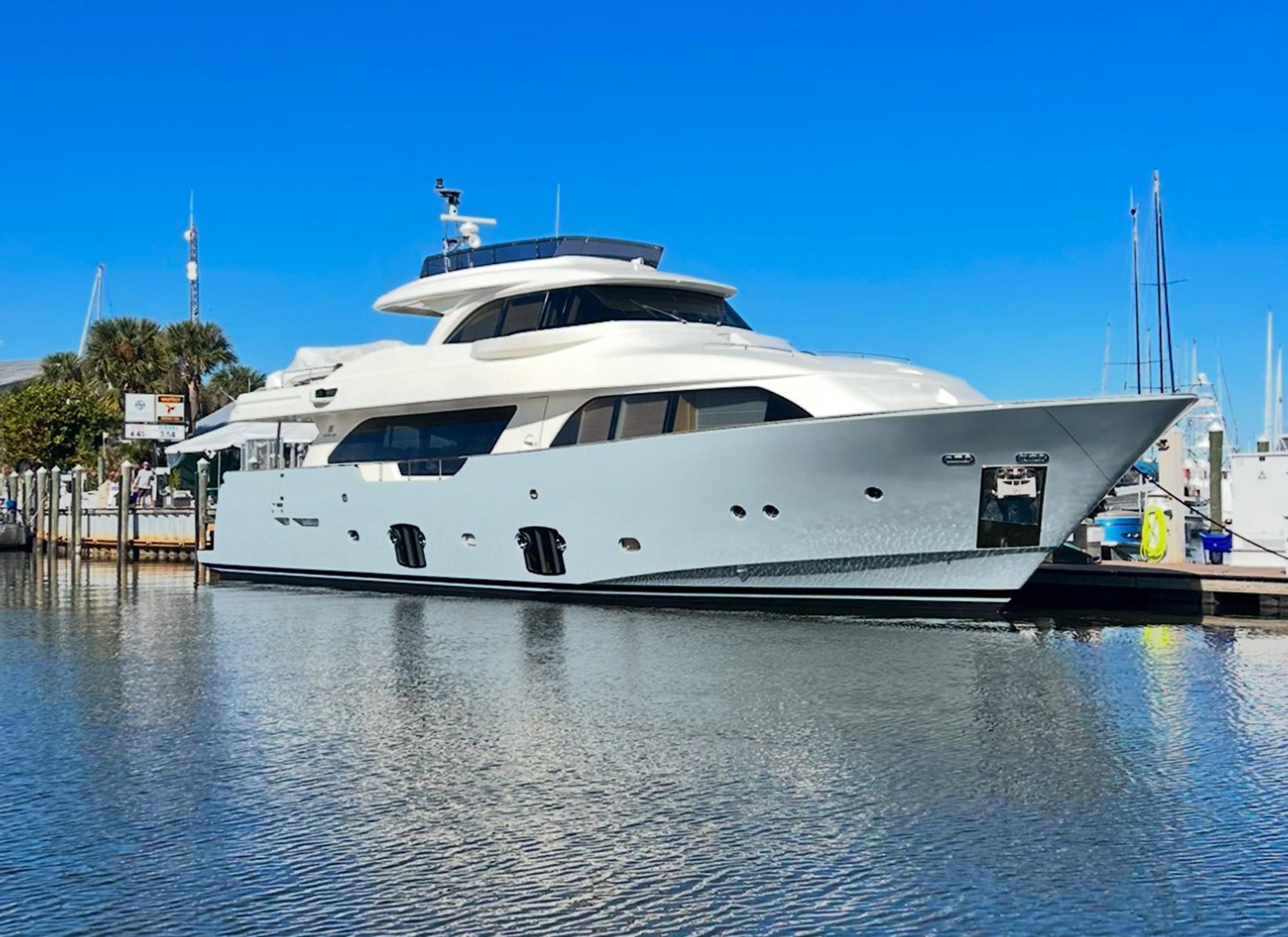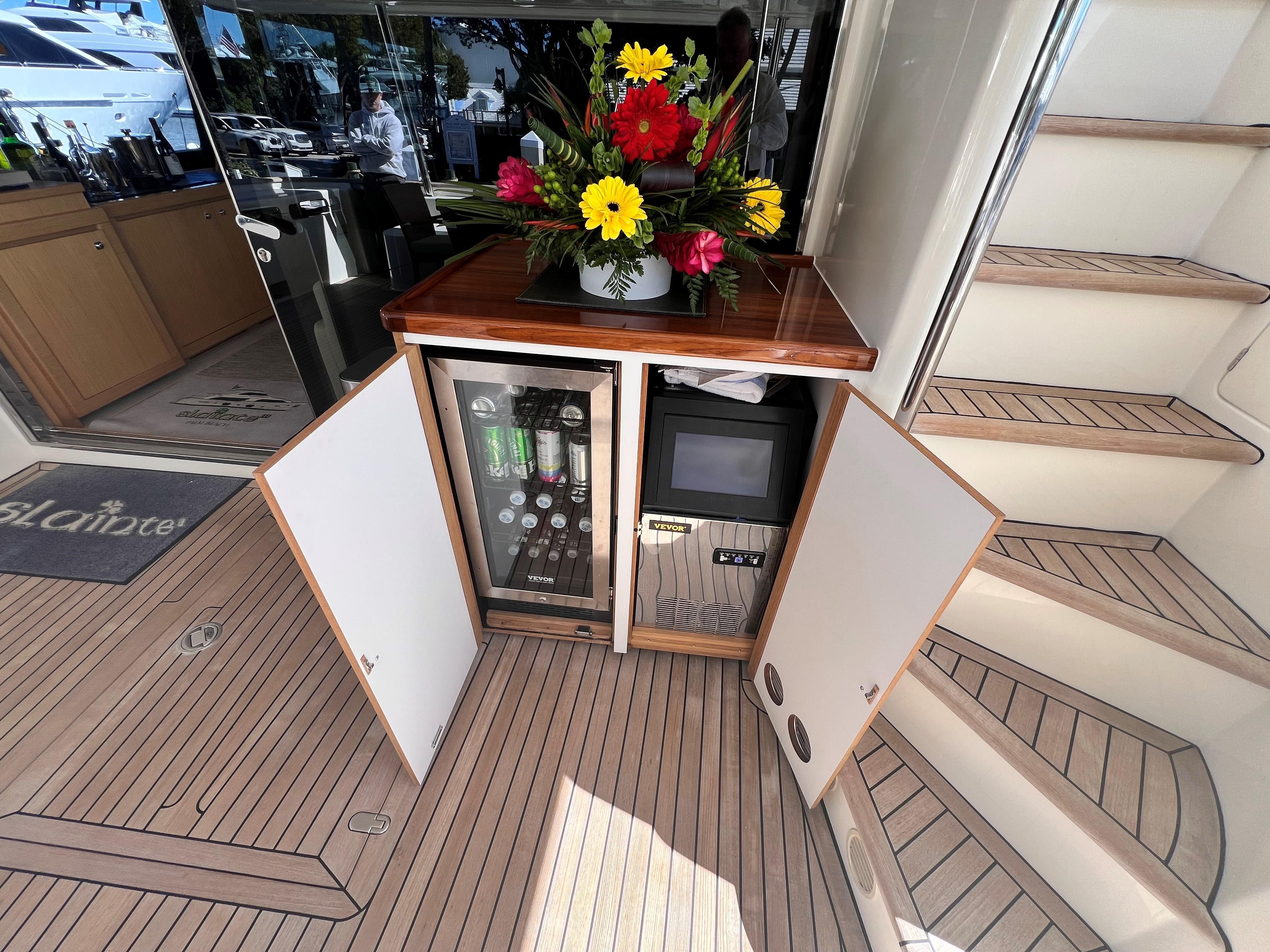 The 86' Ferretti Custom Line Navetta features a hydraulically actuated aft transom door with teak overlay. When this door is lowered it converts into the beach access with a swim ladder. There is also a fresh water outlet located in the port stairs which can be used to shower before walking on the aft deck. Custom cabinetry for storage built in 2020, also added was a 2nd washer/dryer and freezer.