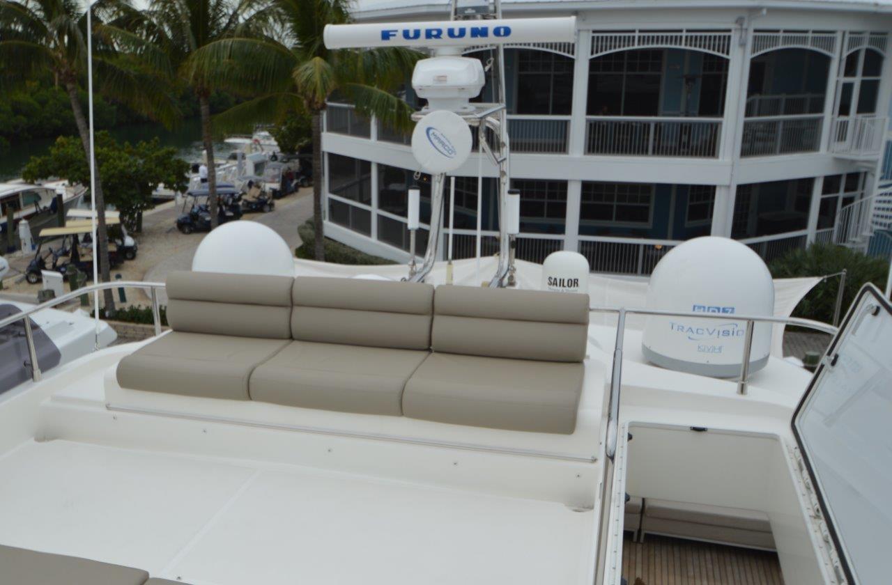 The upper sun lounge is accessed via stairs on the lounge deck. It has a new upholstered sun lounge forward and a forward facing seat aft. Upholstered 2019. There are speakers located port and starboard with audio controls. The mast is accessed via the sun lounge and is equipped with TracVision dome, Furuno GPS domes, FLIR, TV Antenna, VHF antennas, and Radar array.