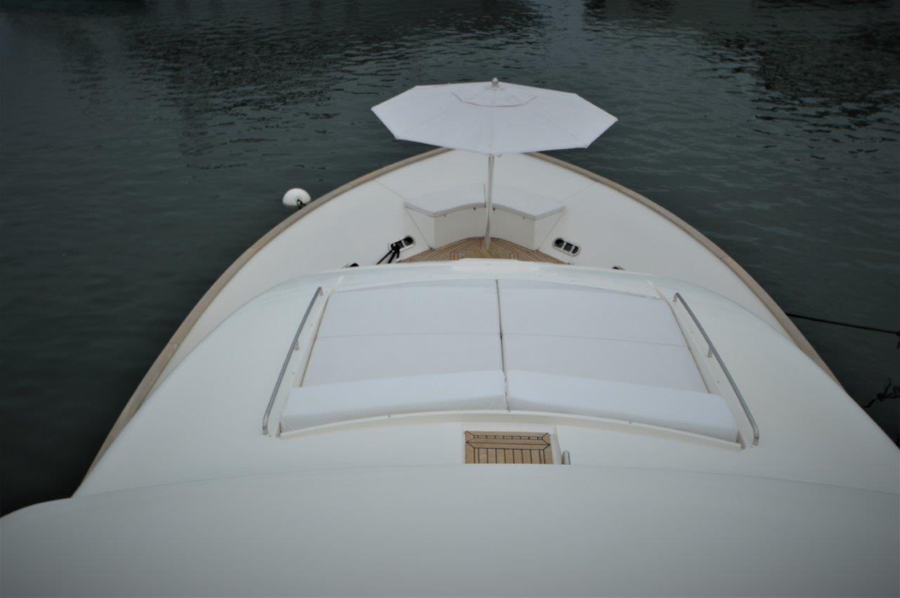 When walking aft from the pilothouse, guest have access to the lounge deck and walk around teak decks lead you forward to the Portuguese bridge and sun pad. The lounge deck features an electric BBQ grill, refrigerator and 46” Samsung TV.