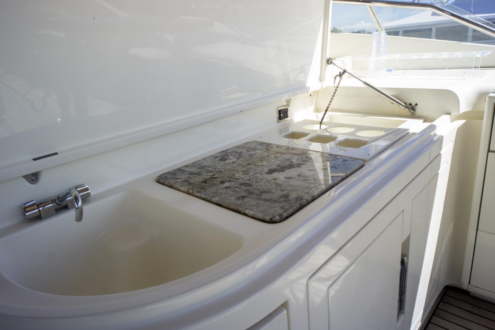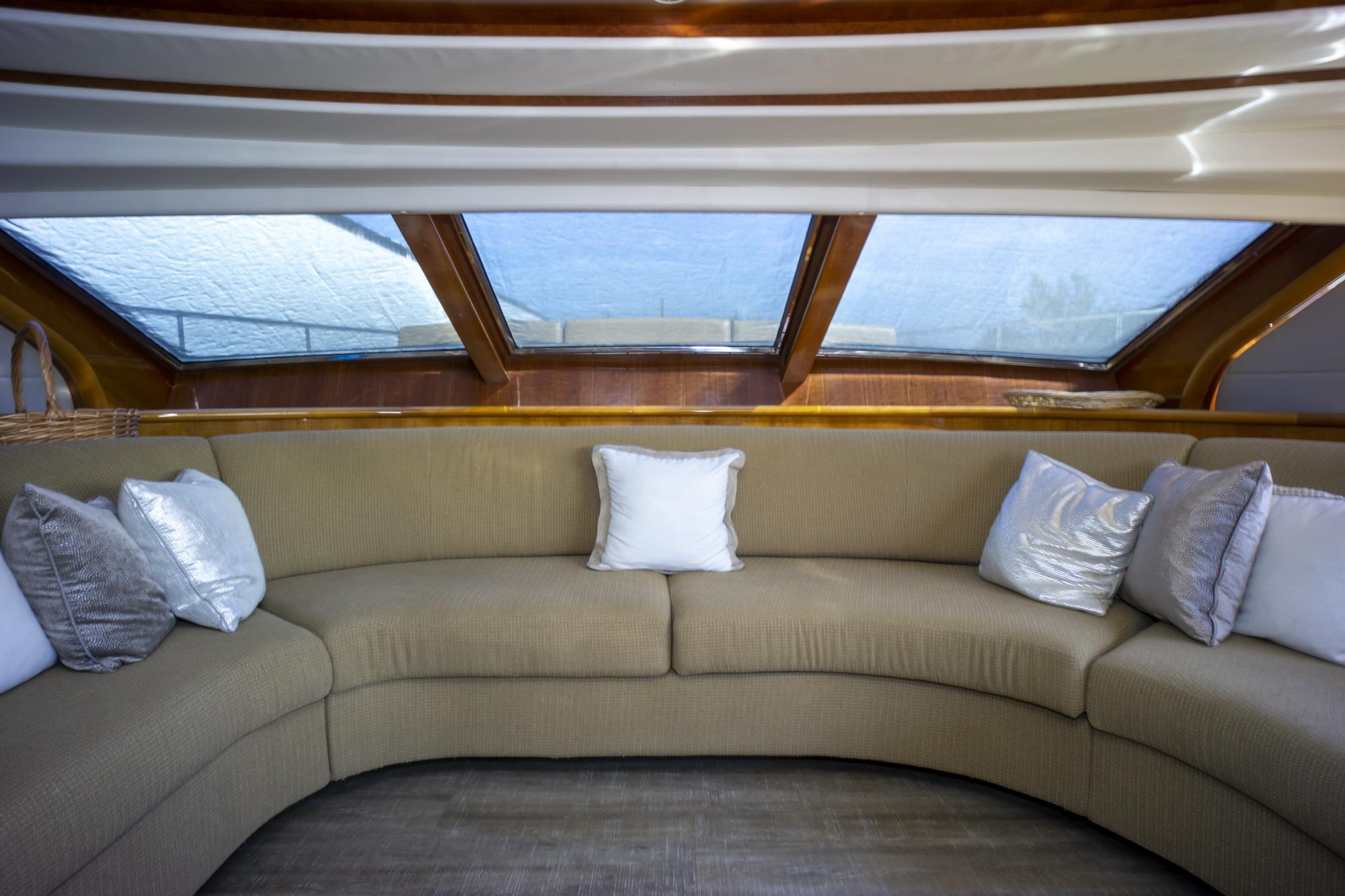 The main aft deck welcomes guests with a generous al fresco dining area, teak table, and built-in seating—perfect for relaxed lunches and evening cocktails by the sea. Wide walkaround side decks ensure safe and easy access forward, while stainless steel railings and deck hardware add to her luxurious nautical identity.