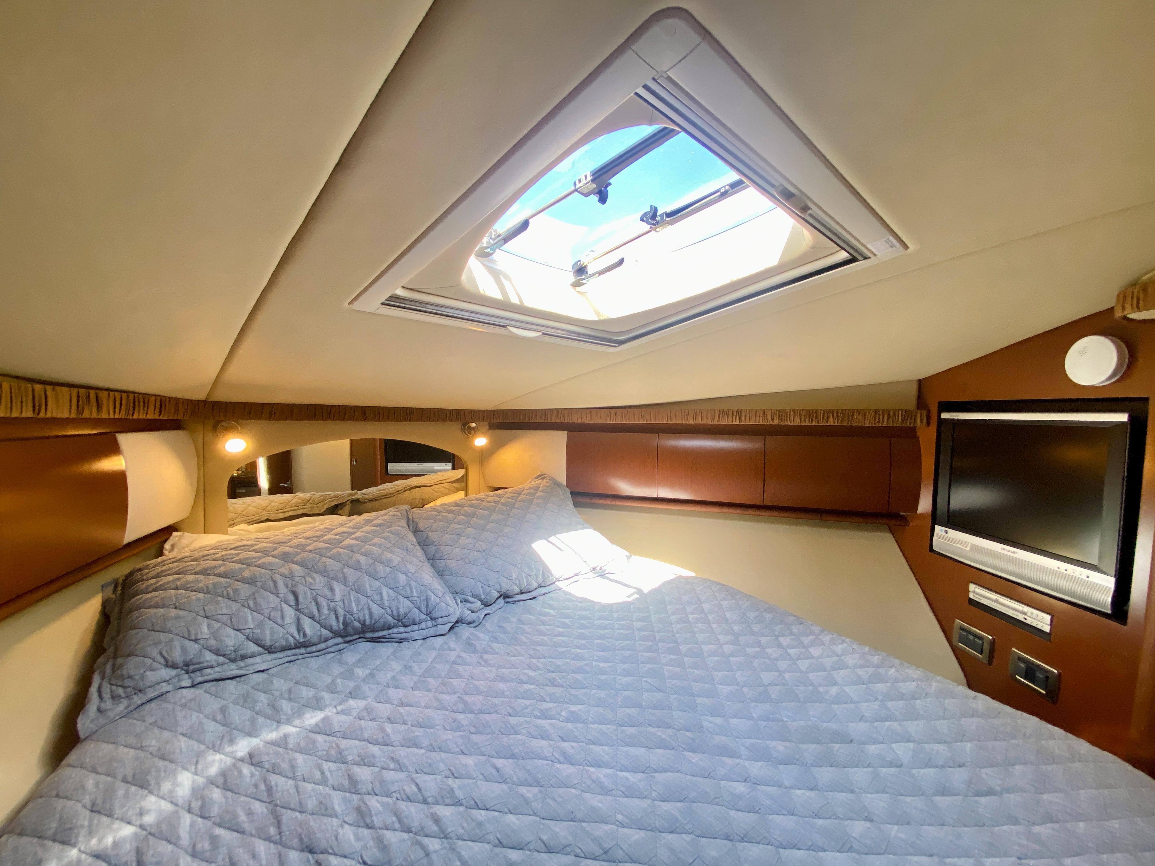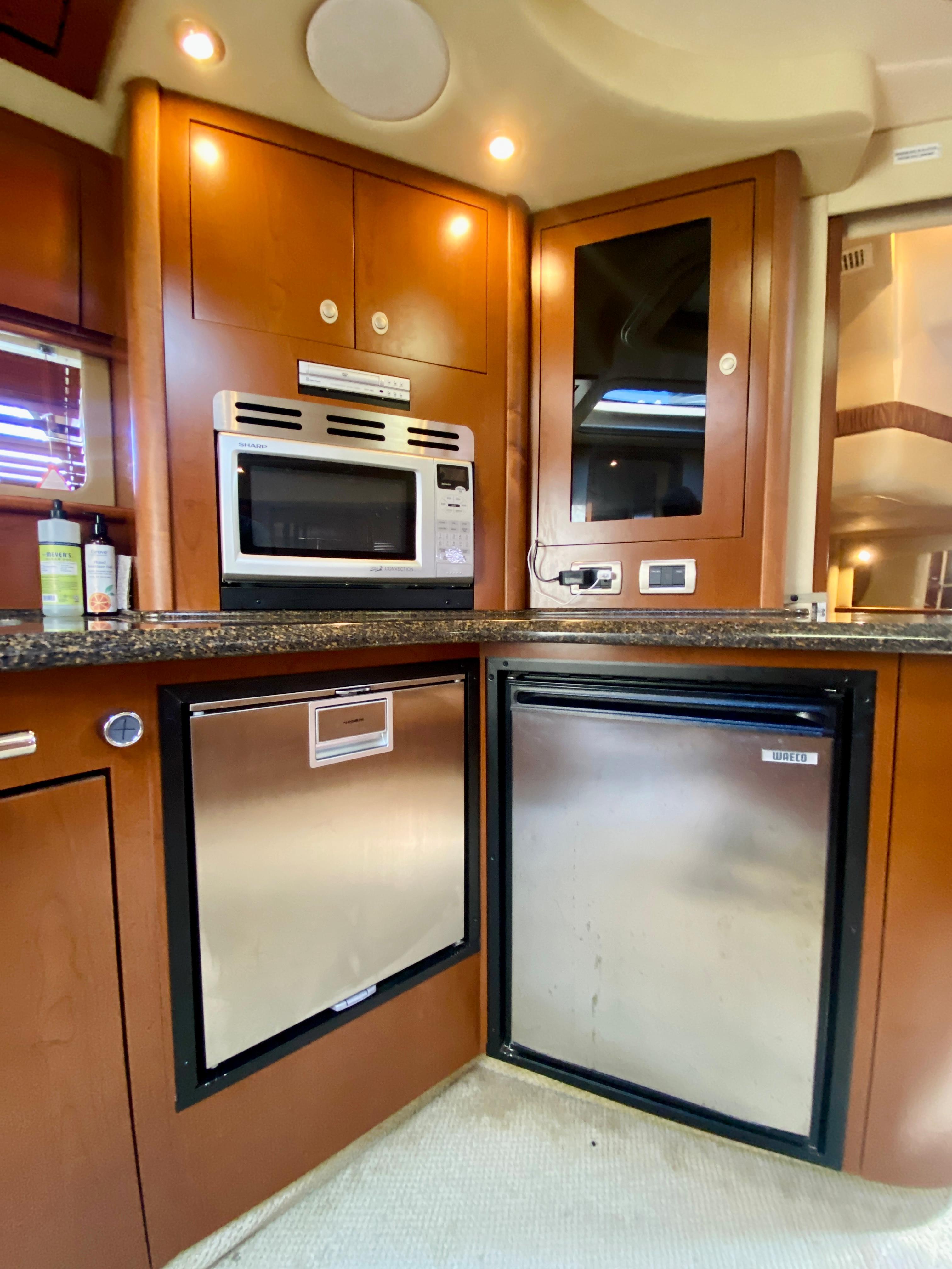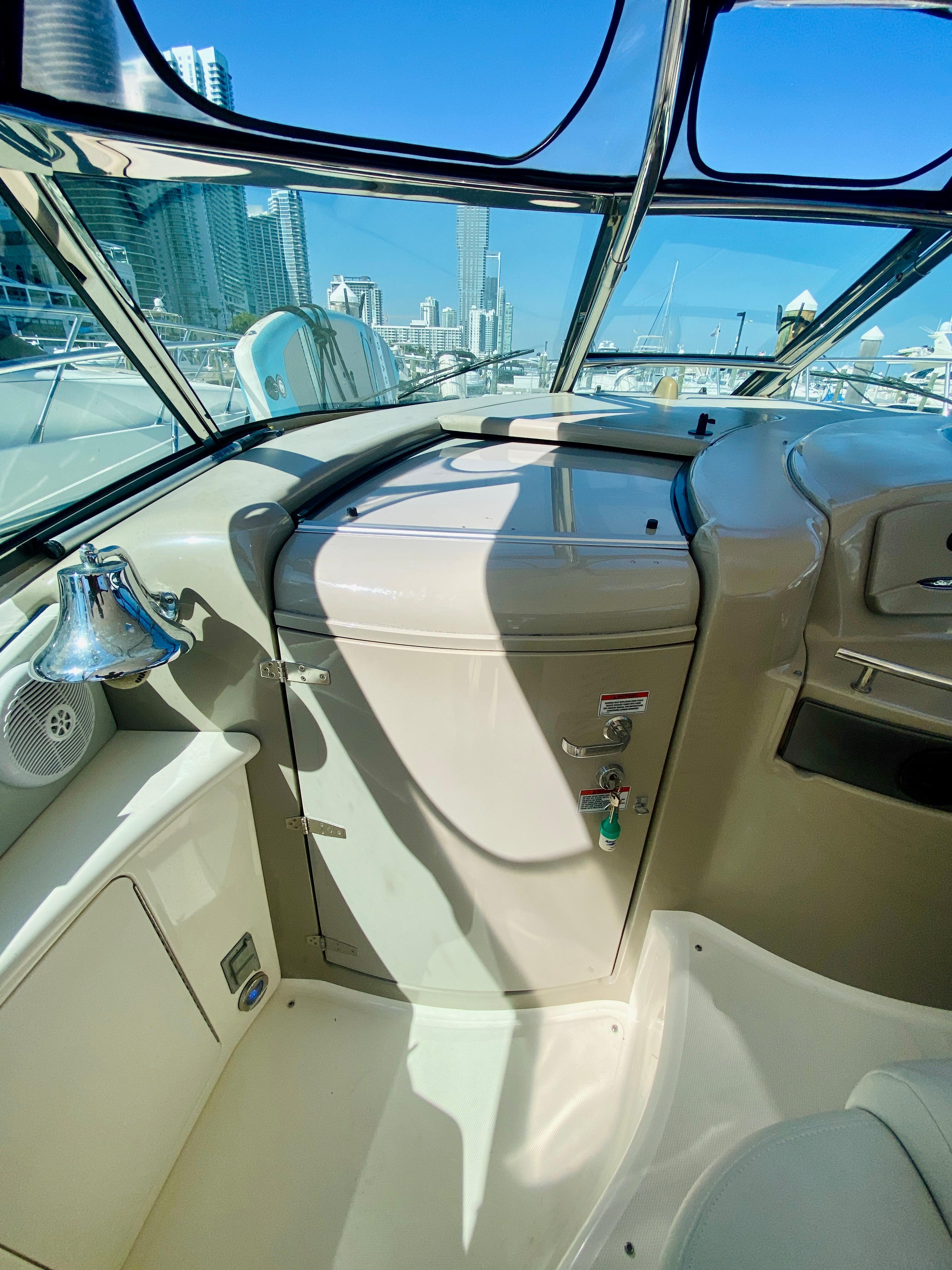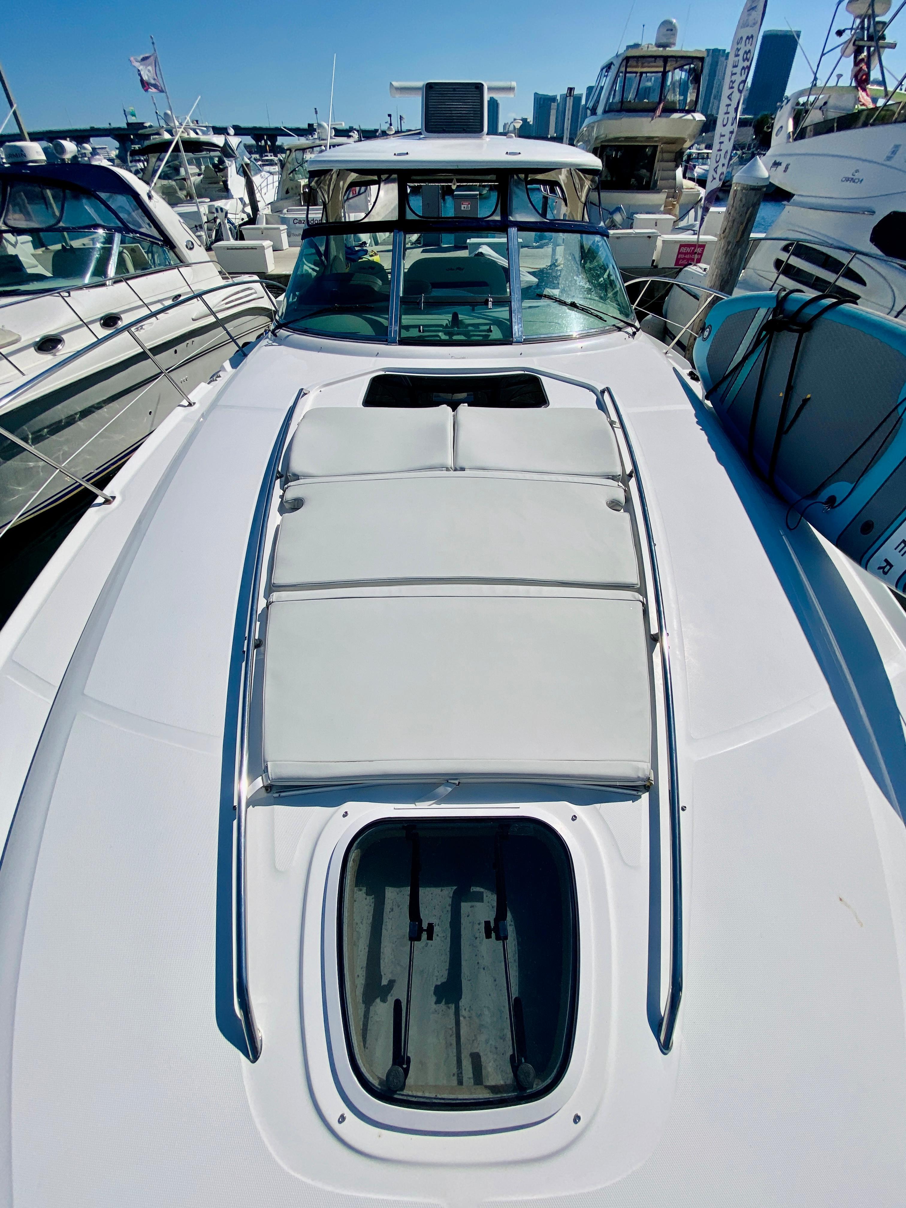 Sleek styling, a large, comfortable cockpit and a luxurious interior that sleeps plenty are just the right formula for endless fun in the 44 Sundancer. A wealth of instrumentation and information is at the captain's fingertips, and twin 8.1 S Horizon MerCruiser gasoline V-drives will get you to most any destination with ease. The beautiful, yet efficient, galley includes a host of conveniences that will make each on-the-water excurision thoroughly enjoyable. Engine Notes