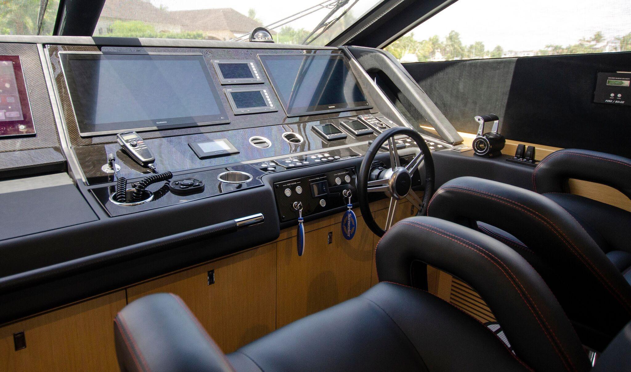 - Fly Bridge console w/Garmin Speed/depth display, Garmin autopilot repeater, 2 Garmin multifunctional Radar/Chartplotter/GPS display, Garmin VHF, Compass, Jabsco Searchlight