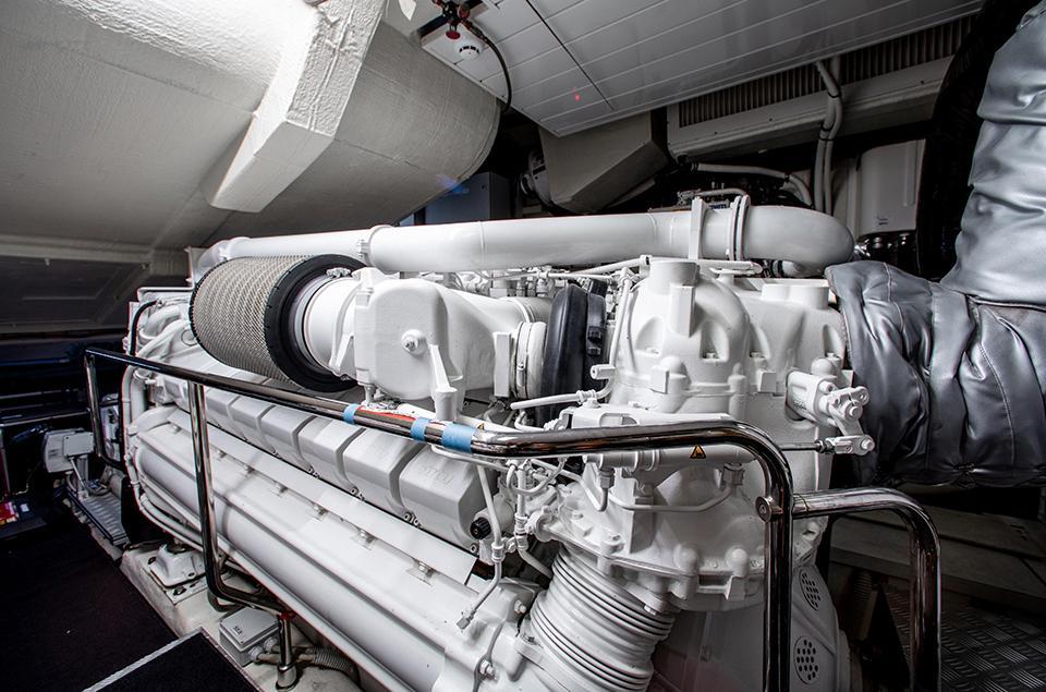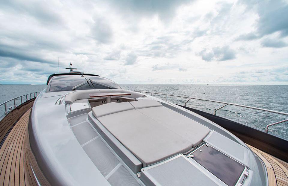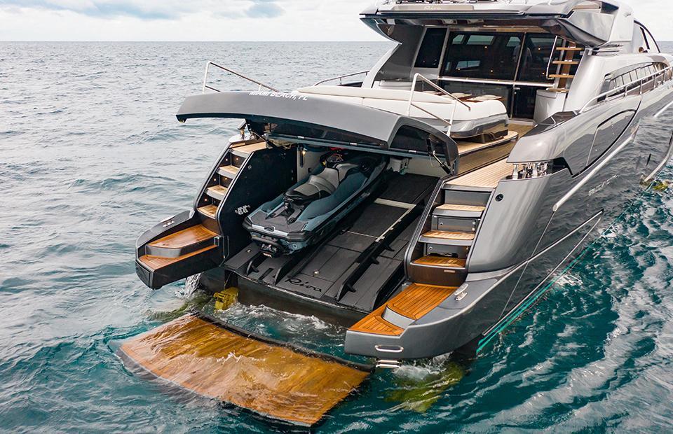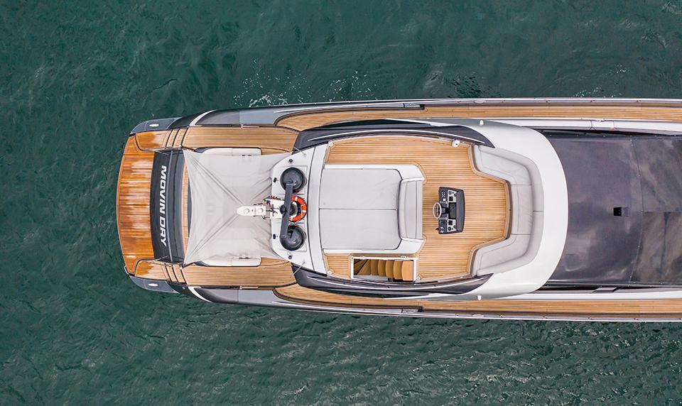 Movin Day immediately strikes the eye for its slender, streamlined profile, which is further highlighted by the color of the hull, a dark grey that has been named "London Grey". The same innovative color shade can also be found in some deck details and harmoniously contrasts the light grey ("Moon Grey") of the superstructure. Extensive changes increasing the guests' comfort and making the crew's work much easier can immediately be noticed in the aft area. The transom, which can be lowered completely into the water, offers a convenient platform to dive into the sea and get back onboard, besides making tender launching and hauling operations much easier, also thanks to the inclined base of the garage.