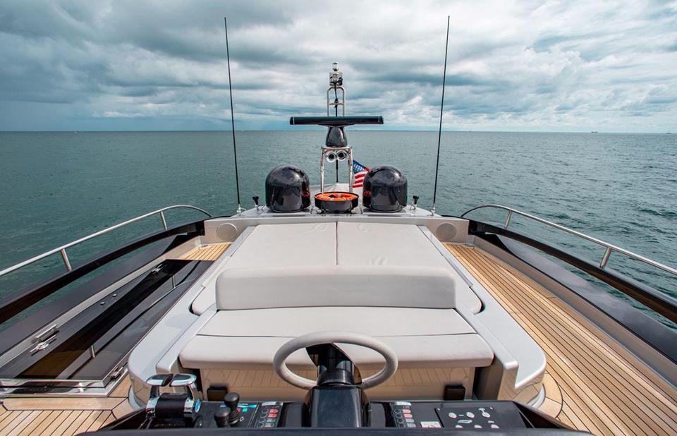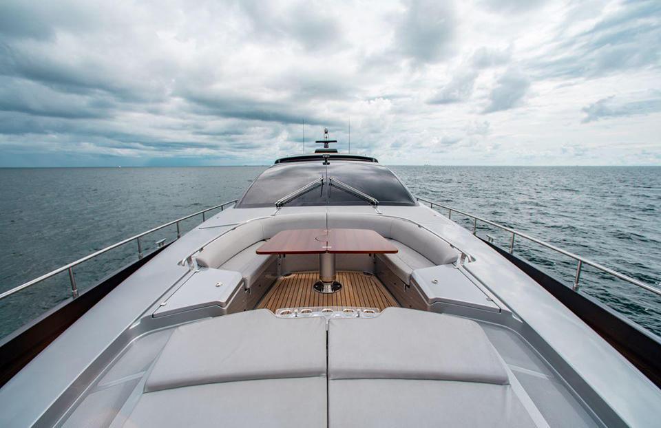 The cockpit can be reached from the transom via a few side steps. It is a real outdoor lounge, furnished with a comfortable C-shaped sofa/chaise lounge, beyond which another sofa stands in front of the dining table. The cockpit is completed by a low cabinet with a sink, on the port side, near the access to the crew quarters, while to starboard, under the stairs leading to the sundeck, another unit contains the icemaker and a storage compartment.