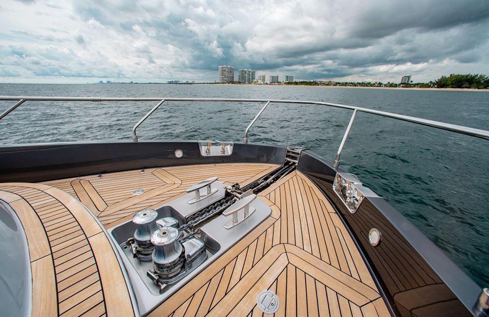 - Fiberglass deck with teak overlay Spring cleat, port and starboard
