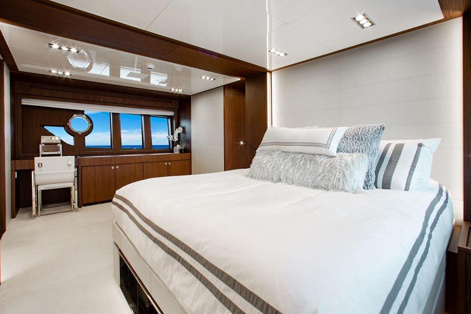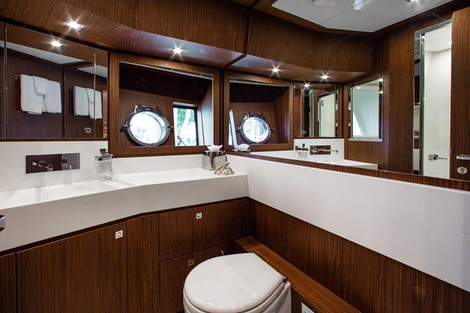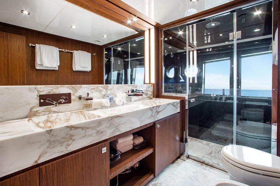 A first flight of stairs reaches the lobby, which leads forward to the three guest cabins, while to starboard, towards the stern, a door opens up onto a second series of steps taking to the full-beam master stateroom, located amidships. This very airy cabin, which benefits from plenty of natural light thanks to the two hull windows and the portholes, is furnished with a low cabinet and a desk/vanity set to starboard. The king size bed, on the left-hand side, is in front of the wall-mounted TV screen. Behind the cabin, across an access room, are the Owner’s bathroom and the large walk-in wardrobe, which is completed by two additional wardrobe modules, one in the access room and the other one forward, beside the stairs.