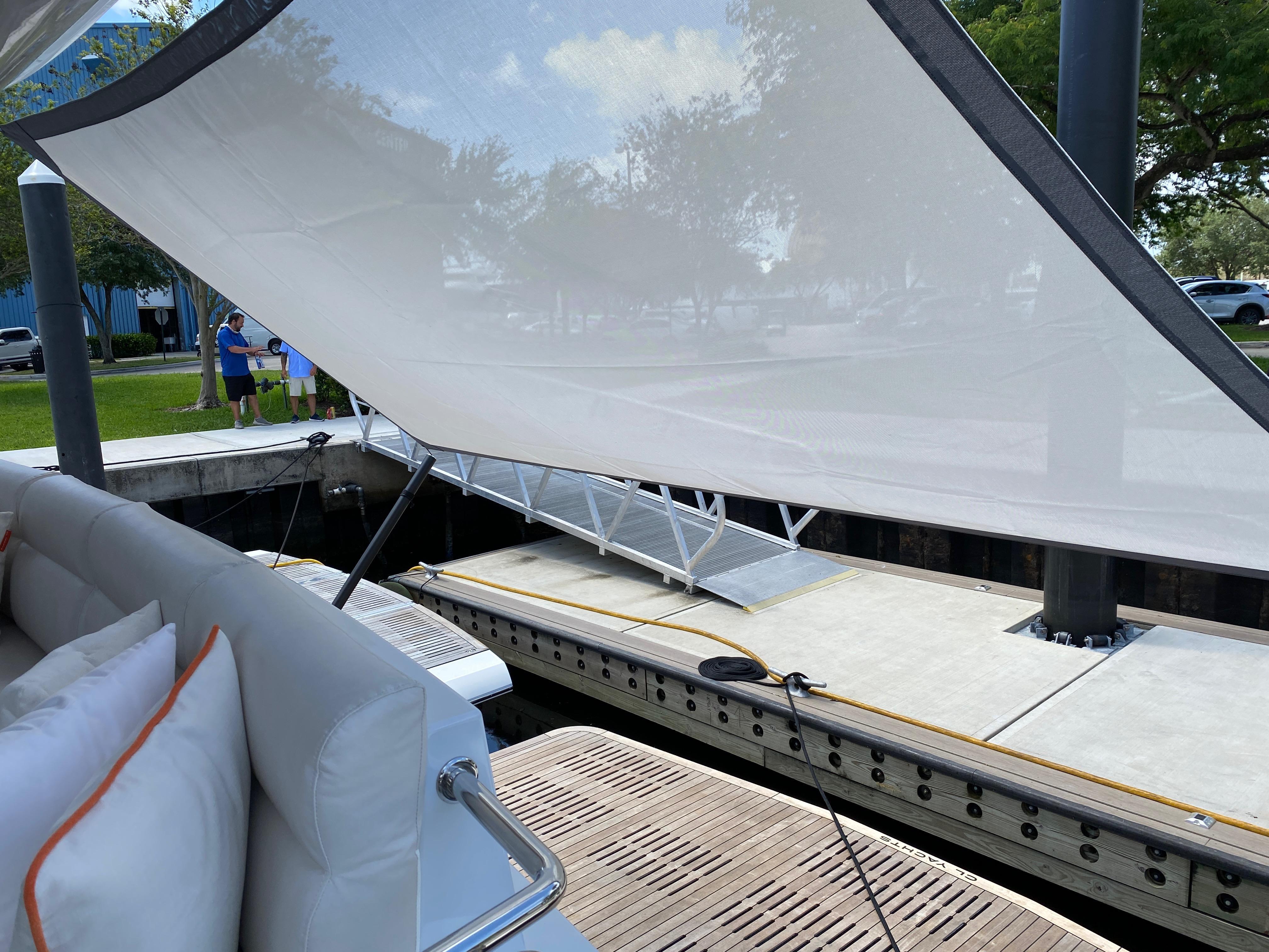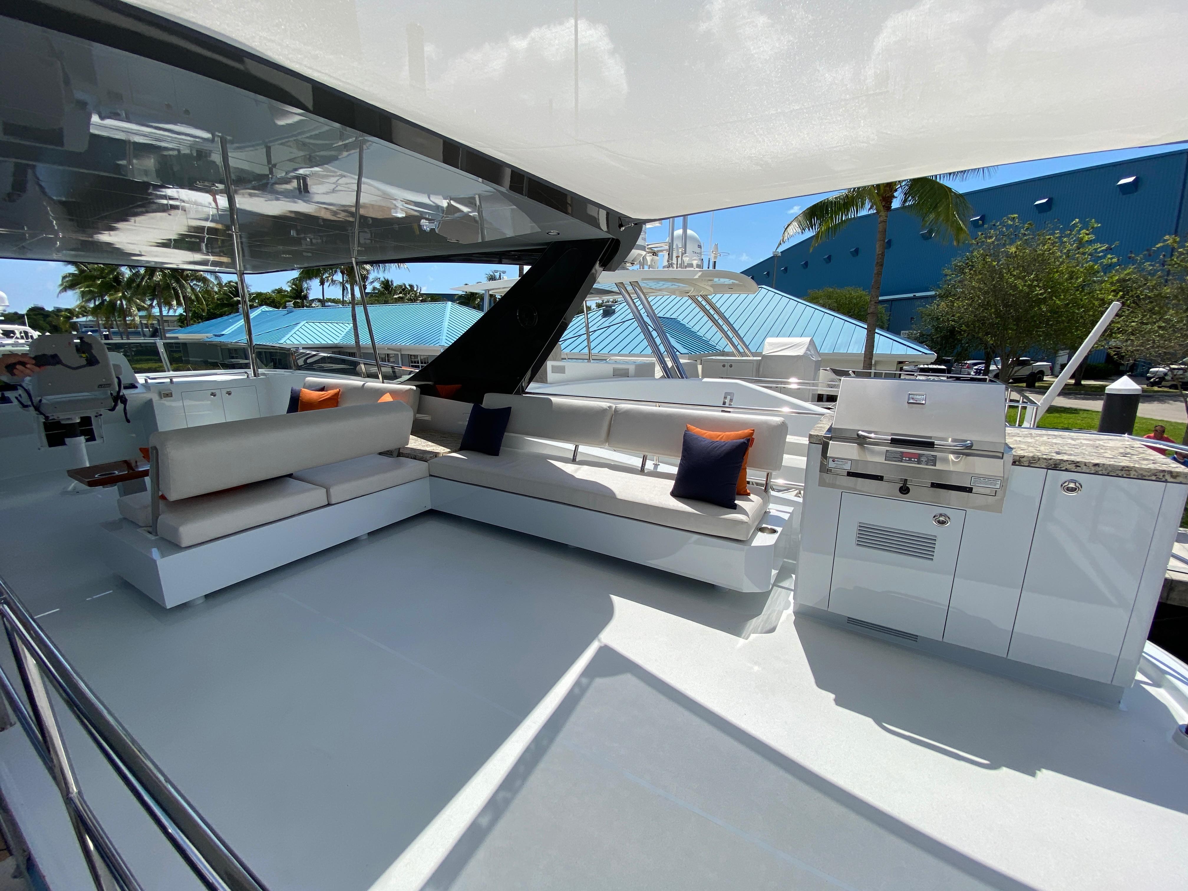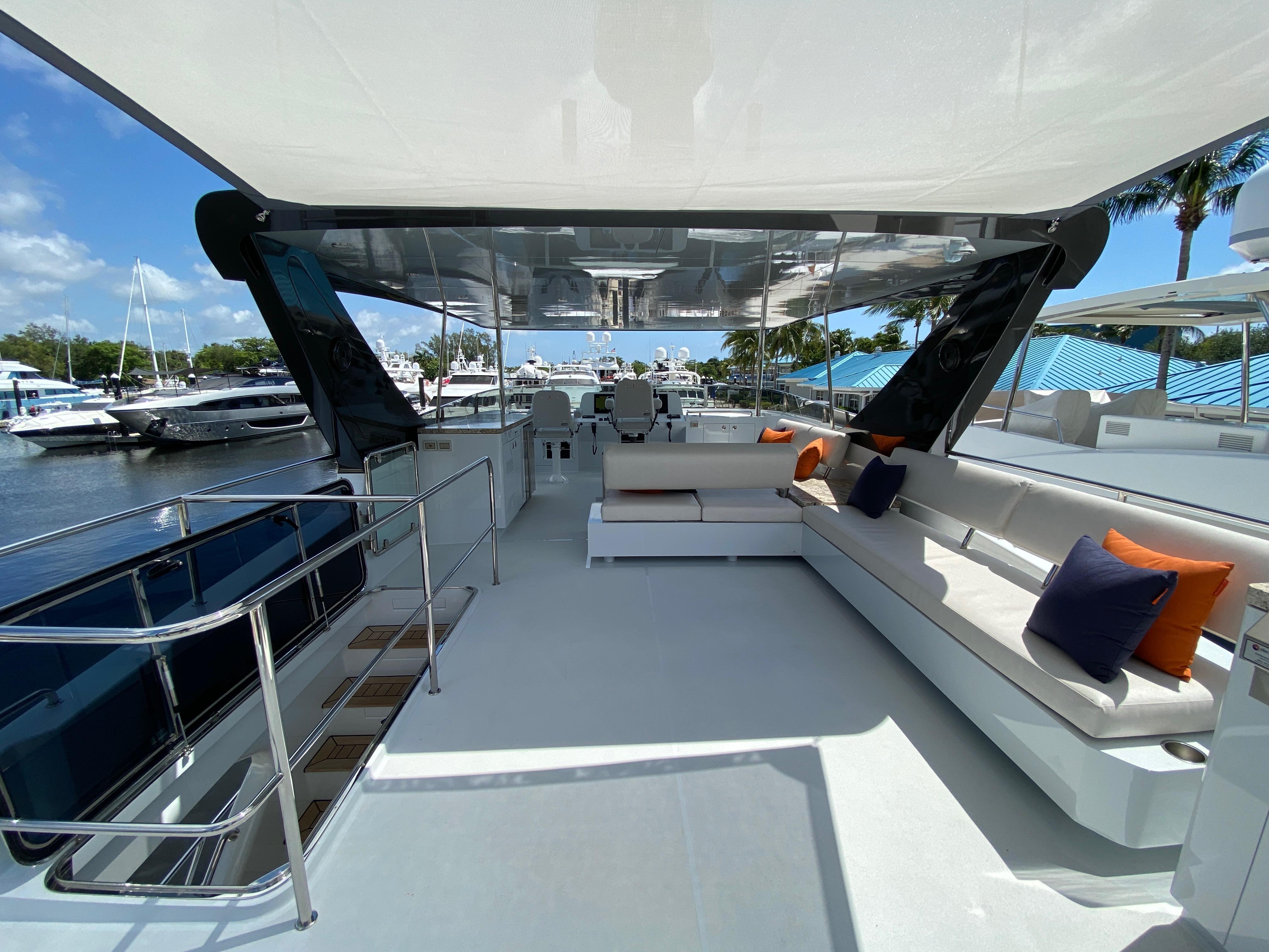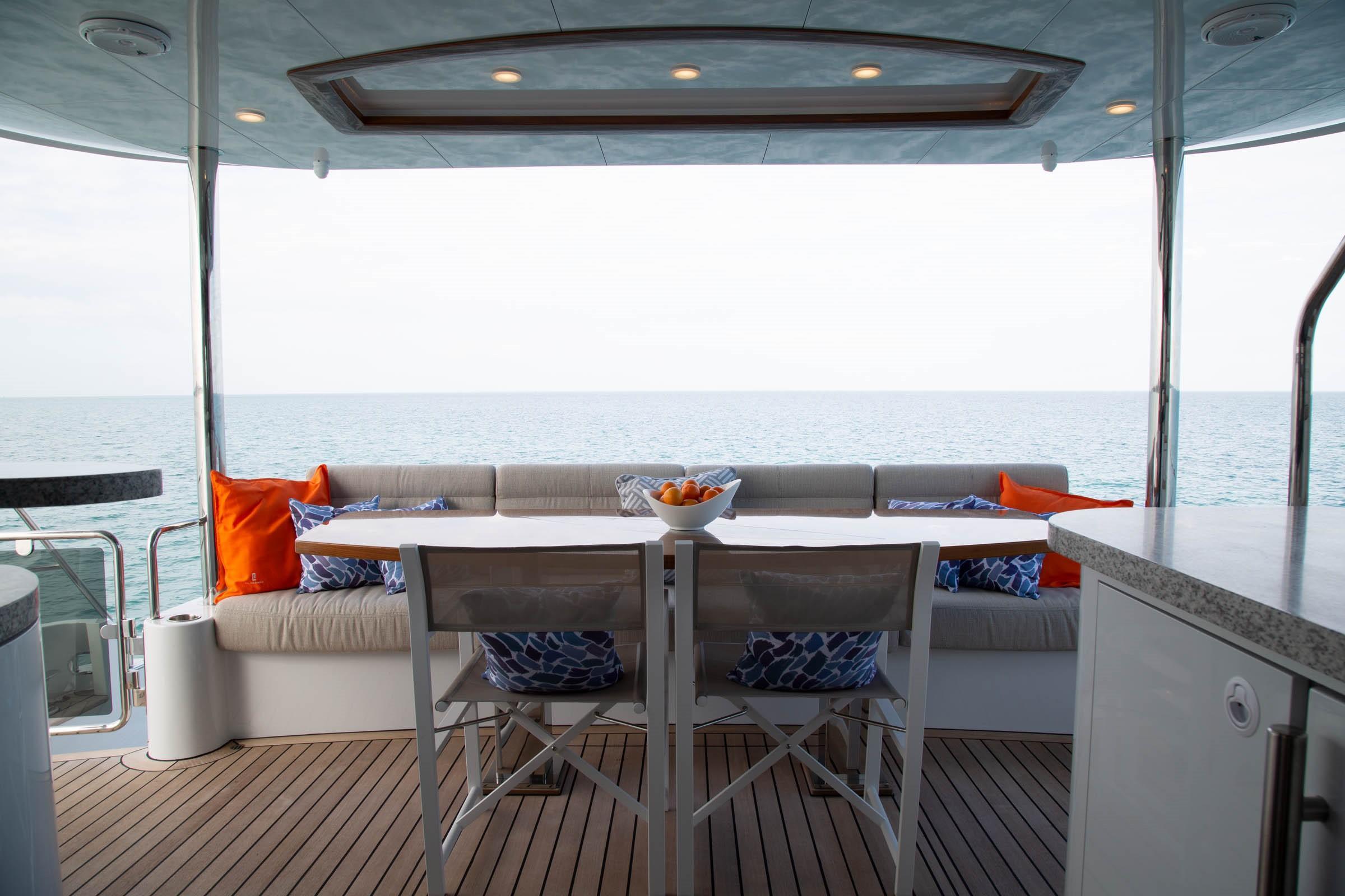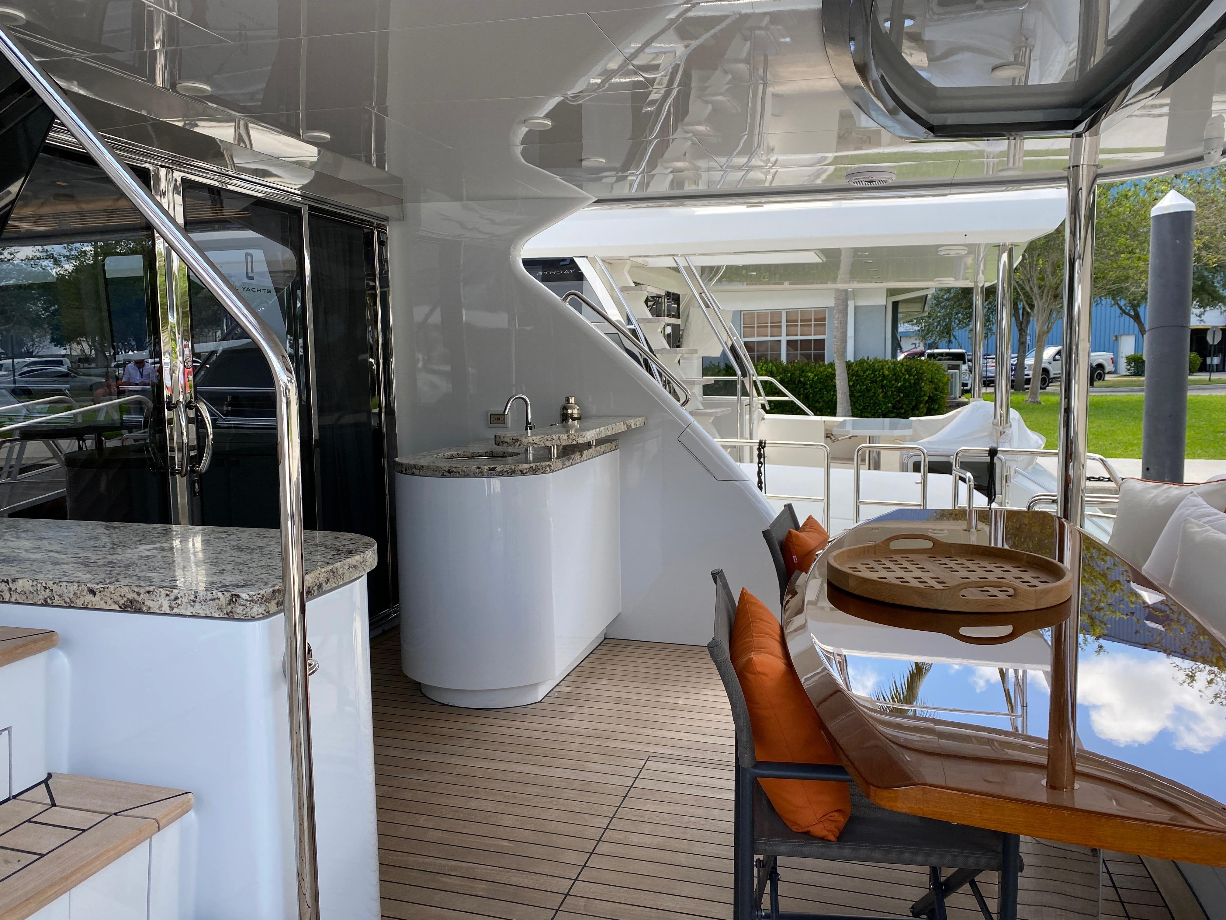 Aft deckBeautiful aft deck with generous teak table for al fresco dining or cocktails. Aft deck bar with wet bar, generous refrigerator and ice maker and TV. removable sunshades protects the aft deck and swim platform areas.