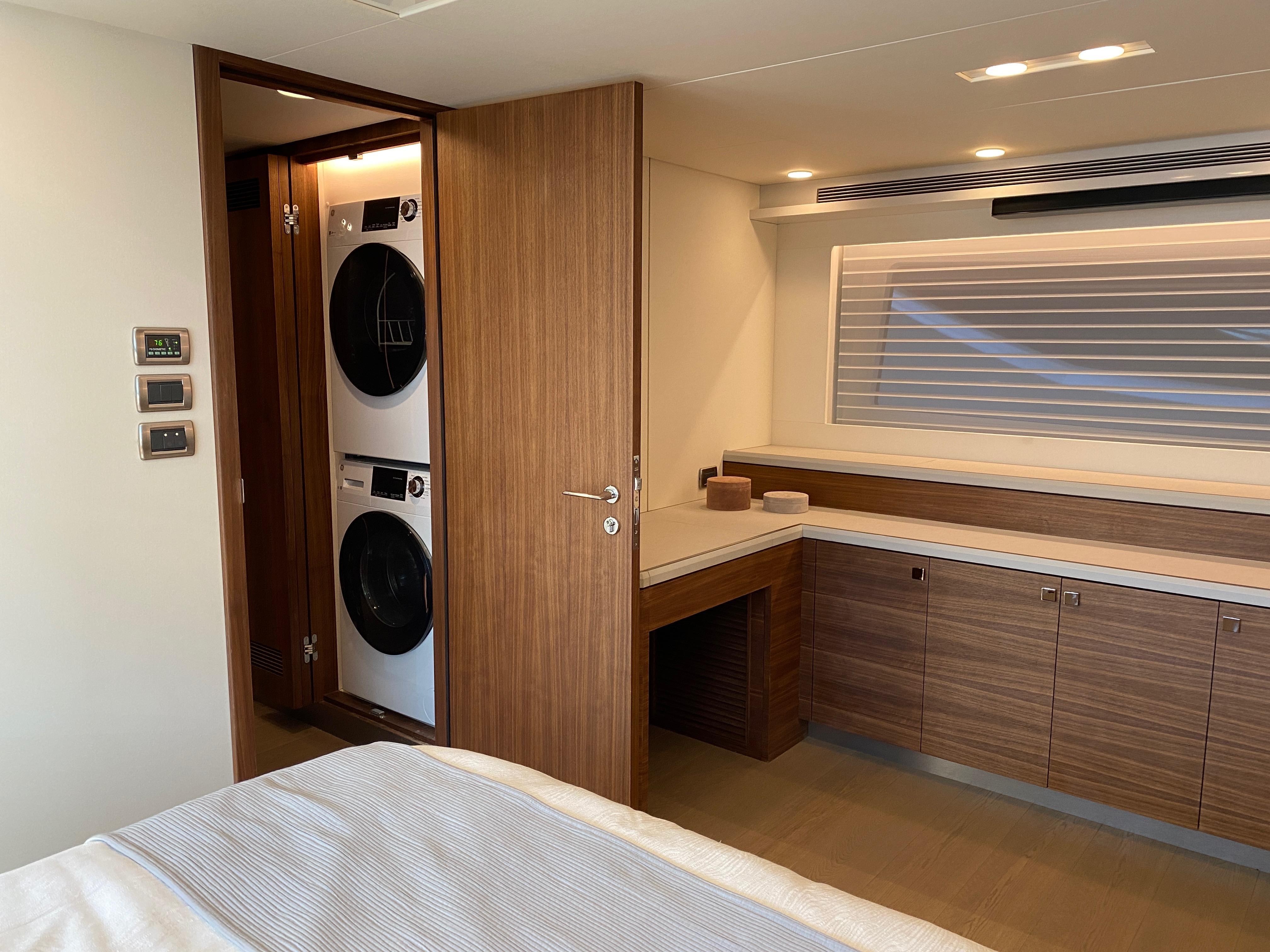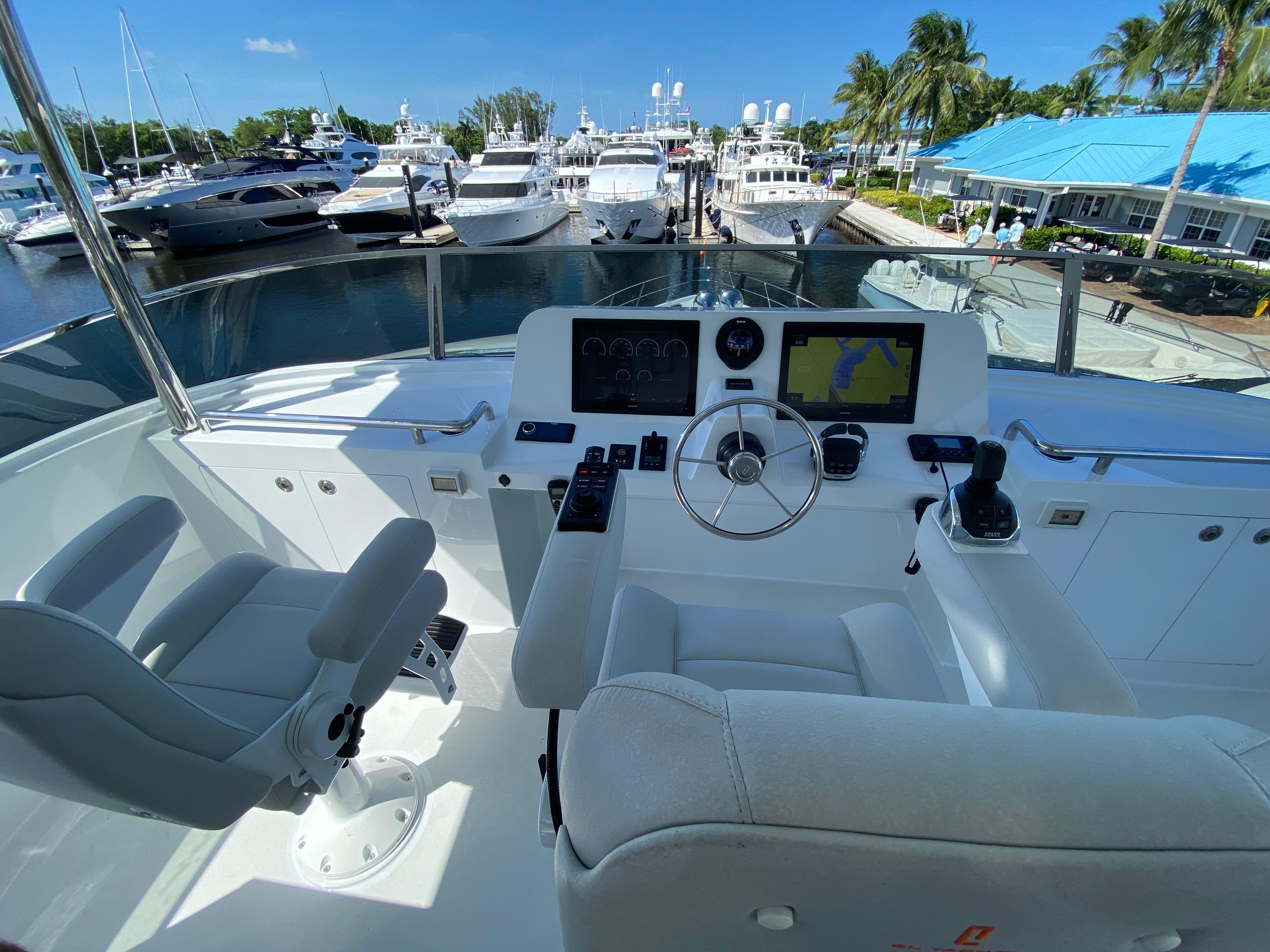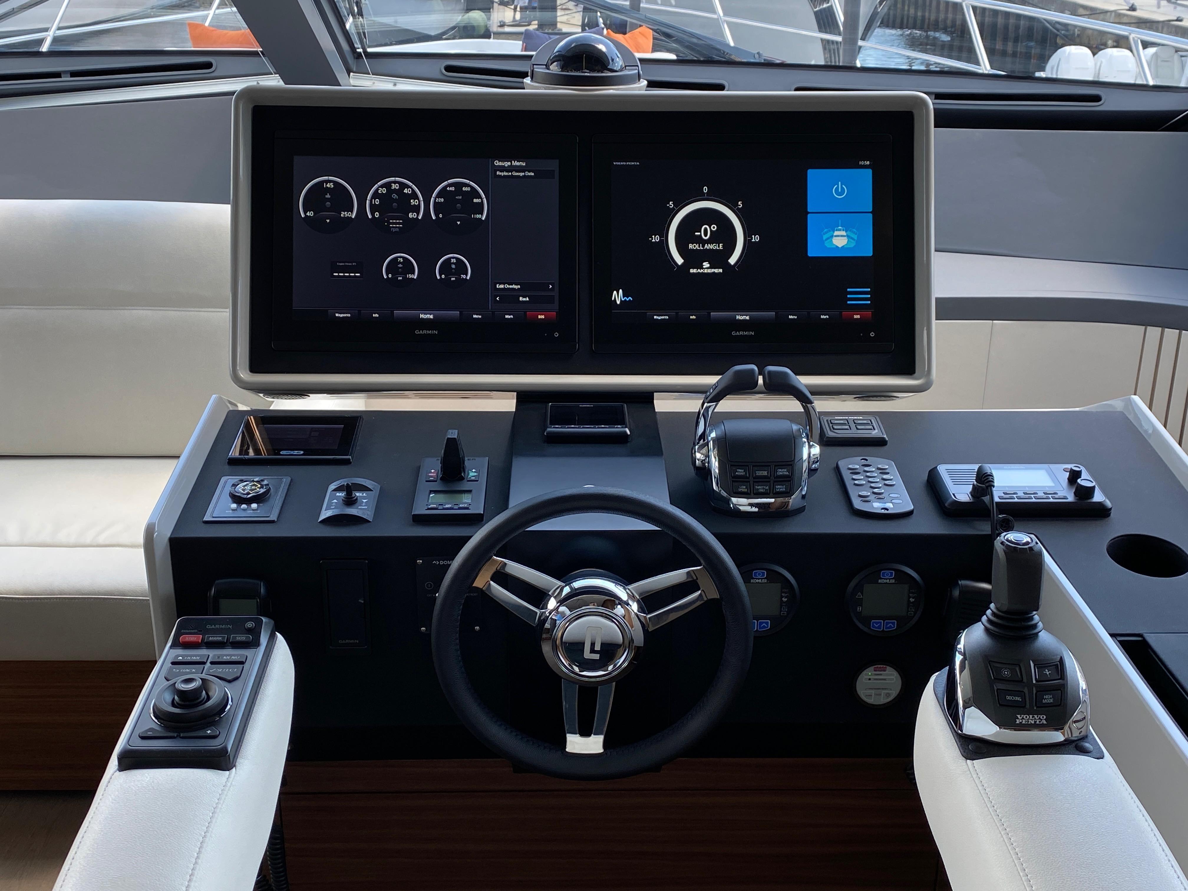 Lower helmFull navigational electronics on lower and upper helm stations. Additional port side and starboard side joystick docking stations on the aft deck for easy docking. Pantographic door right next to the lower helm station for easy access to the side deck.