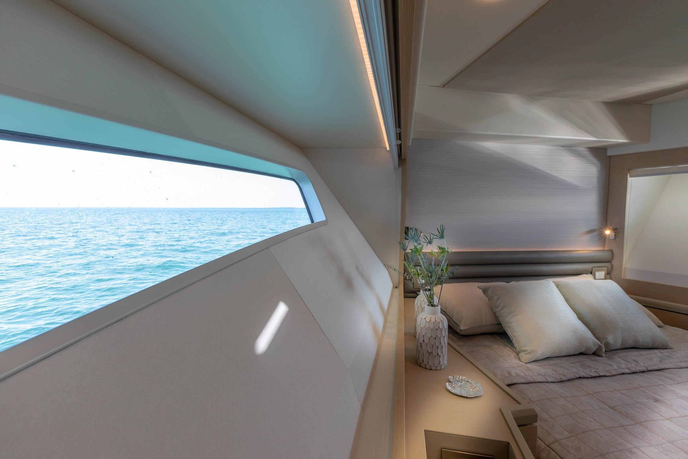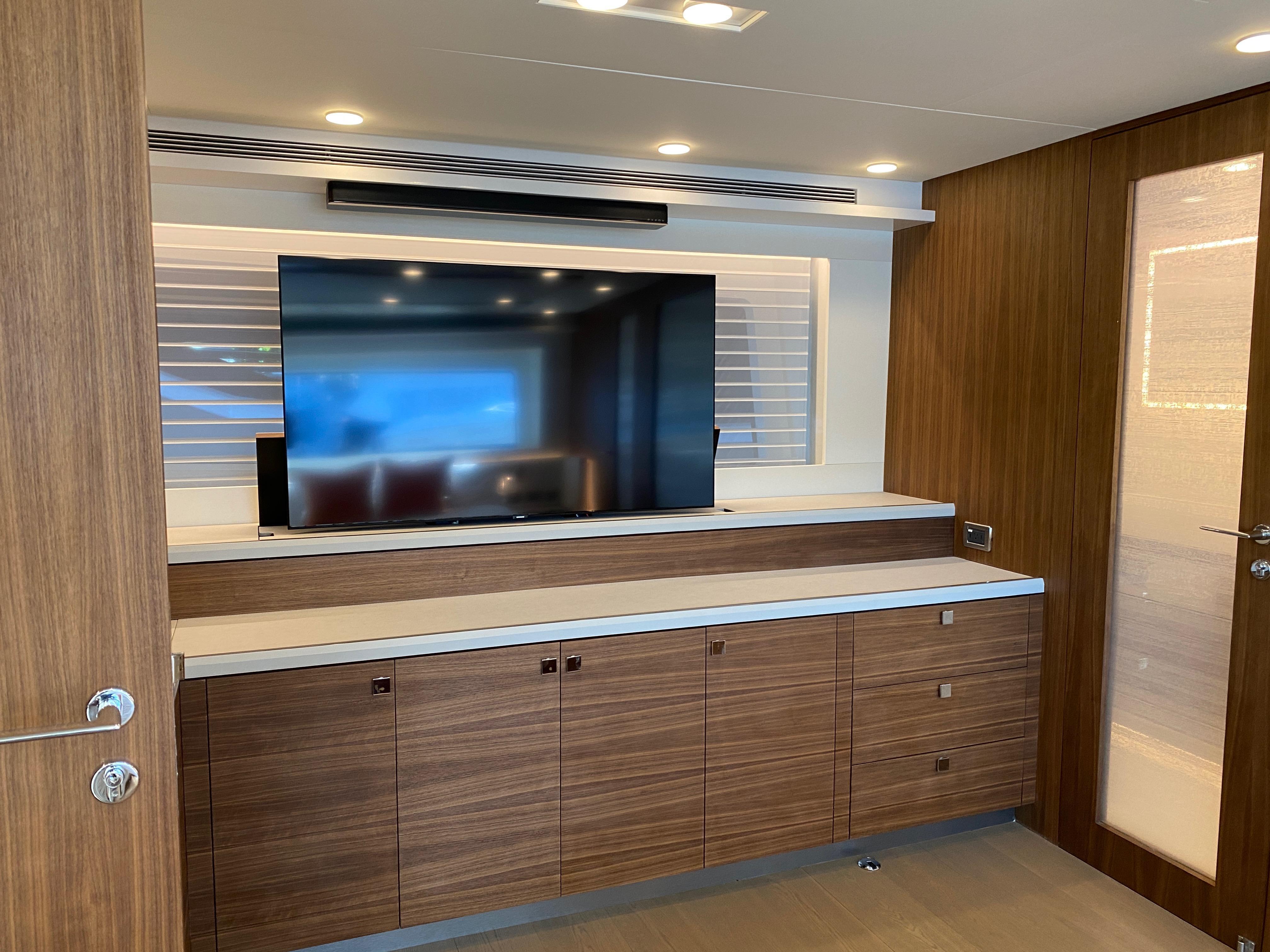 Stunning interior with 360-degree view. Open layout. Comfortable and generous free standing seating with a cocktail table, entertainment cabinet for audio visual electronics, a TV lift than can be also used in lower position when under way. Dayhead on the main deck. Flush deck, no steps between salon and galley! Electric sliding door to aft deck with auto/manual option. Opening salon side windows and galley window for those cooler nights when AC is not needed. Upgraded Ultra Leather salon settee.