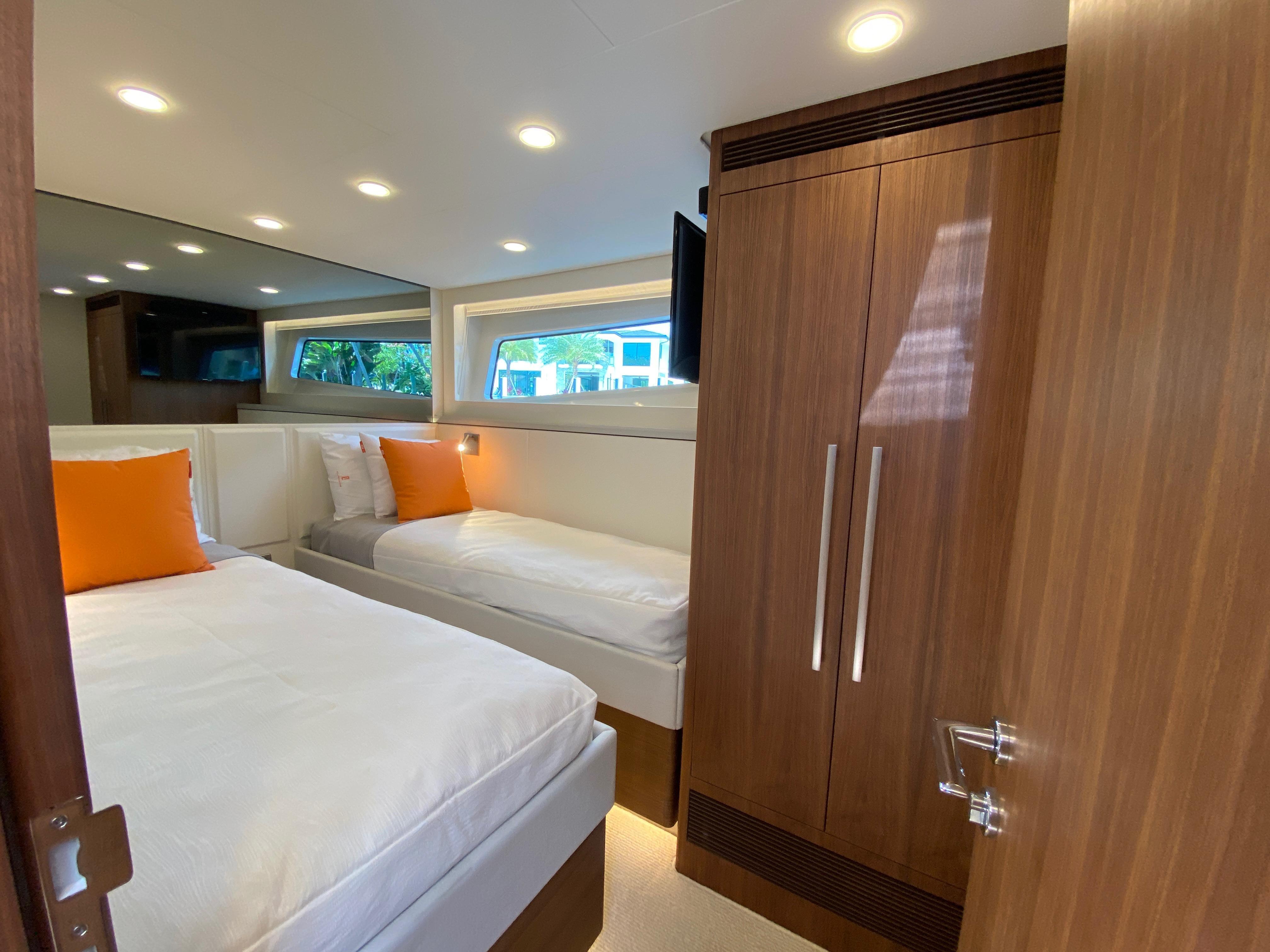 4 staterooms total, spacious full beam master cabin with a walk in closet and en-suite European-style bathroom with double sink arrangement. Forward VIP has a spacious en-suite bathroom, port and starboard VIPs share a head. All VIP guest staterooms provides 5-star accommodations for all guests on board. All staterooms feature opening port lights.
