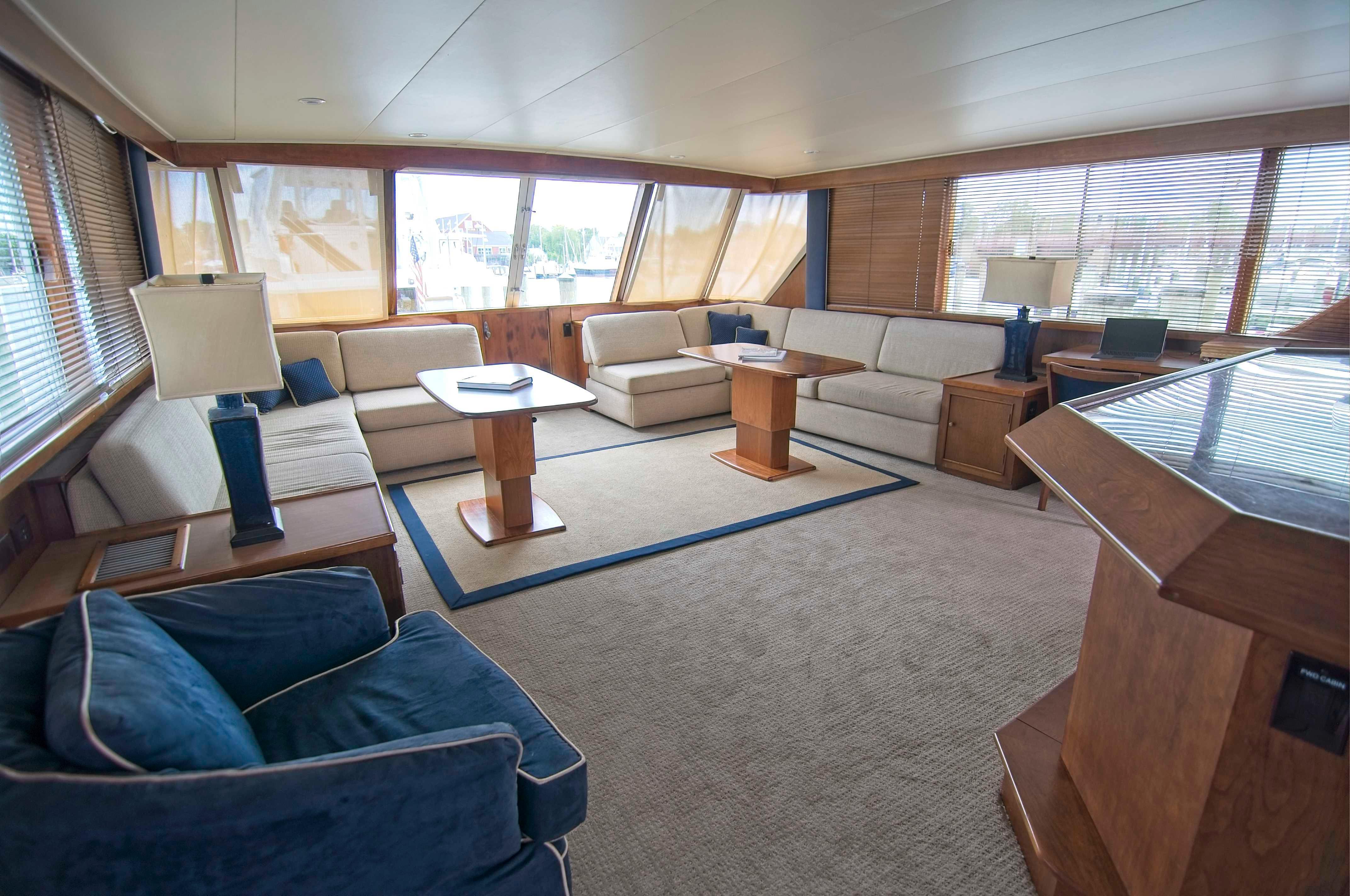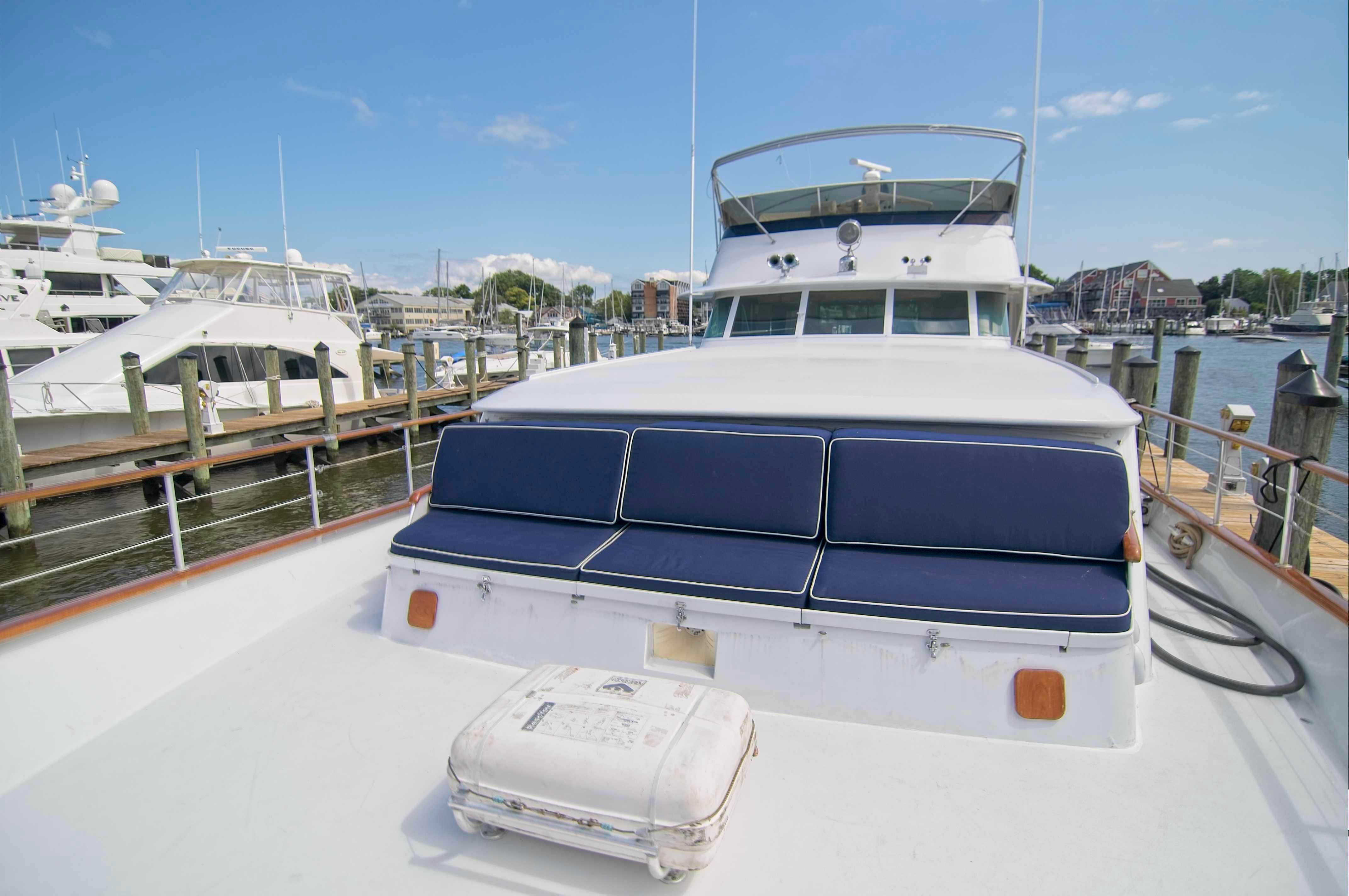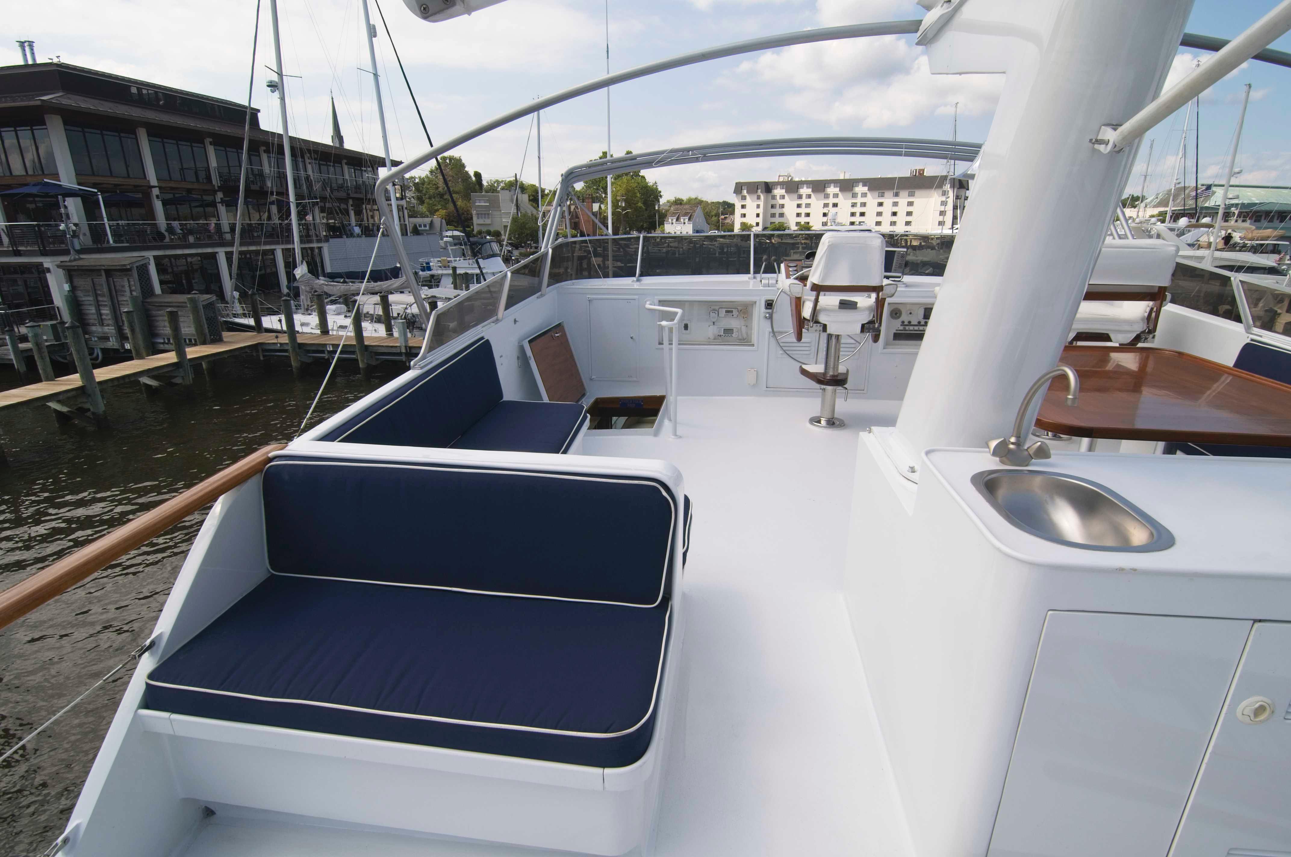 - Once on the main deck there is easy access to the foredeck seating area and the trunk cabin sunning area (much safer than many yachts because its about 4’ above the main deck). From the side deck the aft saloon can be entered from the wing doors, port and starboard, or the sliding pilothouse doors. There are stairs from the pilot house to the well equipped flybridge.