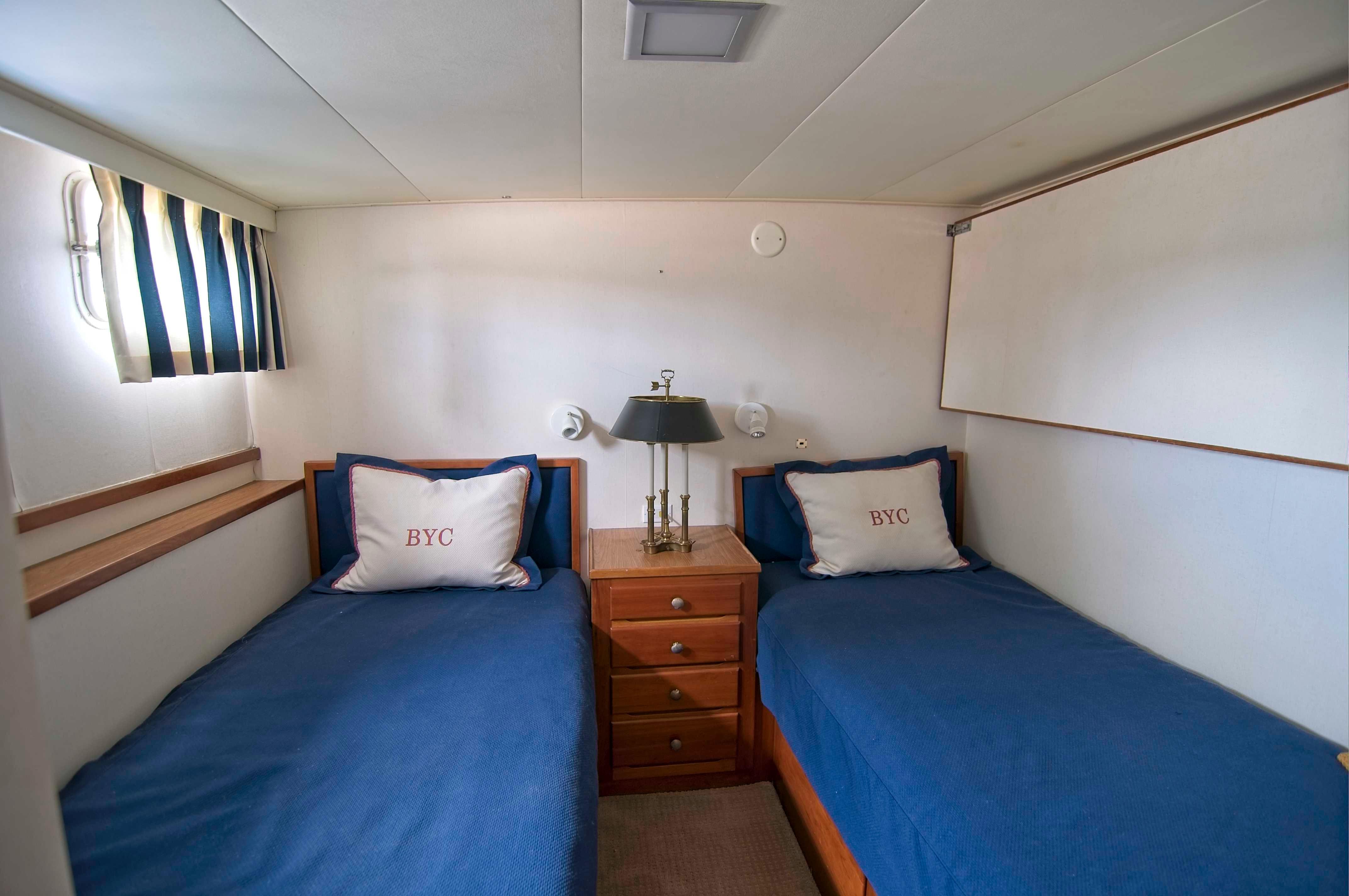 - Aft in the lower saloon down, using a gradual set of steps are the guests staterooms. The master stateroom is all the way aft with a centerline king berth with ensuite head. Forward on either side of the passage way are two over size twin bed guest staterooms with ensuite heads. The starboard guest stateroom head has a second door to serve as a dayhead. The original rich walnut joiner work is still in good condition.