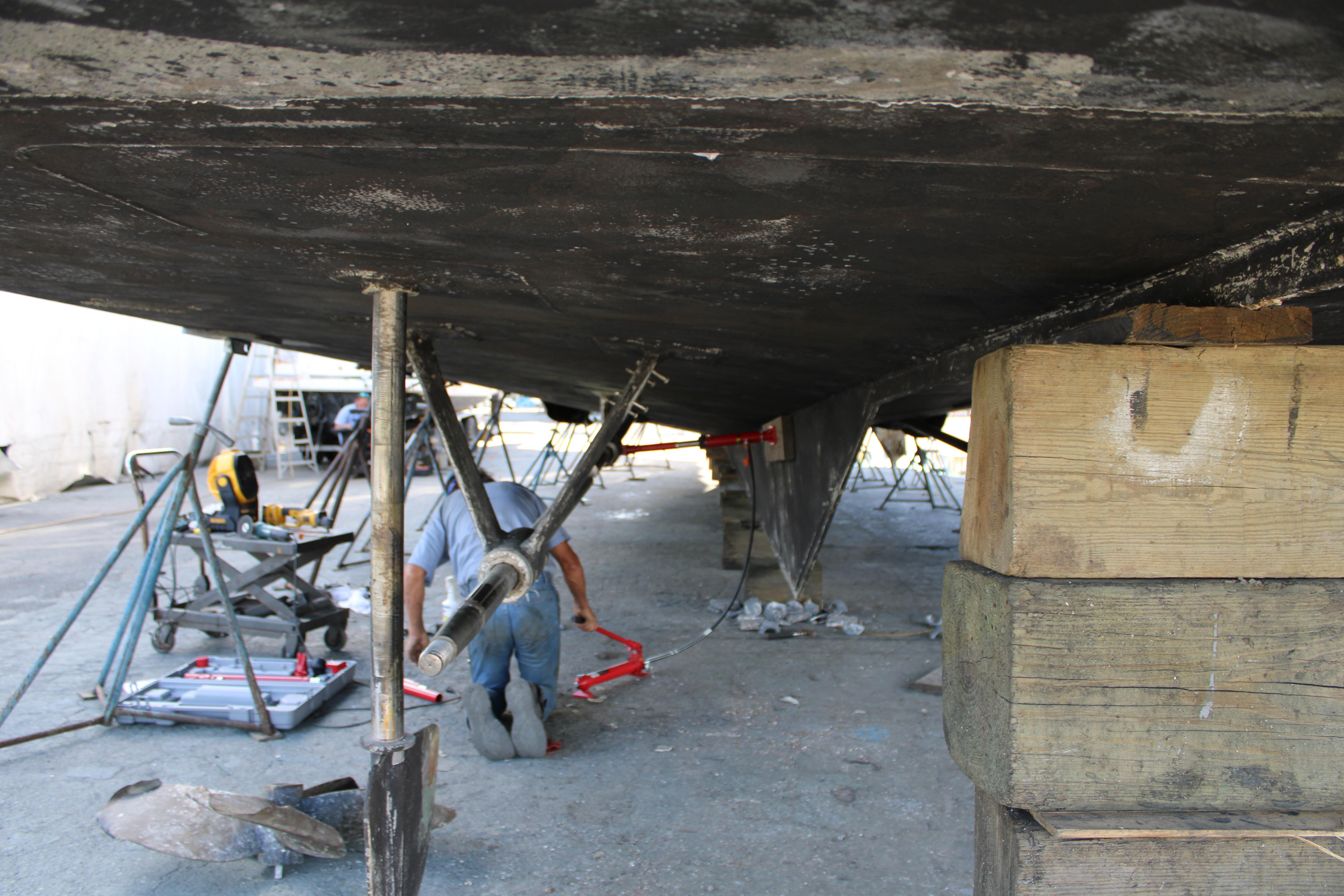 Propeller shafts have been straightened and reinstalled with new bearings. One bent strut has been straightened, bent rudders have been reinstalled, the damaged swim platform has been repaired, and both stabilizer actuators have been rebuilt, and new fins have been installed.