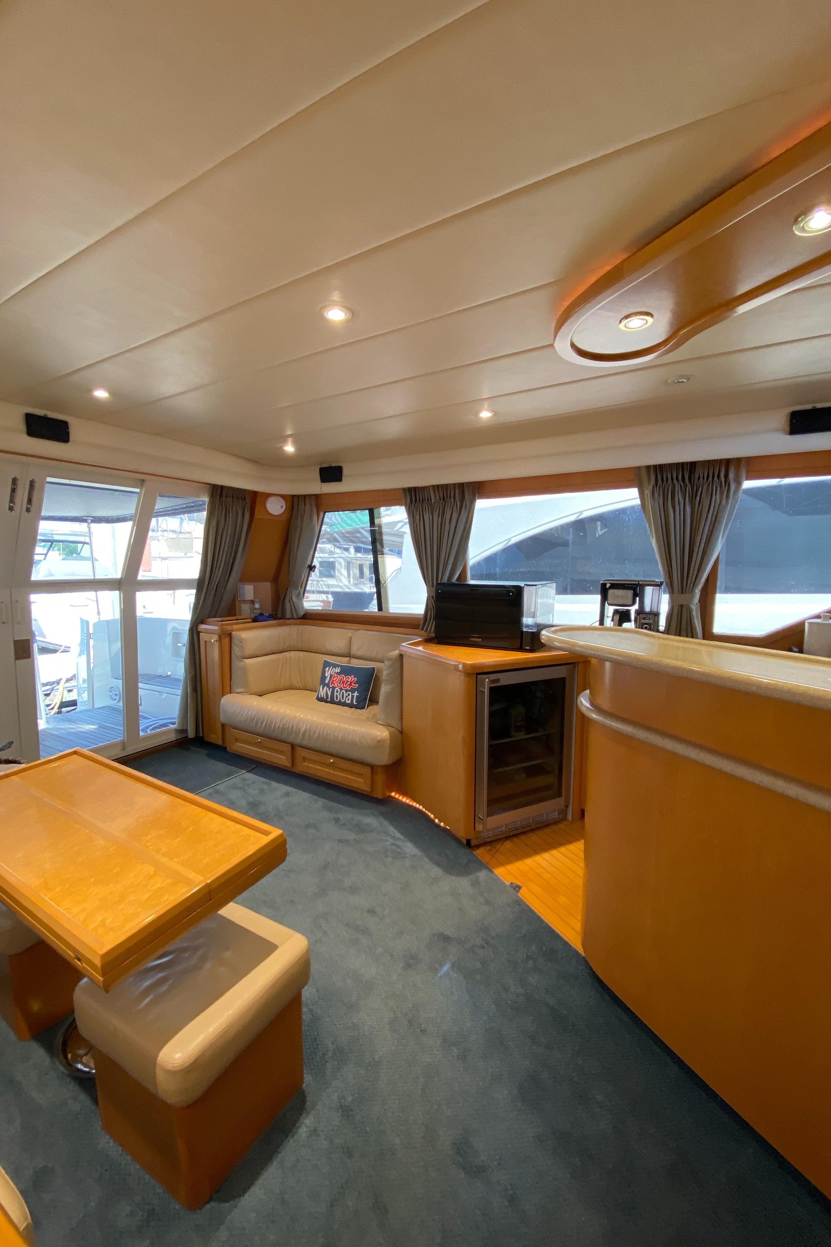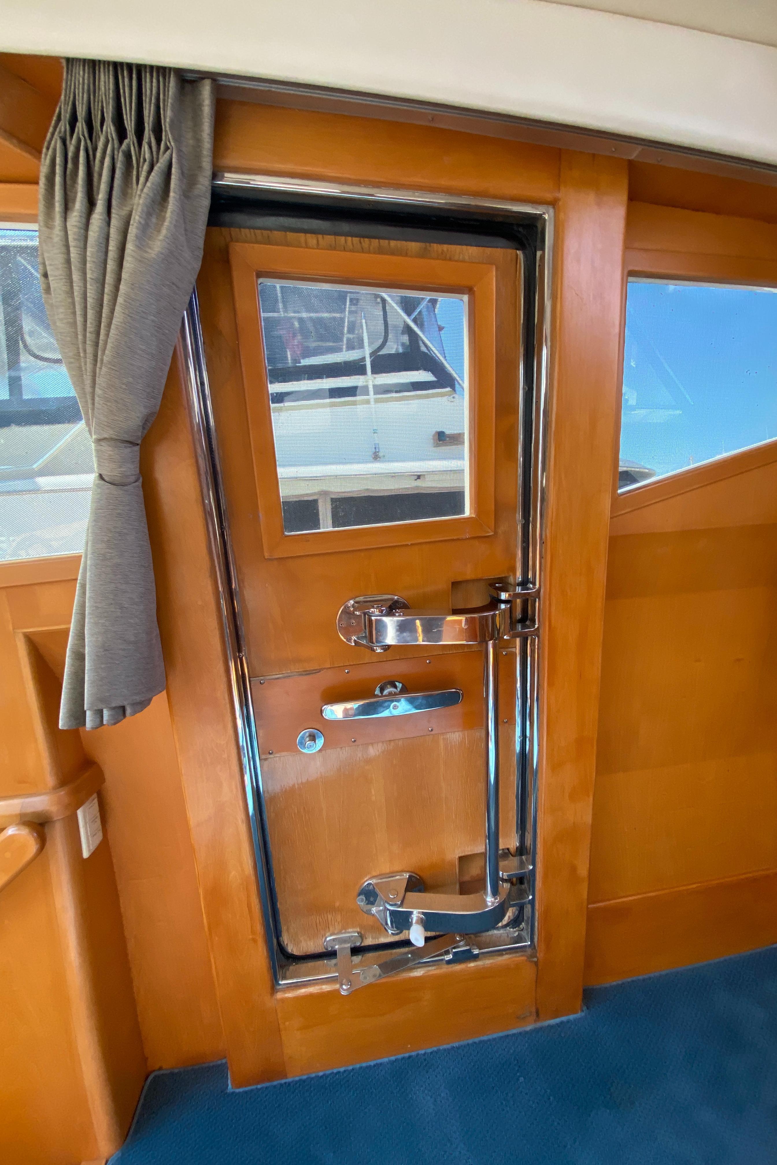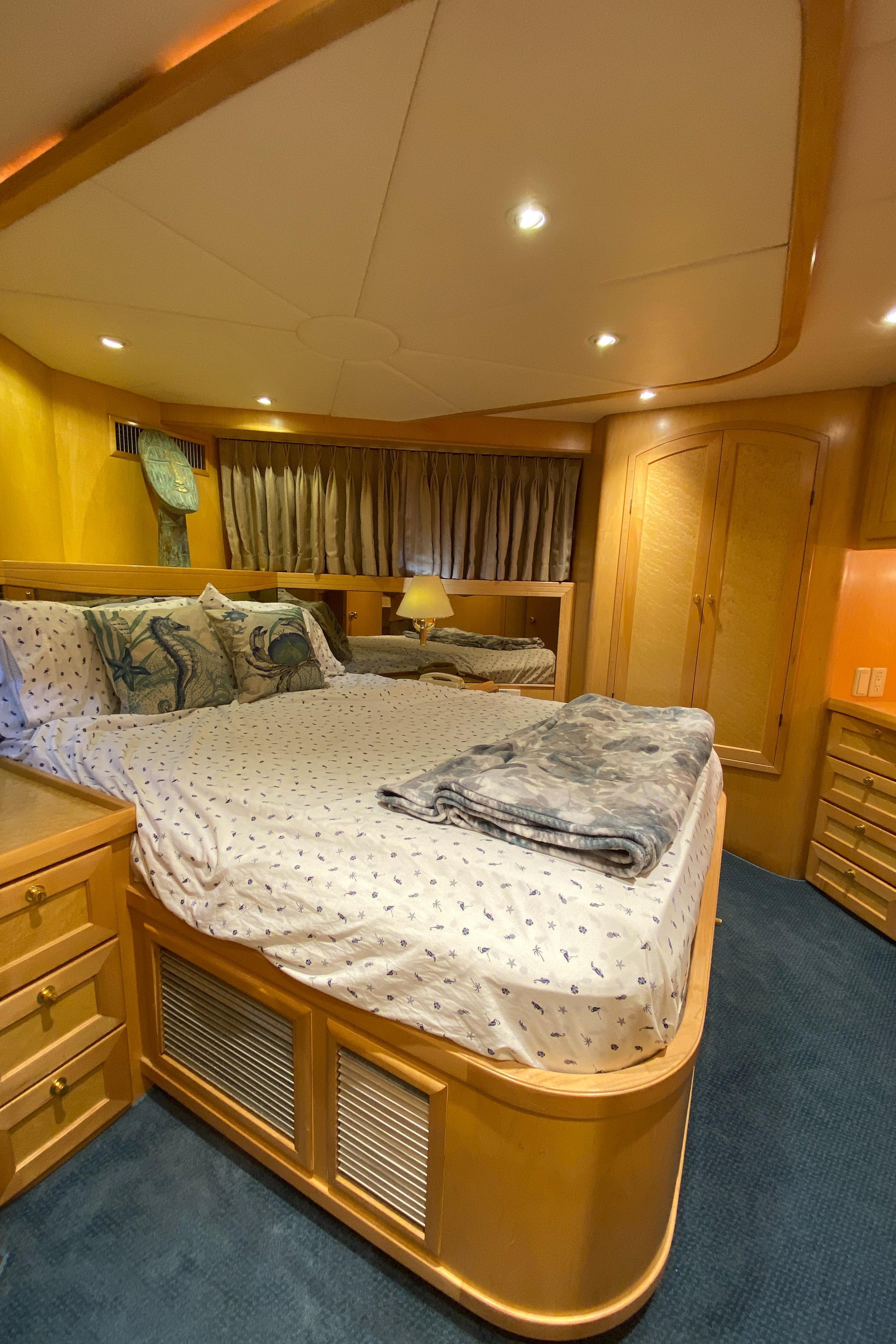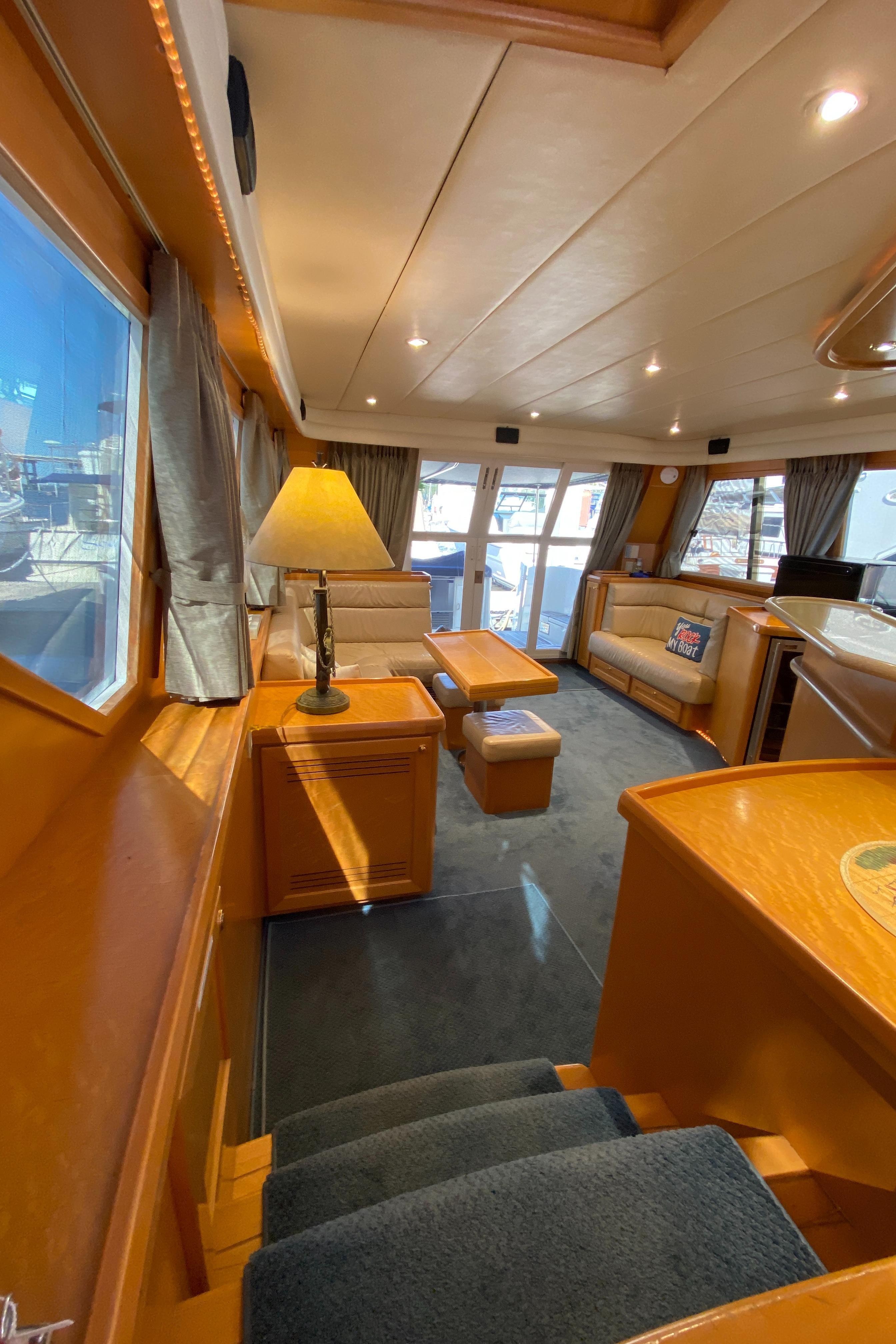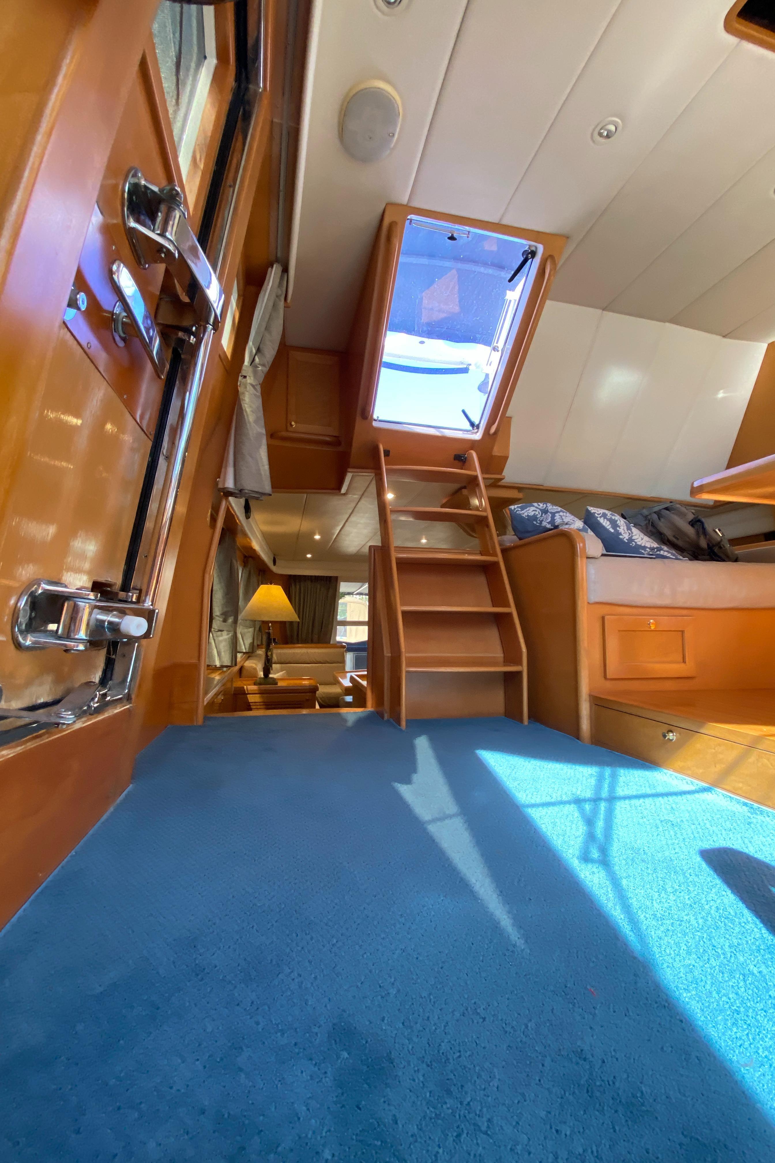- Stepping onto the extra-large swim platform, you have a choice of two transom doors to the large cockpit. You enter the full beam salon through a sliding glass door and find Ultra Leather sofas on both sides with a coffee/dining table to starboard, the galley port forward and steps starboard forward to the raised pilothouse. There are stairs to the fly bridge and a starboard side deck access door before you come to the starboard forward guest staterooms stairs. Once you are in the guest foyer below, you will find the master stateroom aft, guest stateroom to port, guest head to starboard and another guest stateroom all the way forward. Engine room access is through the lazarette.