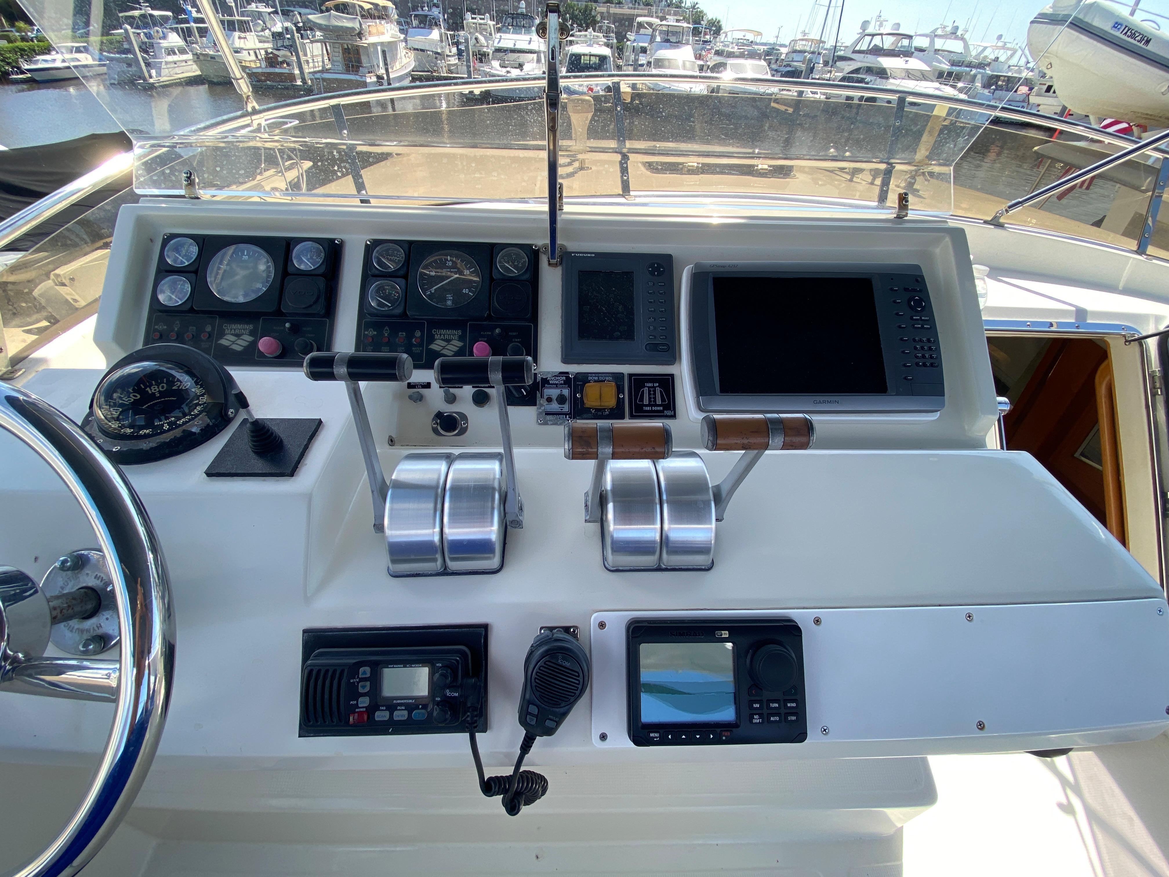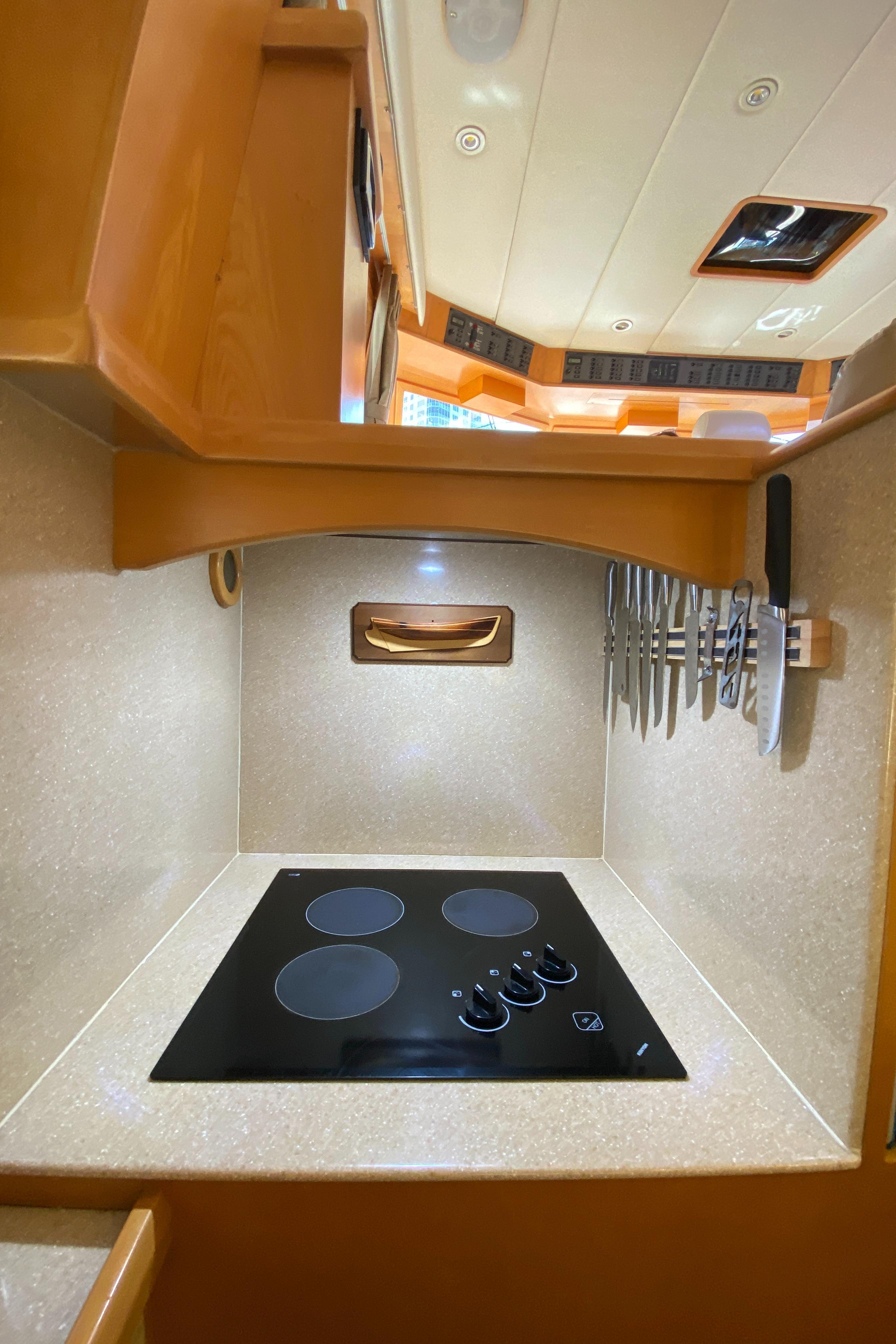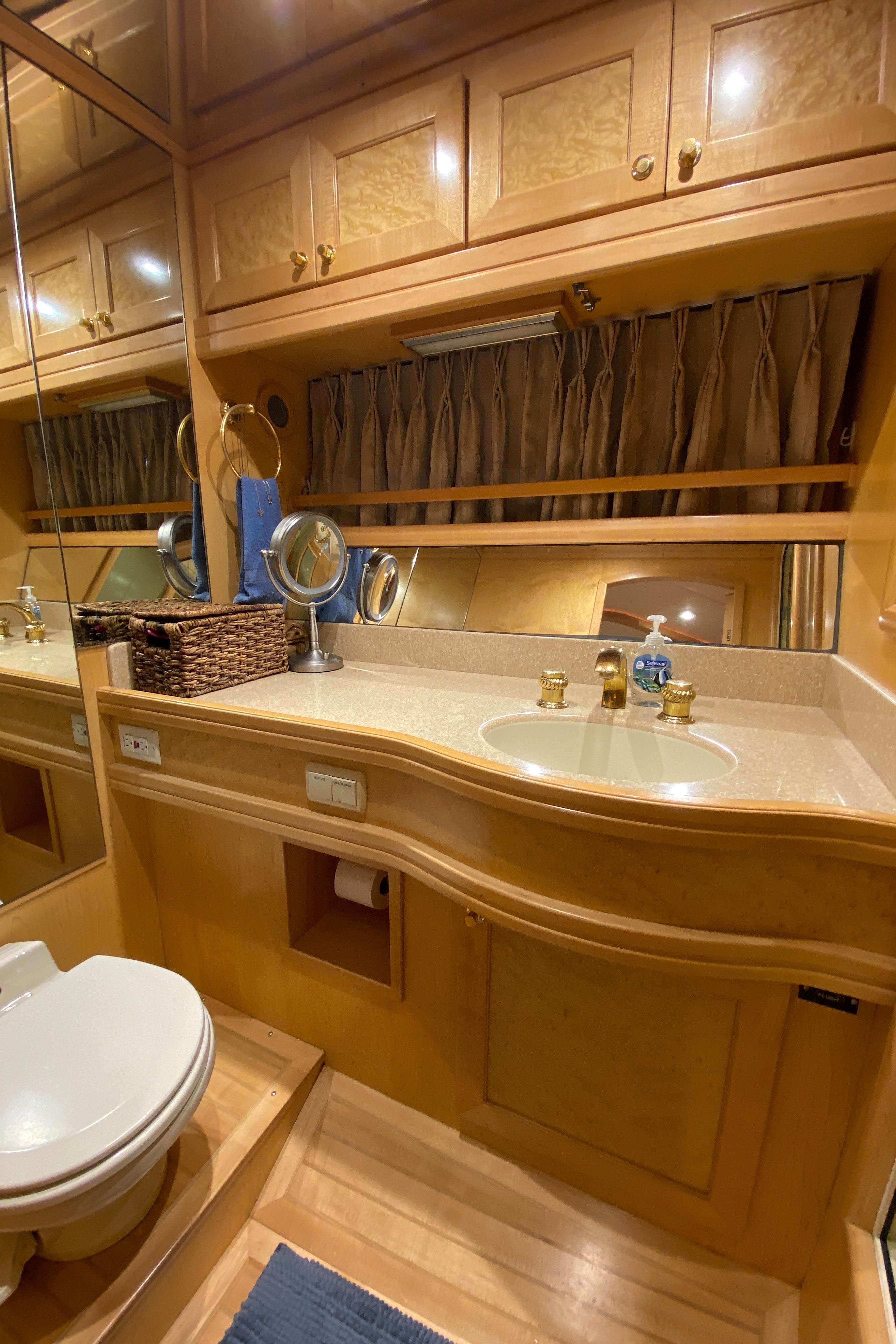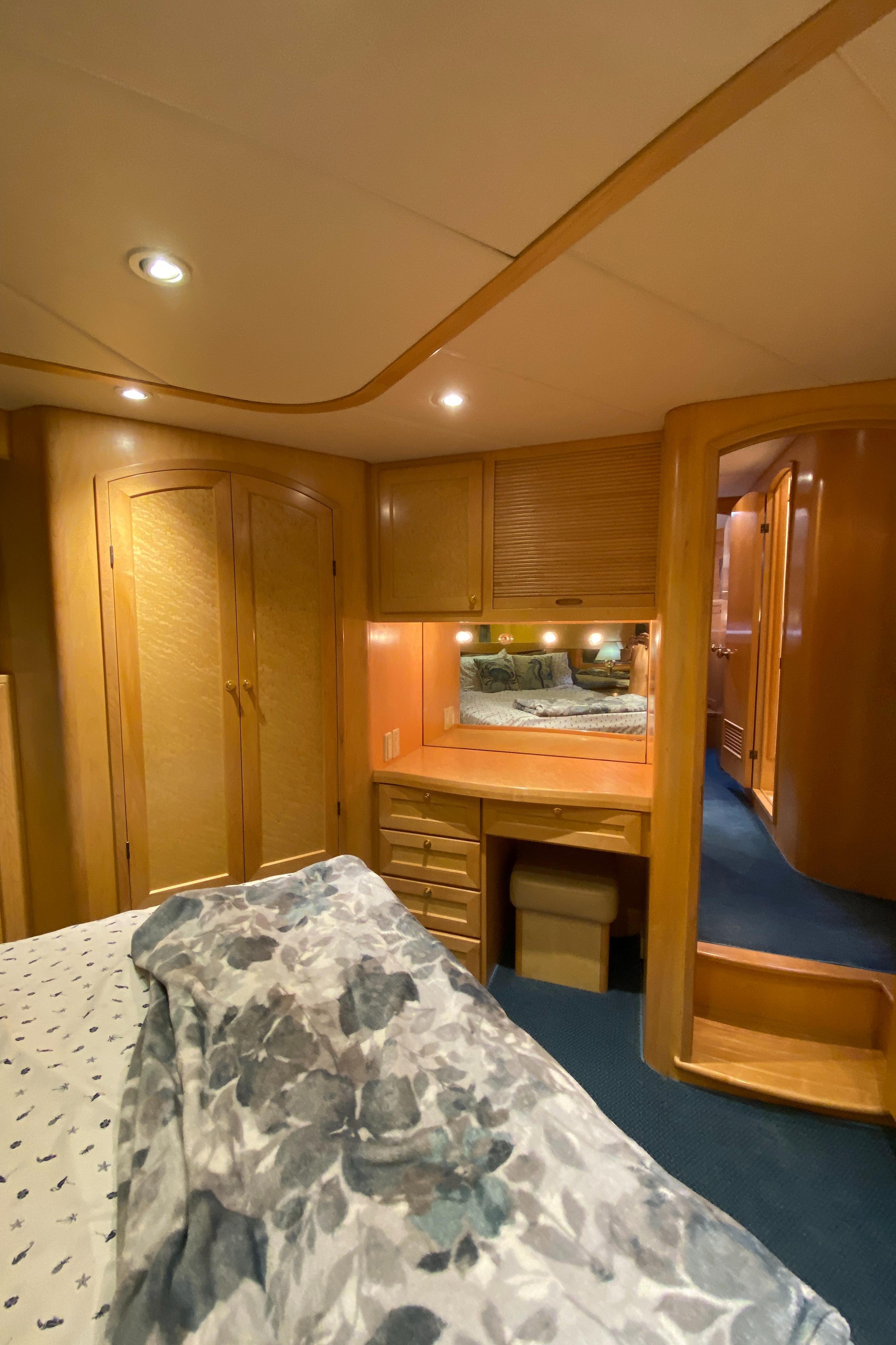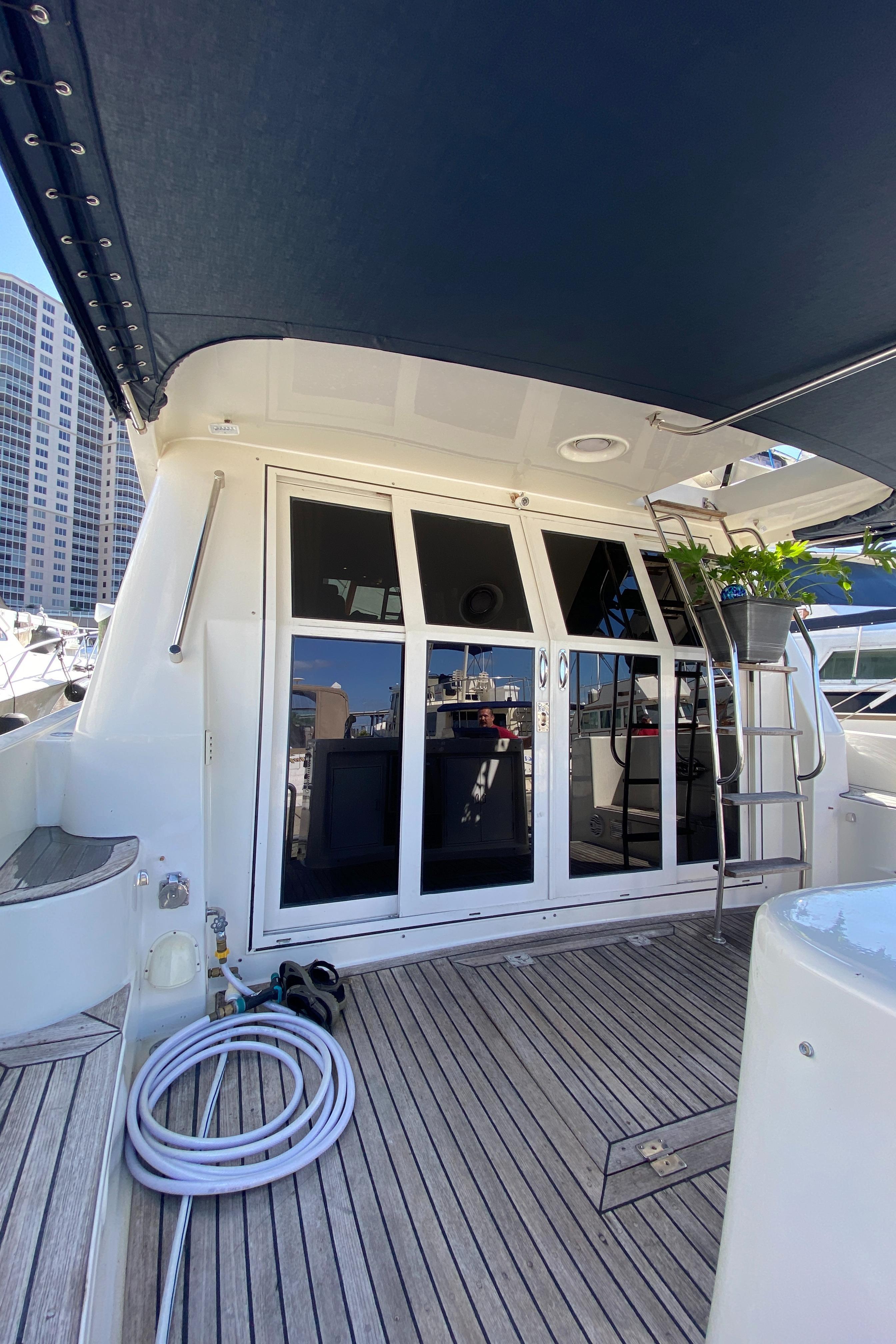 - Stepping onto the extra-large swim platform, you have a choice of two transom doors to the large cockpit. You enter the full beam salon through a sliding glass door and find Ultra Leather sofas on both sides with a coffee/dining table to starboard, the galley port forward and steps starboard forward to the raised pilothouse. There are stairs to the fly bridge and a starboard side deck access door before you come to the starboard forward guest staterooms stairs. Once you are in the guest foyer below, you will find the master stateroom aft, guest stateroom to port, guest head to starboard and another guest stateroom all the way forward. Engine room access is through the lazarette.