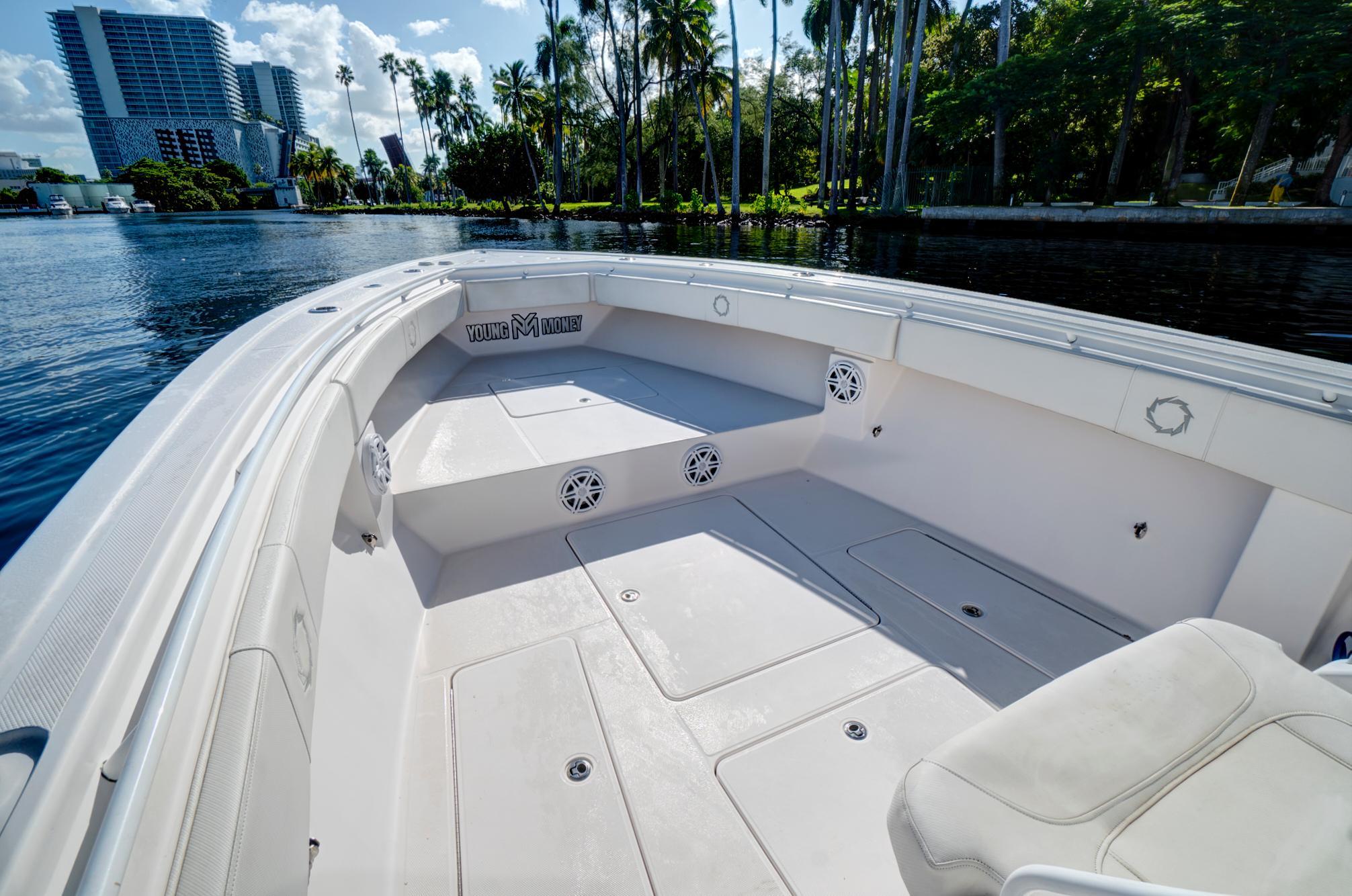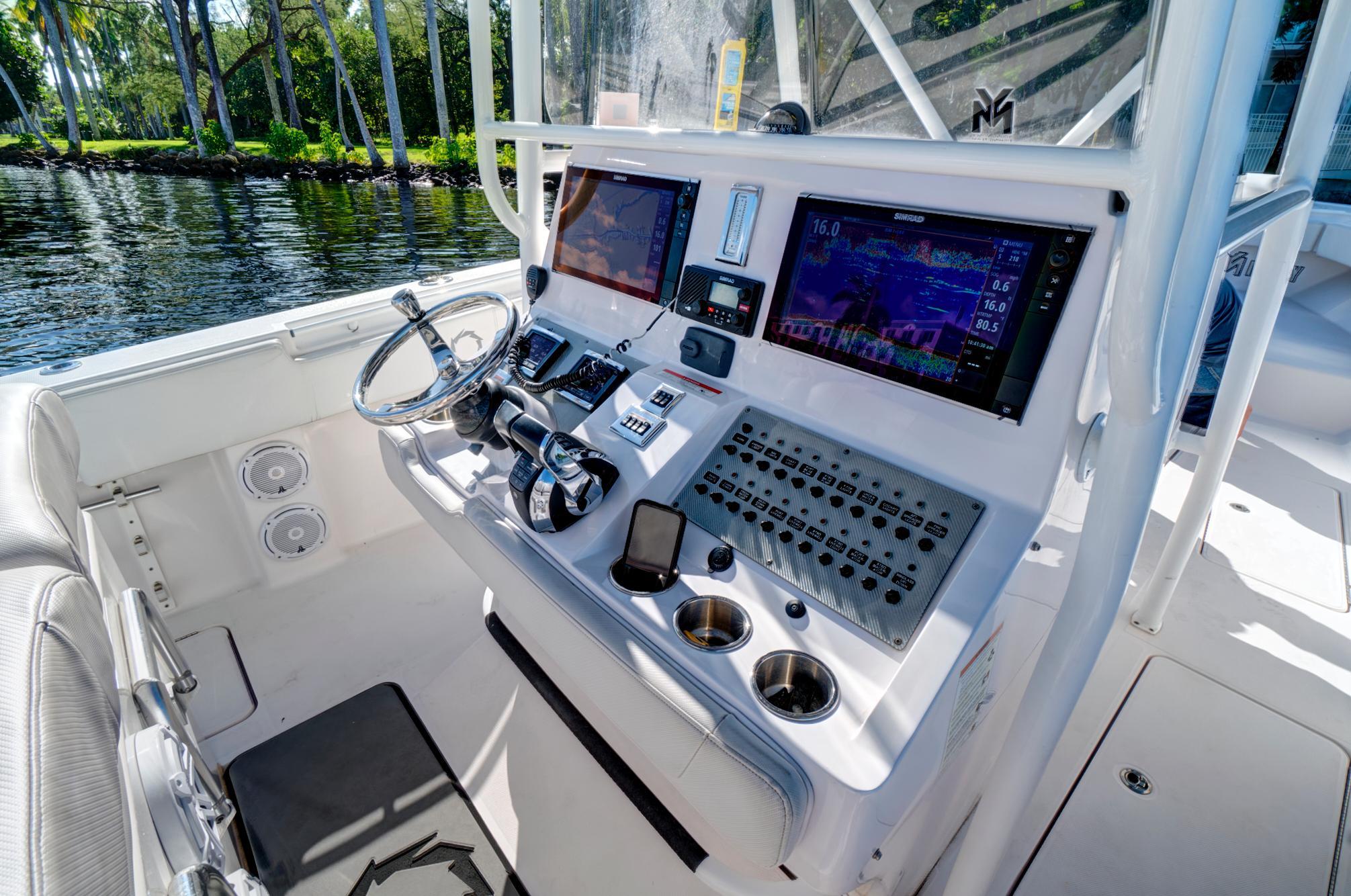 - Center console, pre-wired, fiberglass w/flush mount electronics locker, one-piece plexiglass windshield, molded footrest, walk-in head w/VacuFlush, shower, sink, and 25 quart cooler under forward-facing seat.