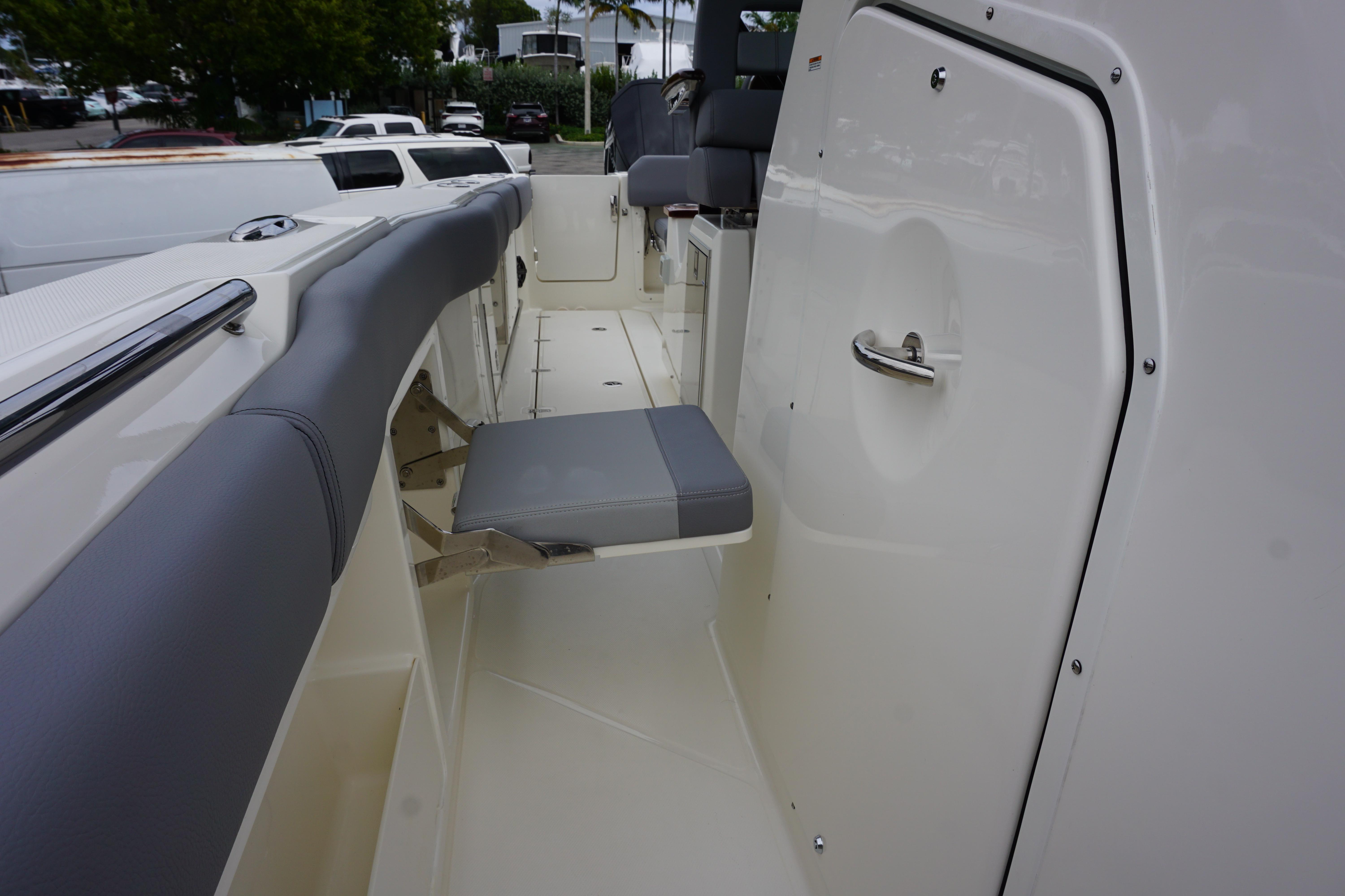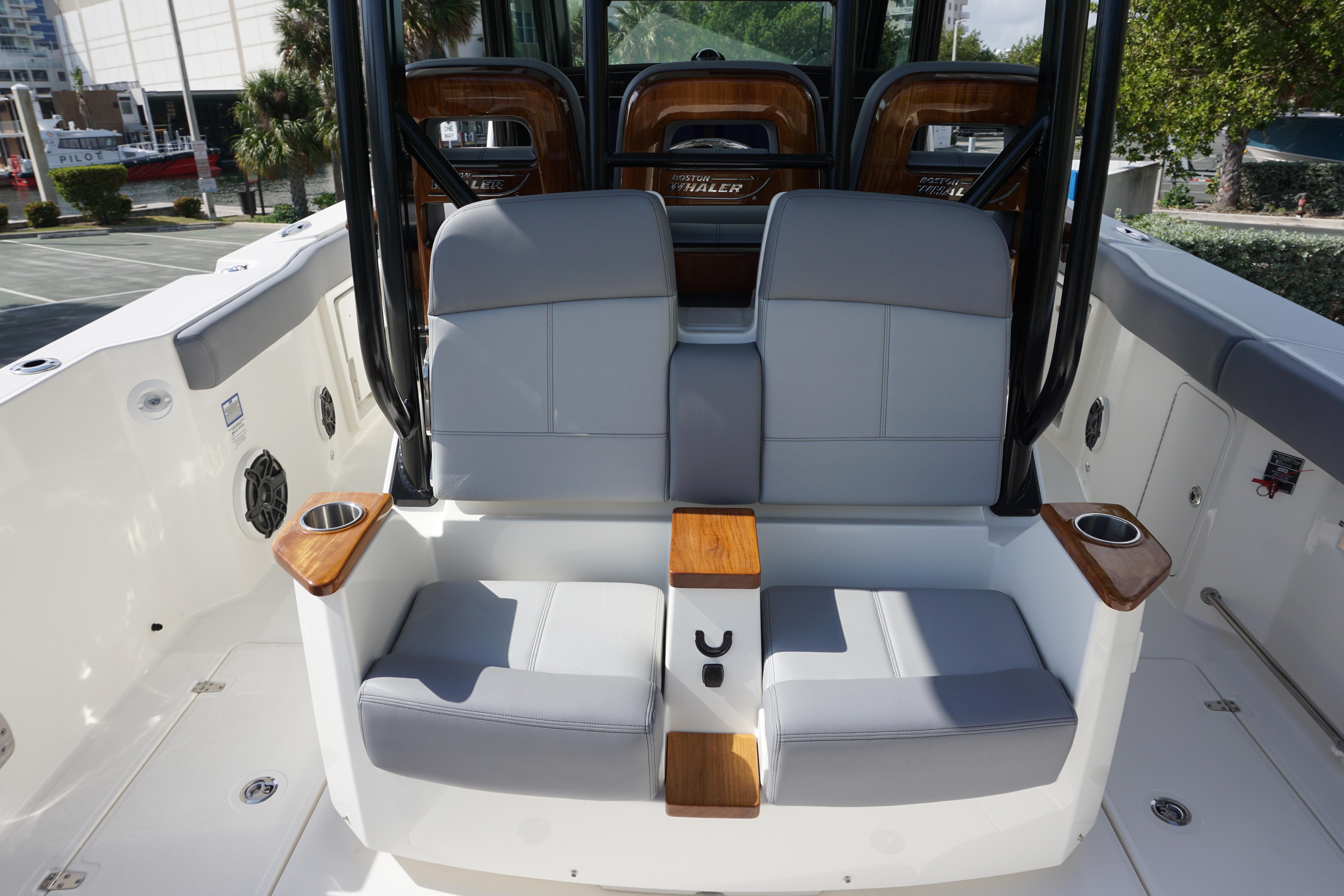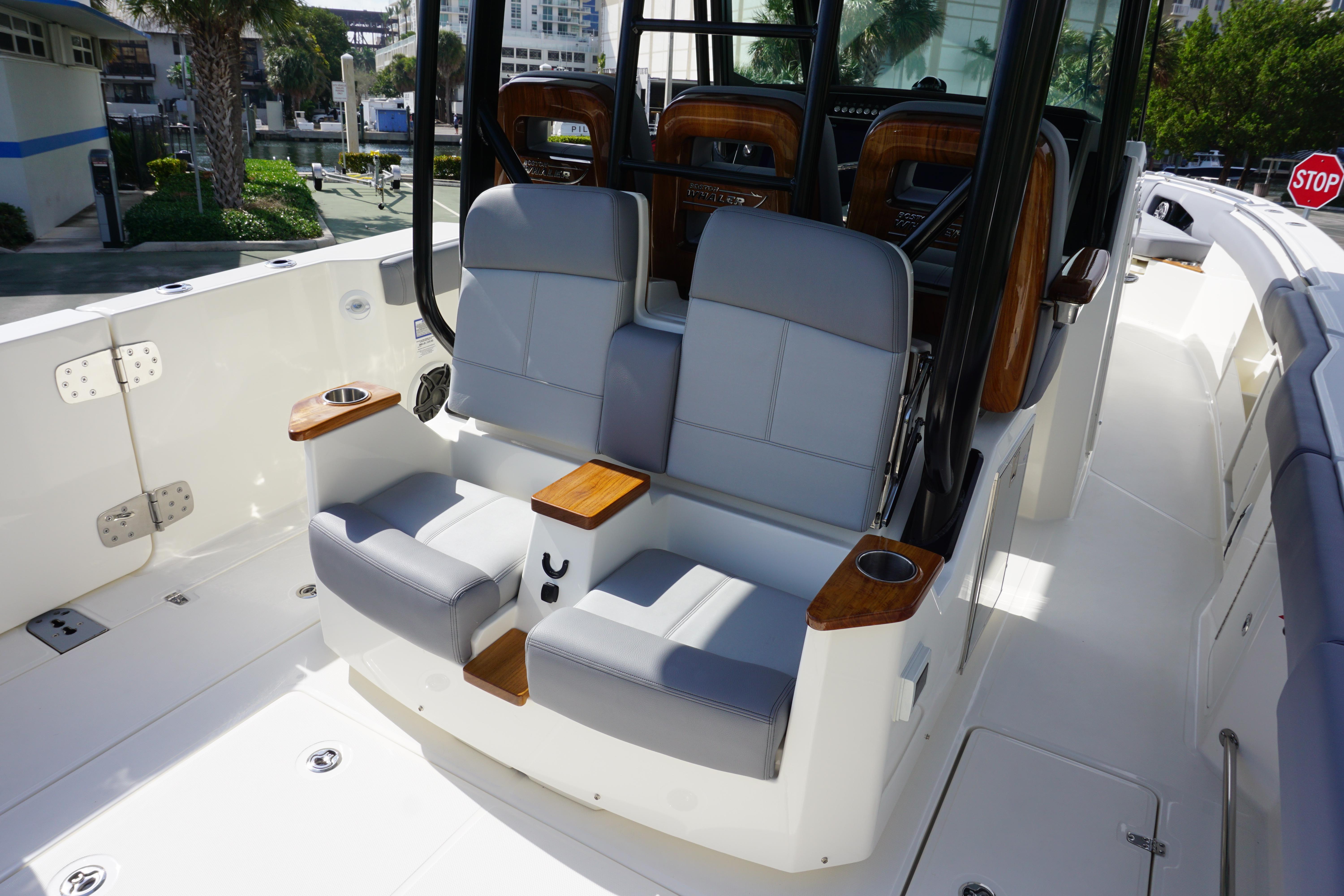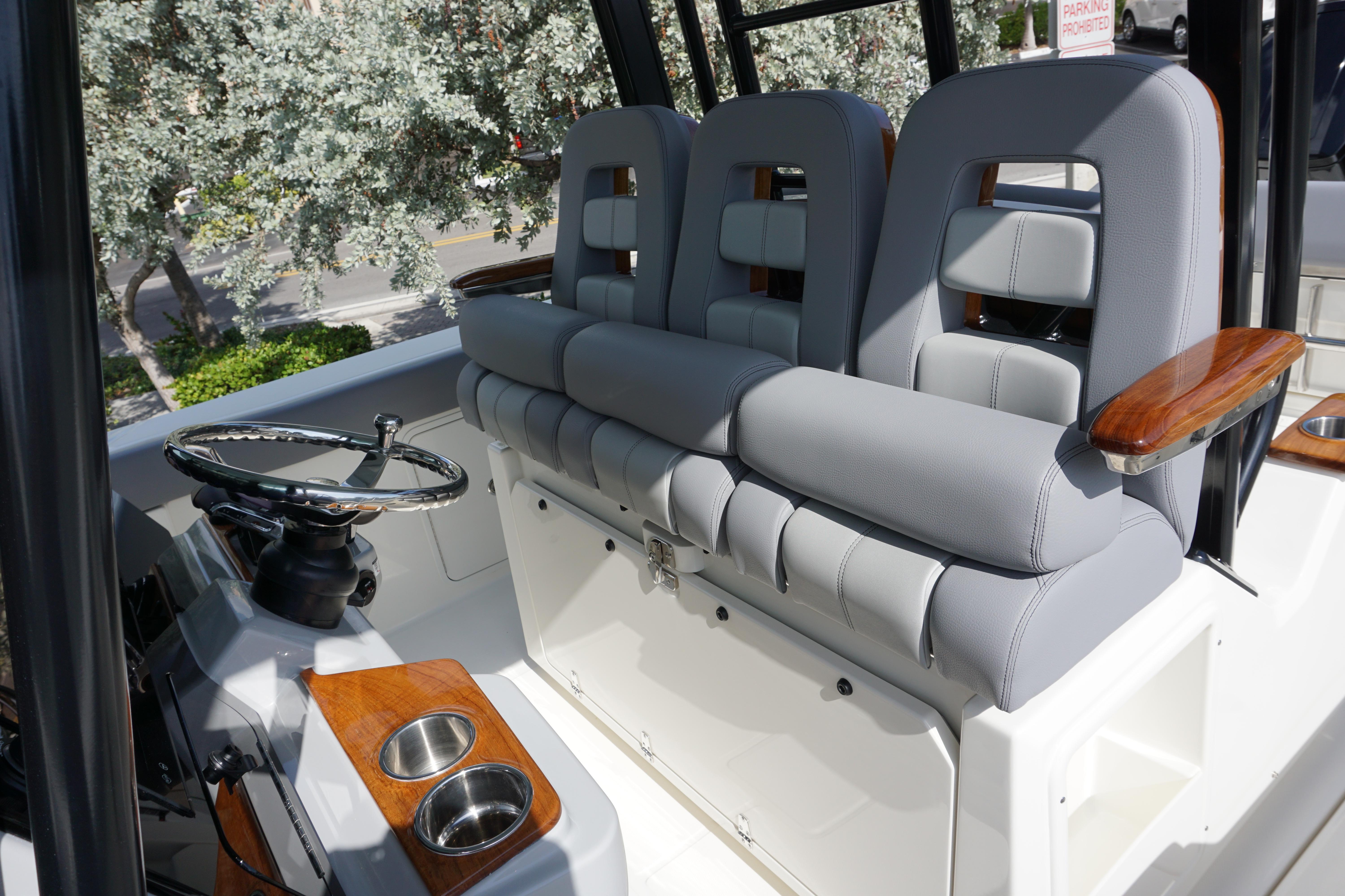 - Helm and companion flip up bolster style seats (3) with (2) fold-down armrests (center seat is mechanically adjustable fore and aft)