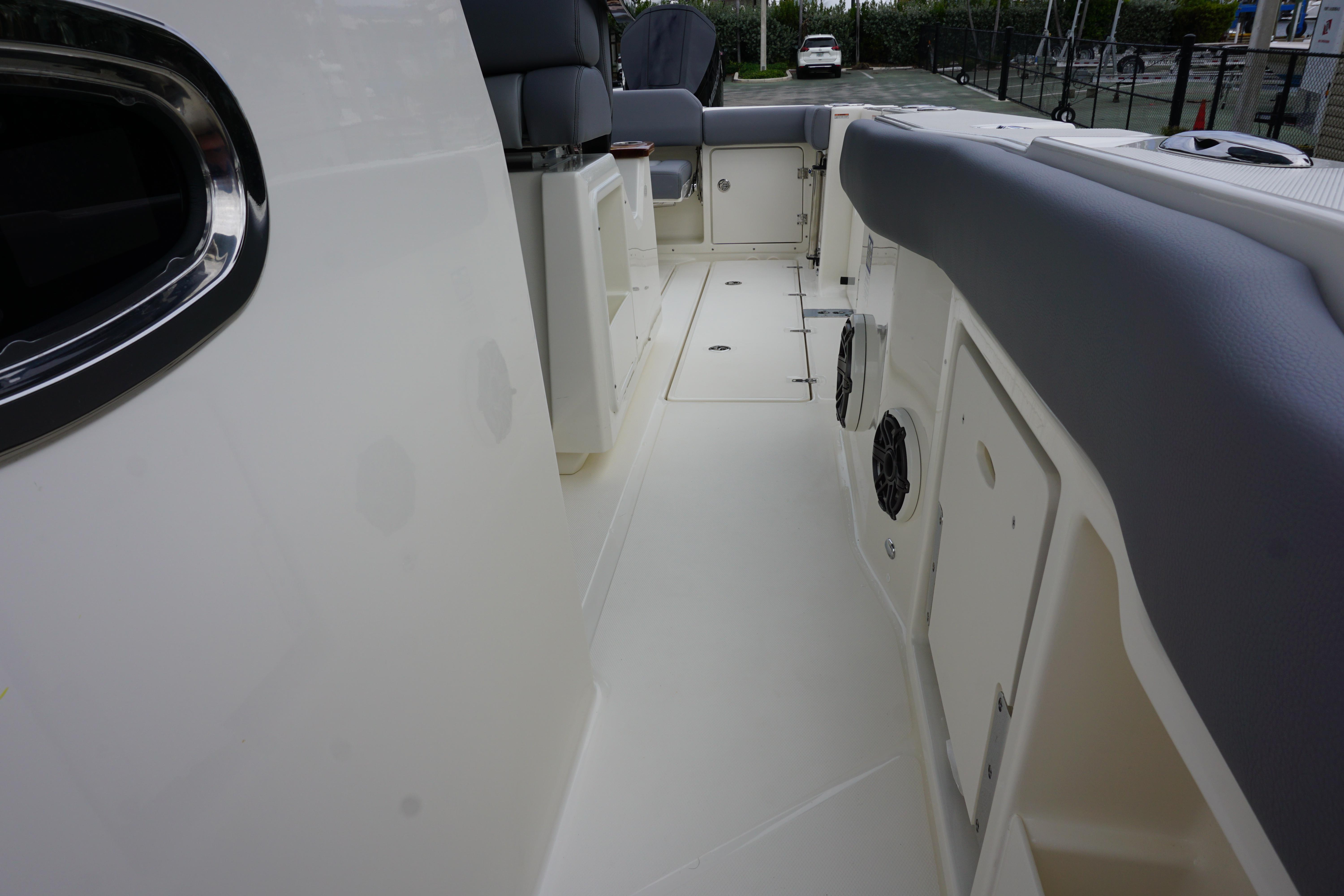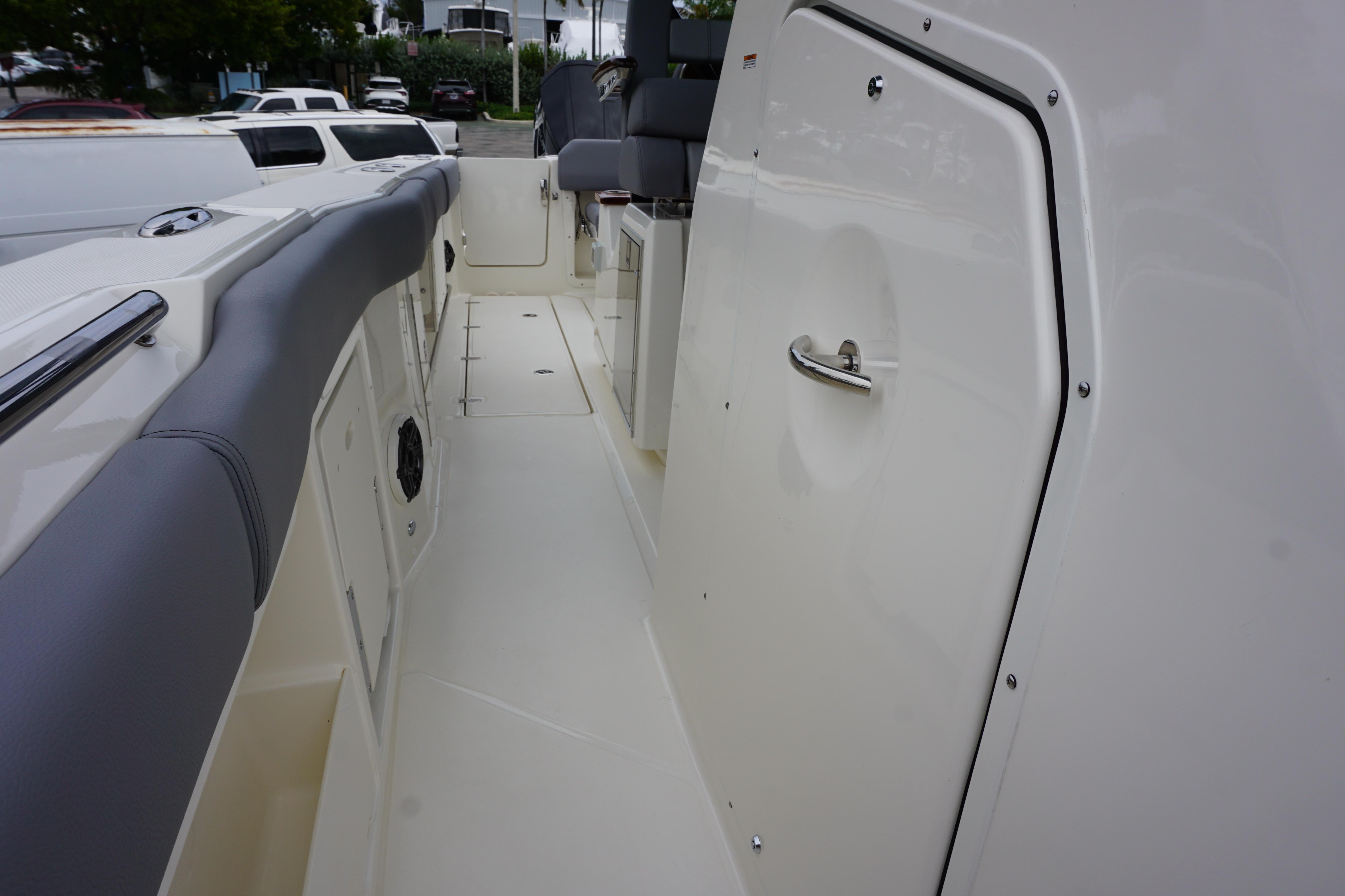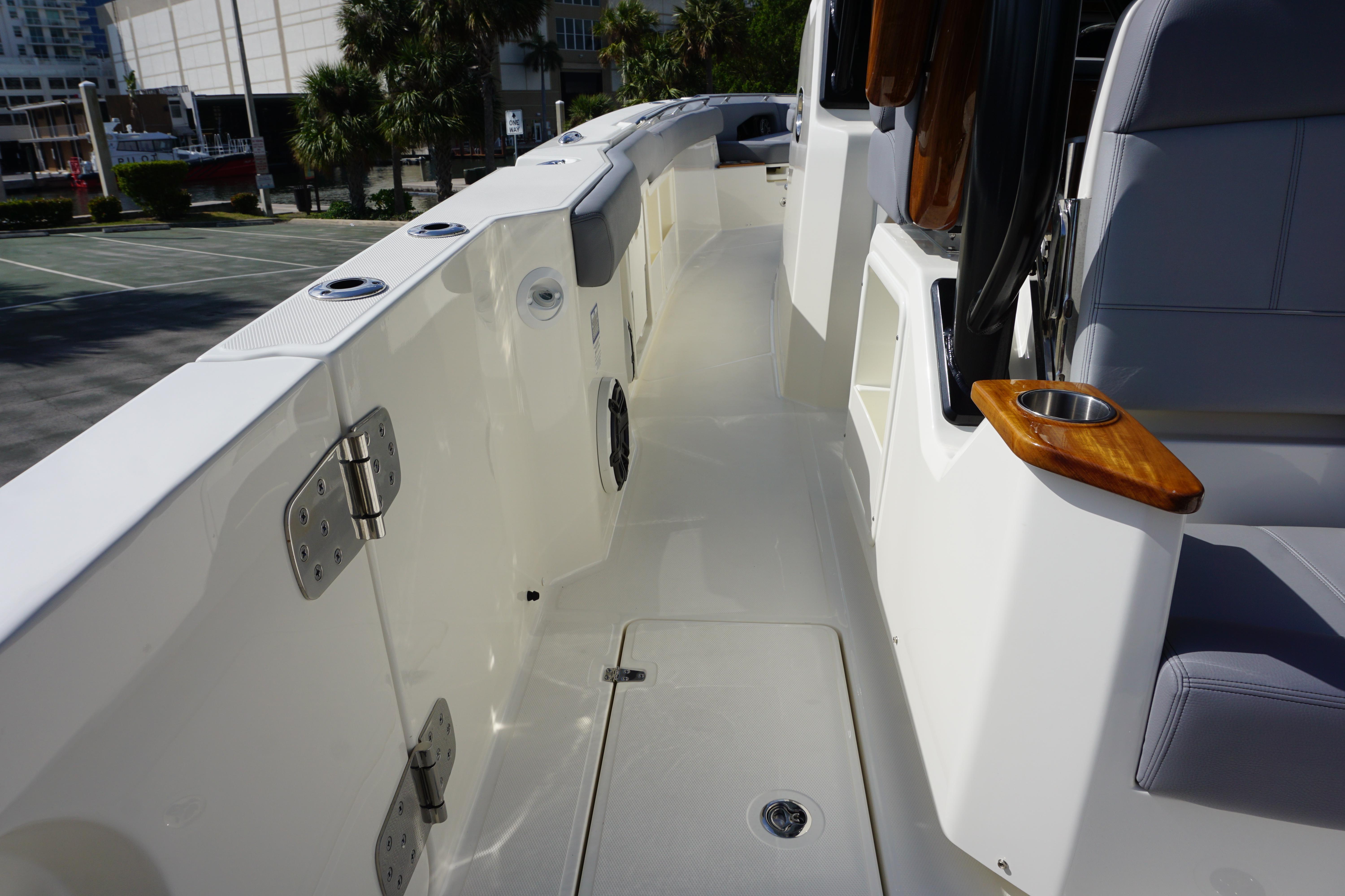 - Storage drawers (3) on port side of helm seating area (Replaced with shallow storage box with Gyro option or Port Refrigerator Option)