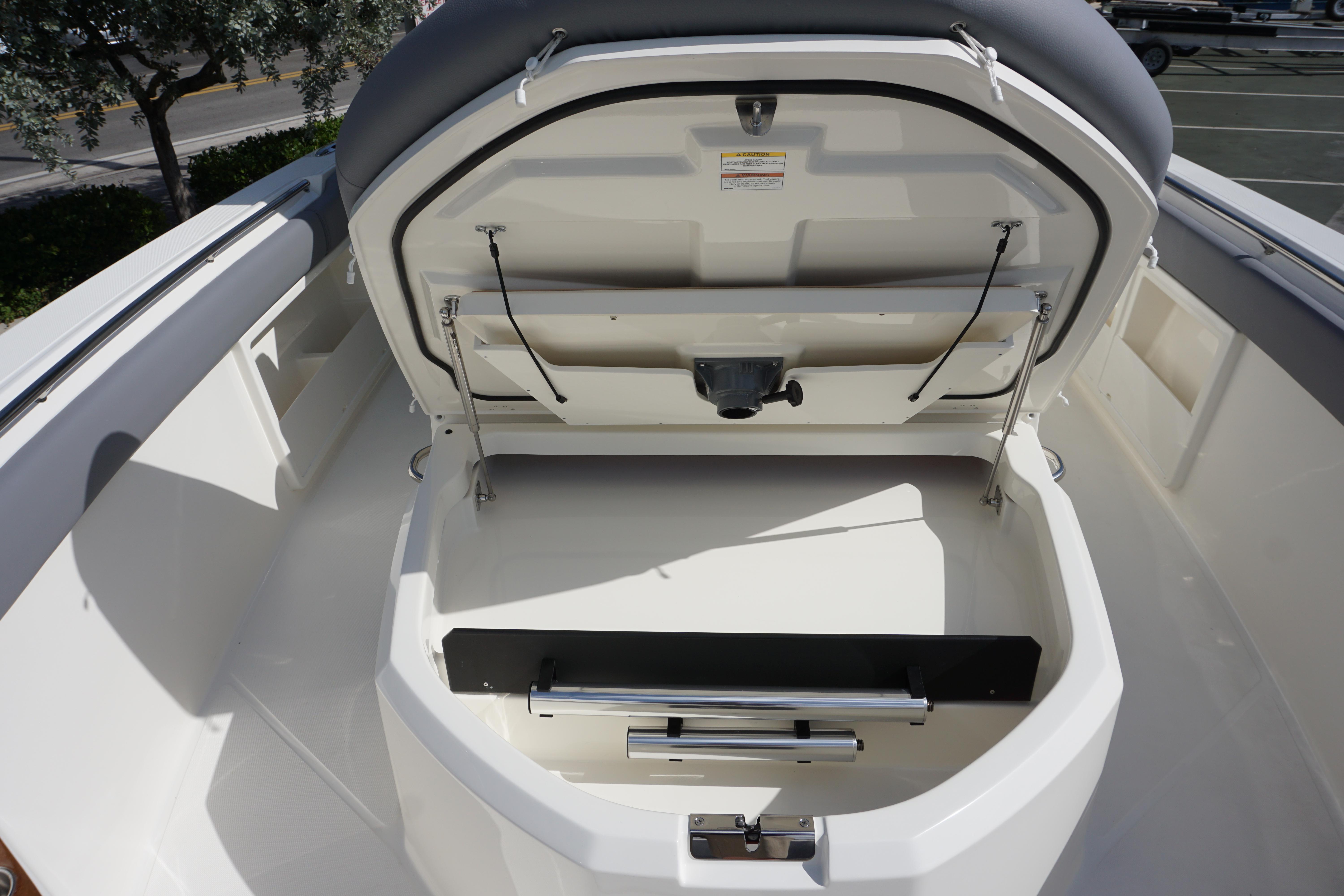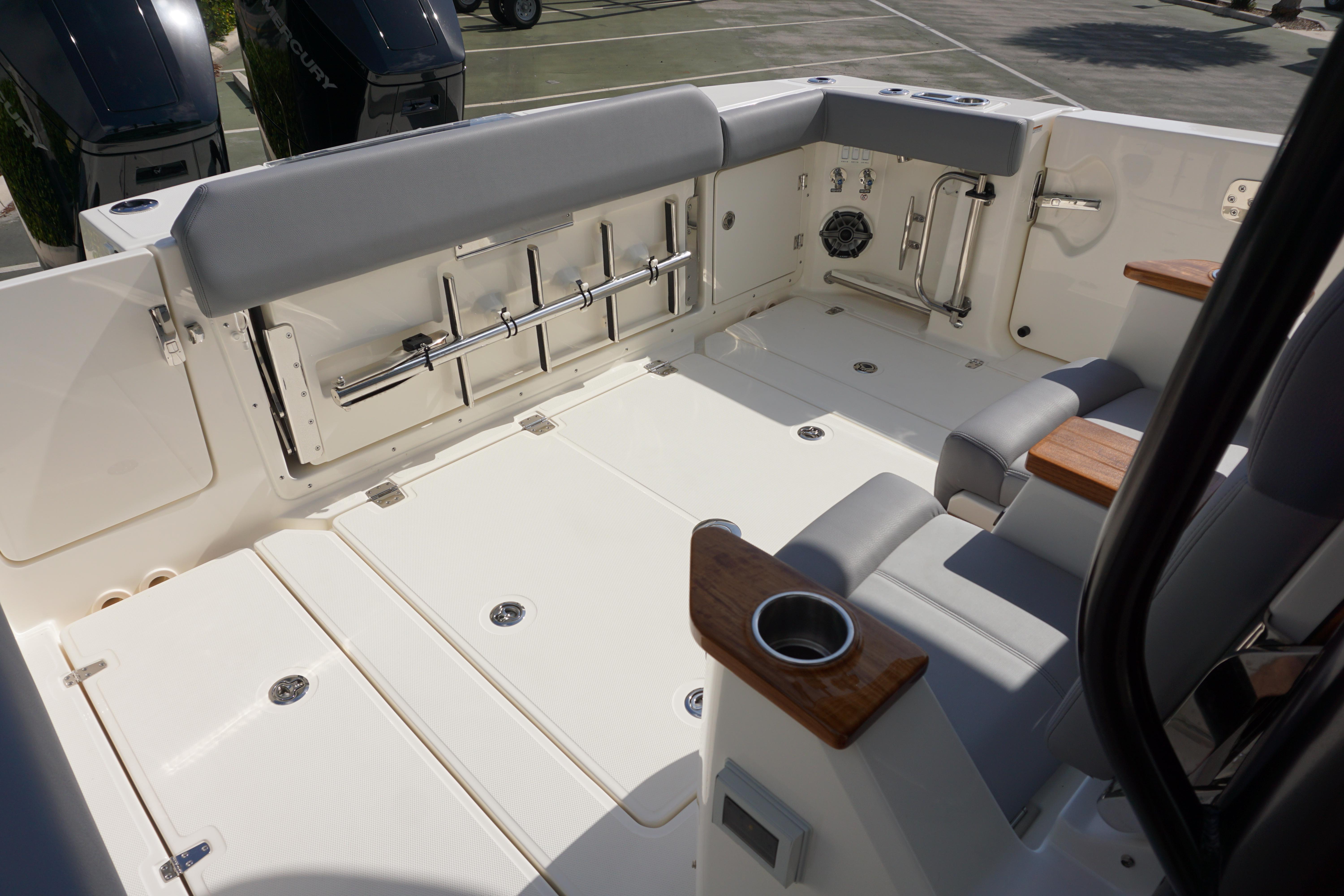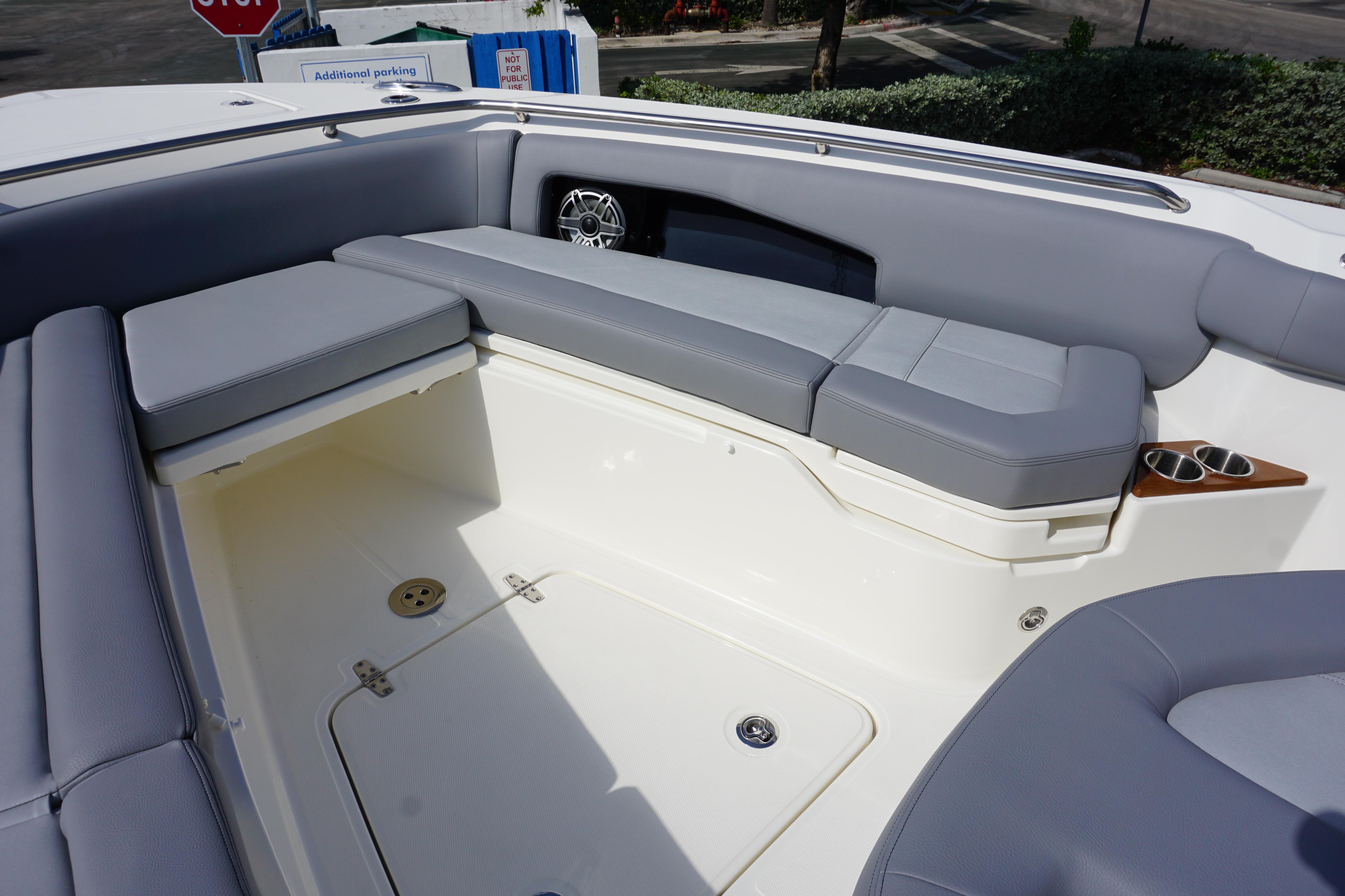 - Forward port and starboard seats with fold up lounge backrests, (4) drink holders, wireless stereo remote control, storage pockets in coaming with dual USB charging ports, fish box pump out switch