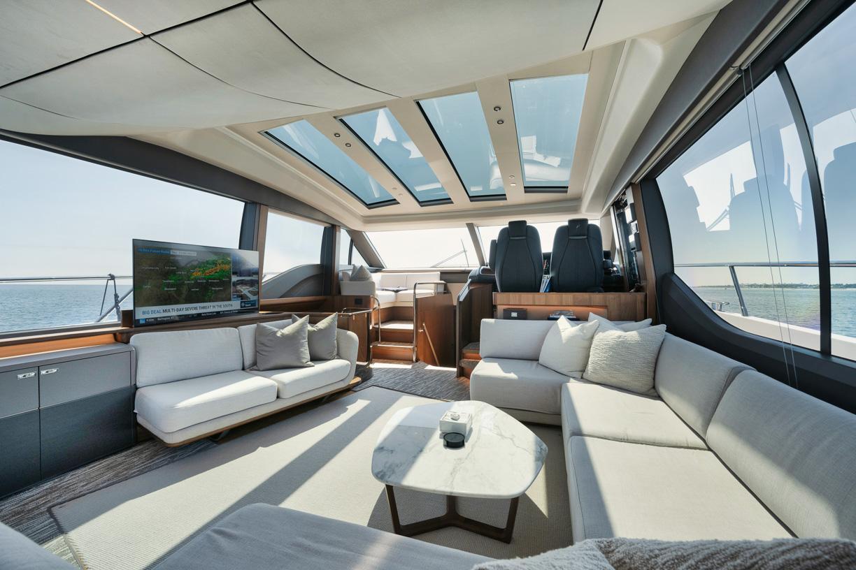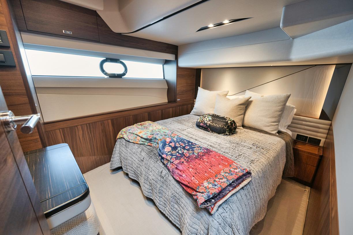- Foredeck sunbathing area with integrated adjustable teak headrests and storage. Converts to aft facing U-shaped seating area.