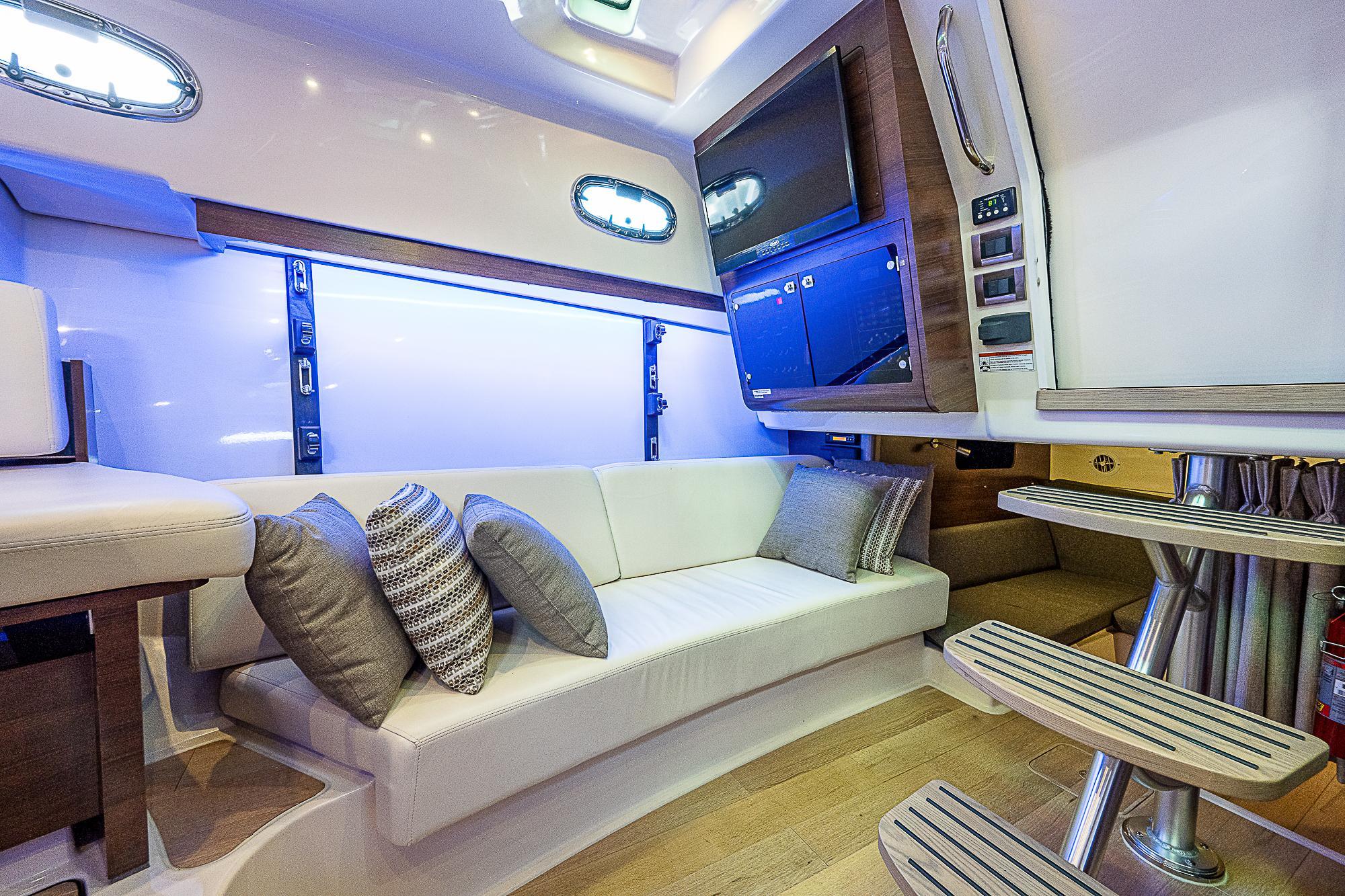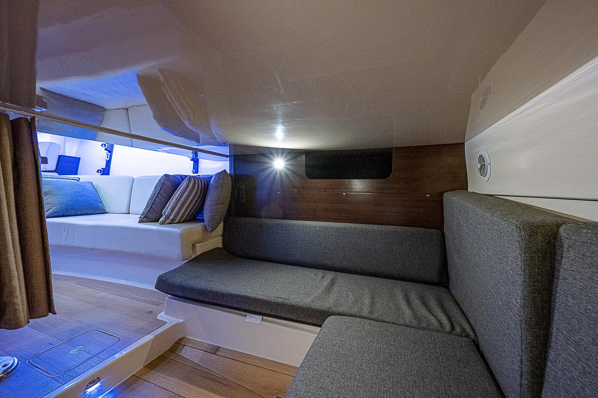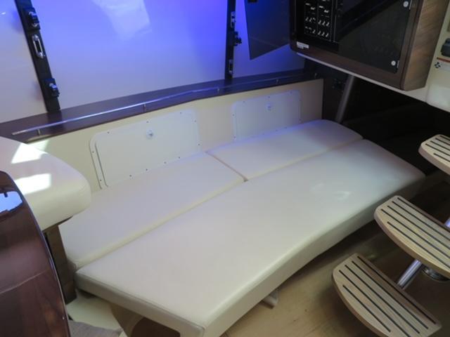 - Electronically controlled table to lower and seating comes together to create a queen berth