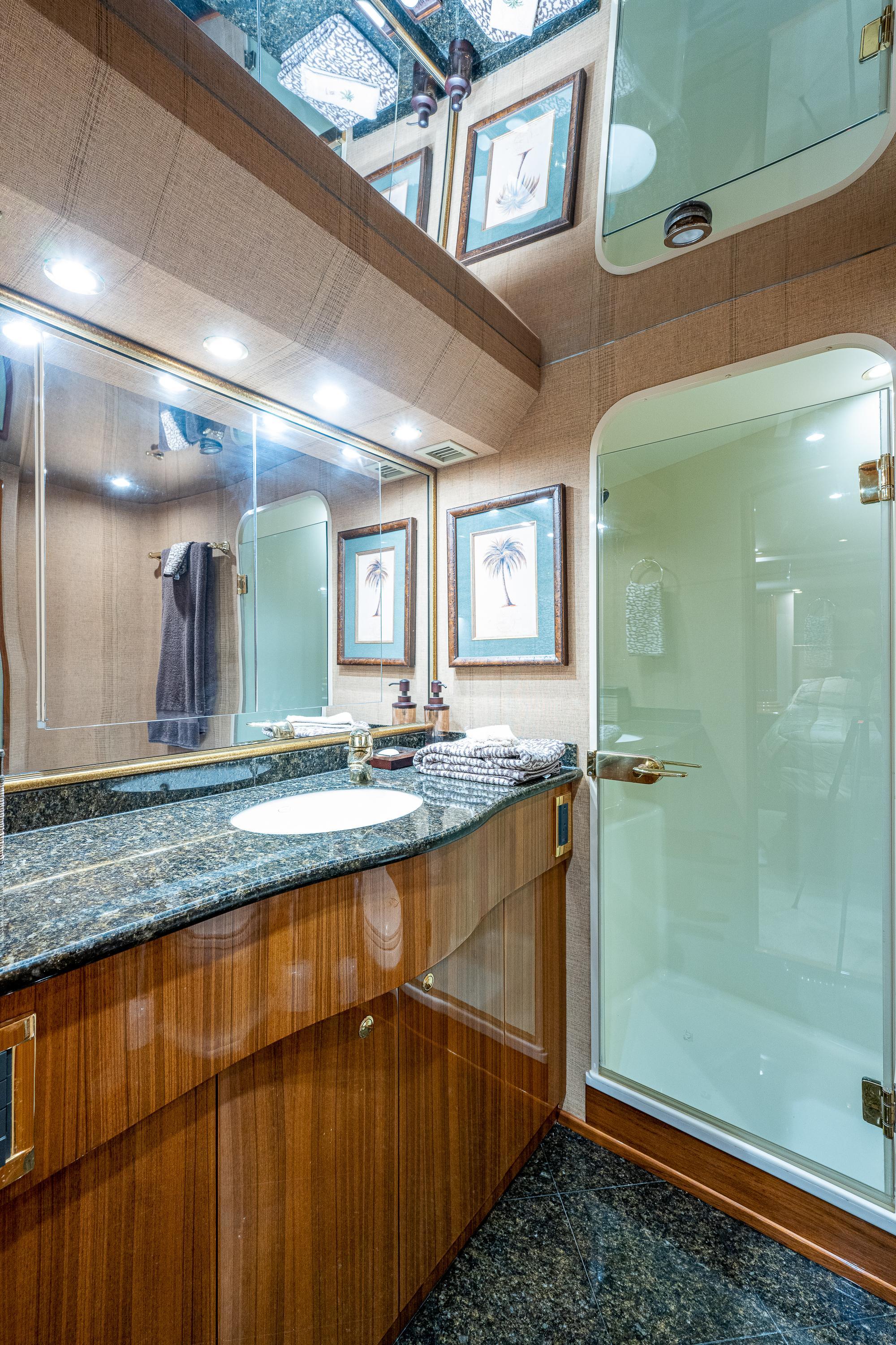 The salon on board is massive, with an open layout that offers a custom oversized dinette and table for additional seating and entertaining. The salon also boasts etched glass in the dinette area, granite galley and galley island surfaces, (3) bar stools with teak back rests and vinyl covering, and a day head just forward of the galley.