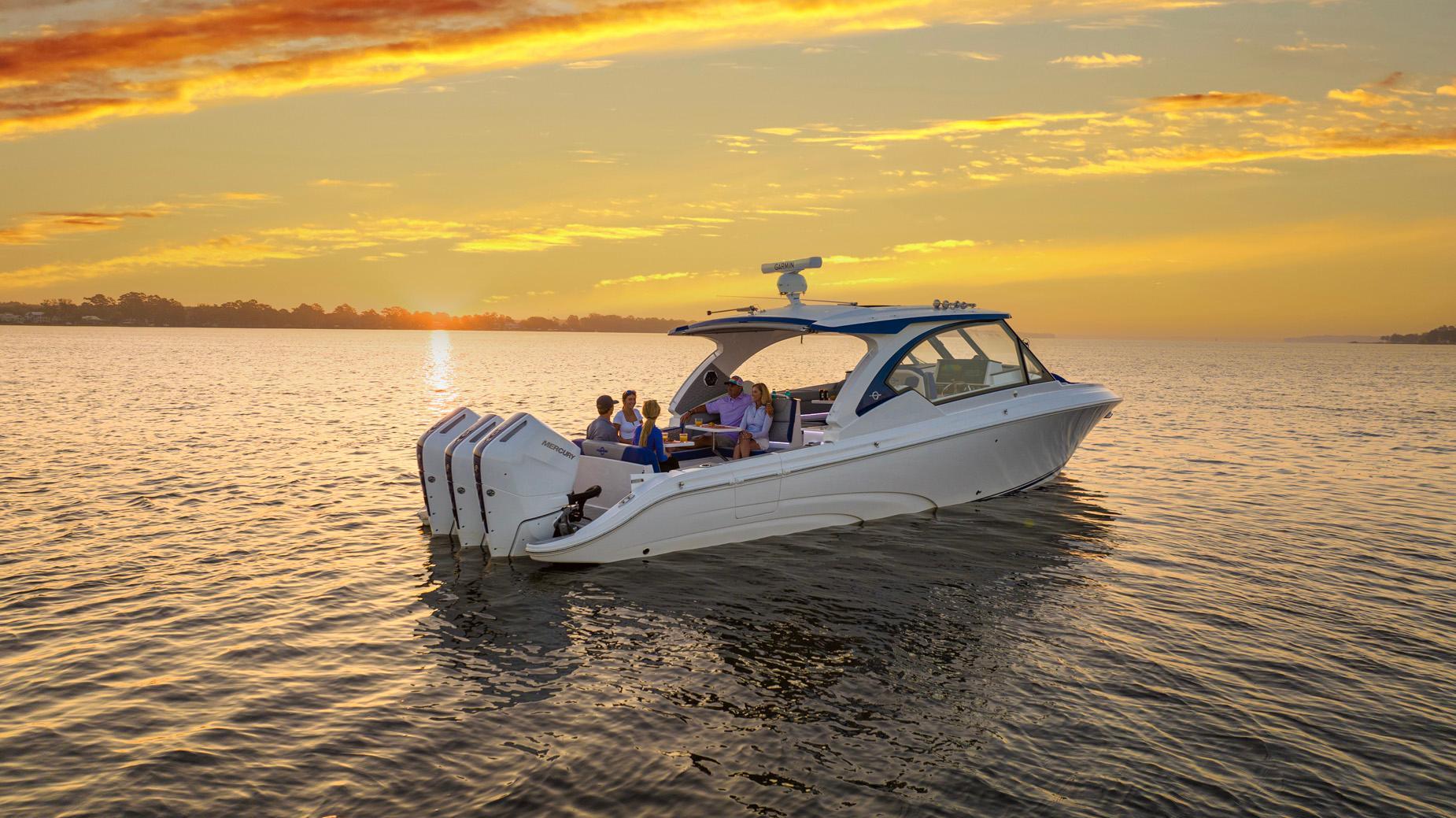 DimensionsLOA - 39' Beam - 11'3" Weight (Approx.) - 16,000 lbs. Fuel Capacity - 425 gal. Water Capacity - 40 gal. Holding Tank - 20 gal. Bridge Clearance - 98” Deadrise - 20.8° Draft - 28” Max Horsepower - Mercury Triple 450Rs
