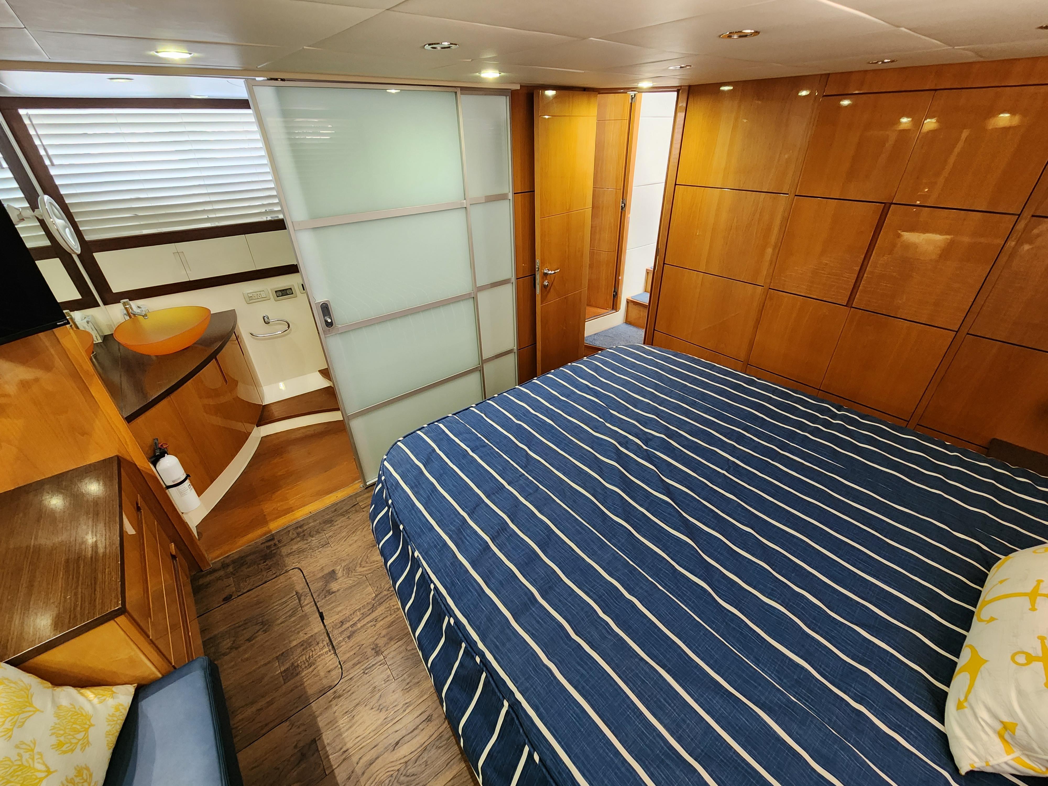 The master stateroom is aft of the salon and is full beam amidships; there is an athwart ship king berth (new custom mattress and cover), settee, walk-in locker, ample drawer storage, TV, super stereo, new hardwood floors, port lights with shoji screens and a large en-suite head with large stall shower.