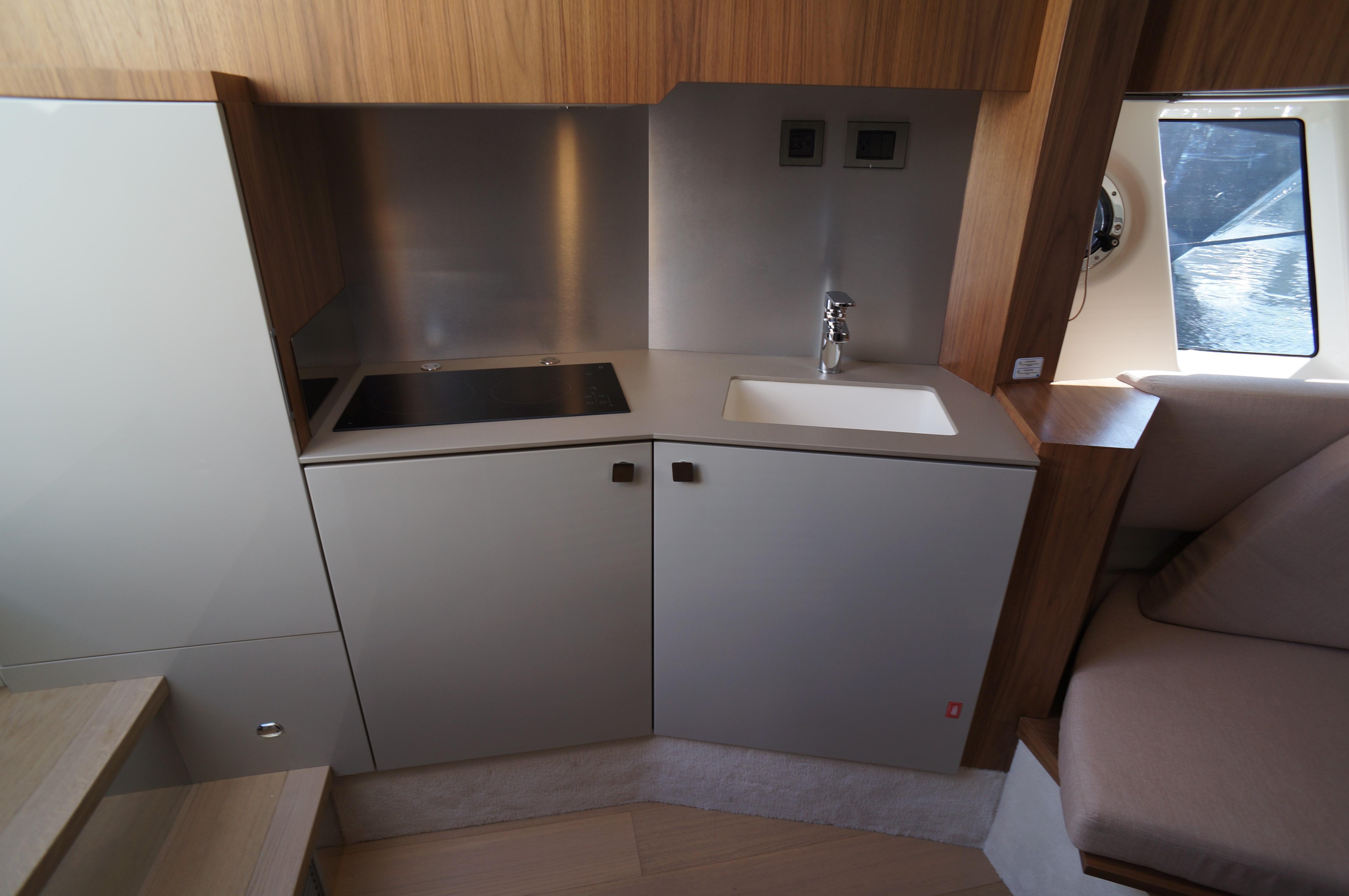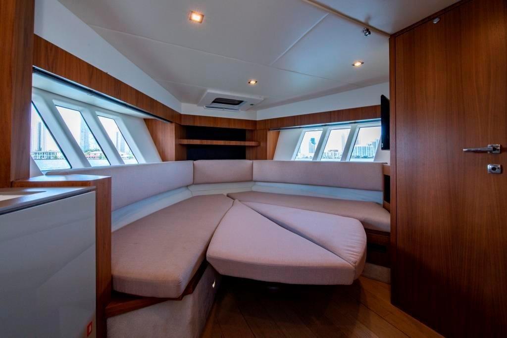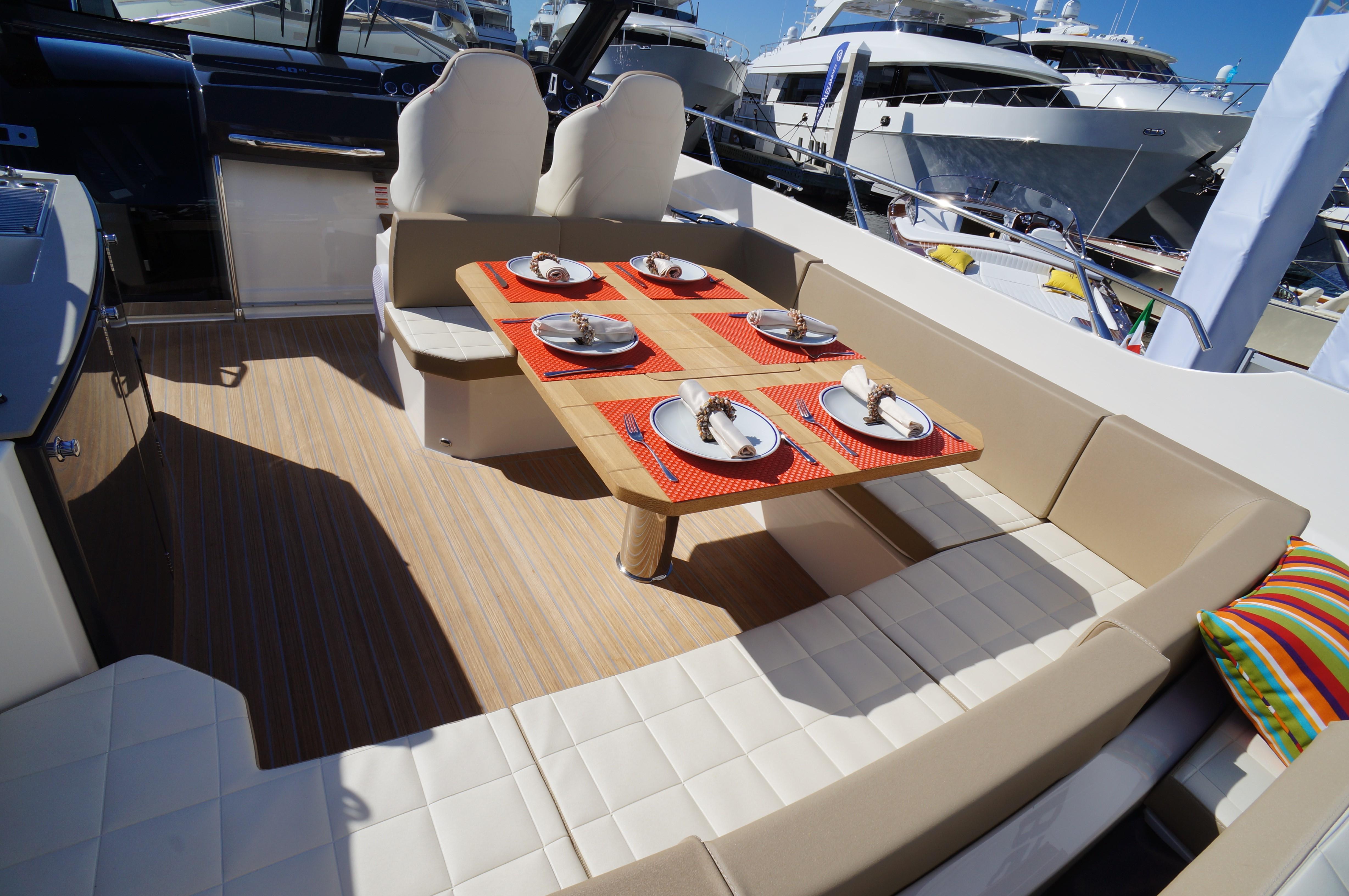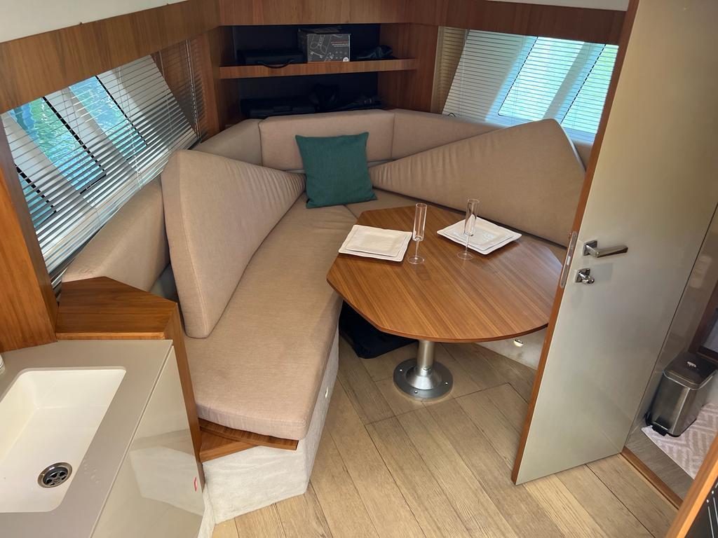The key to understand this project is all in its name “Sport Line” and its sports nature. You get on board through a small platform and then you enter the cockpit from the safe side passage, well protected by an enveloping gunwale. The U-shape sofa with dining table hosts 6 people in true and full comfort. The kitchen with its special furniture helps to corroborate the on-board pleasant atmosphere with its hob, sink and fridge. The spaces on the deck are enriched by the second bow sundeck with adjustable backrests, which can also comfortably host 3 people.