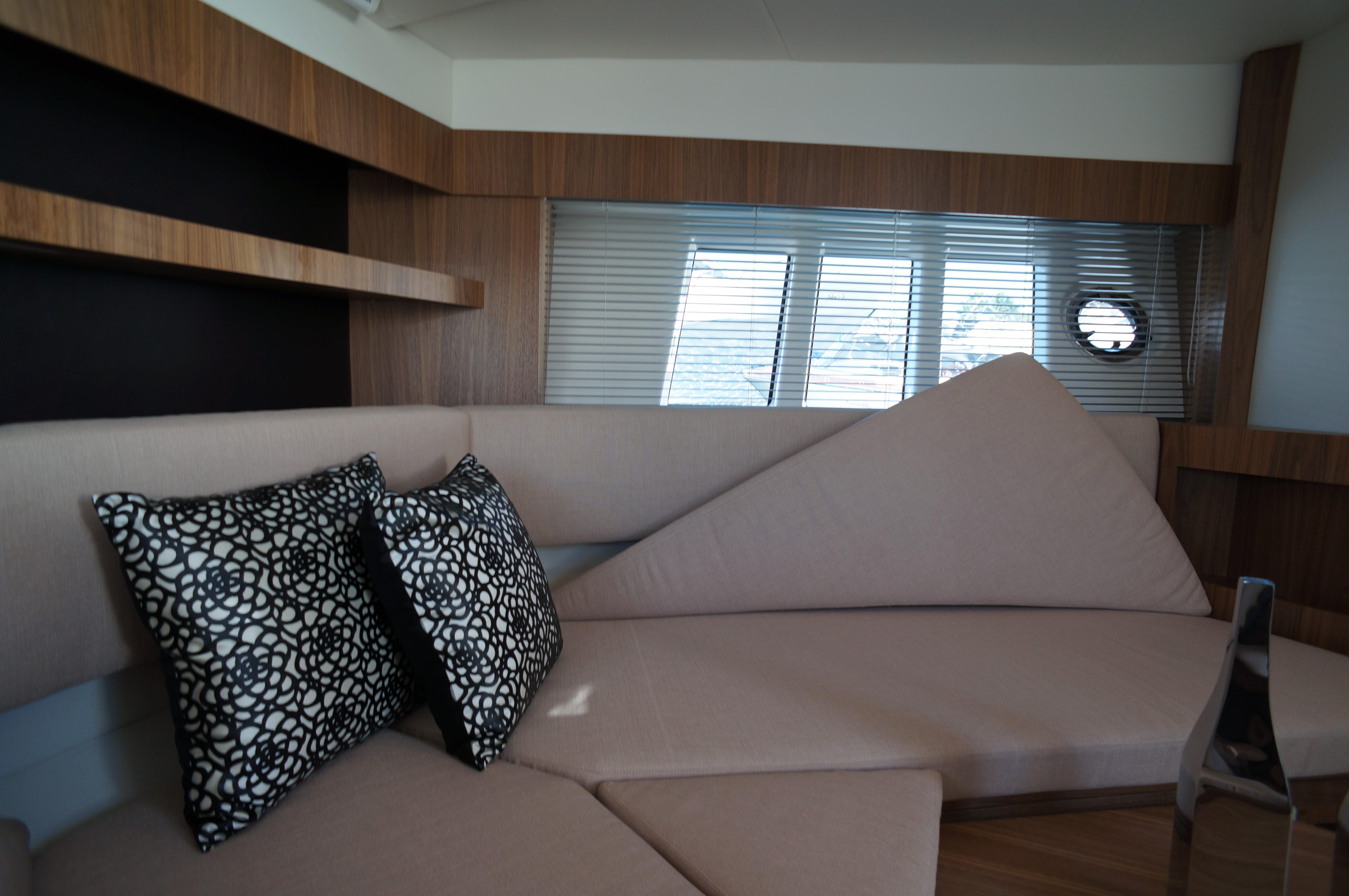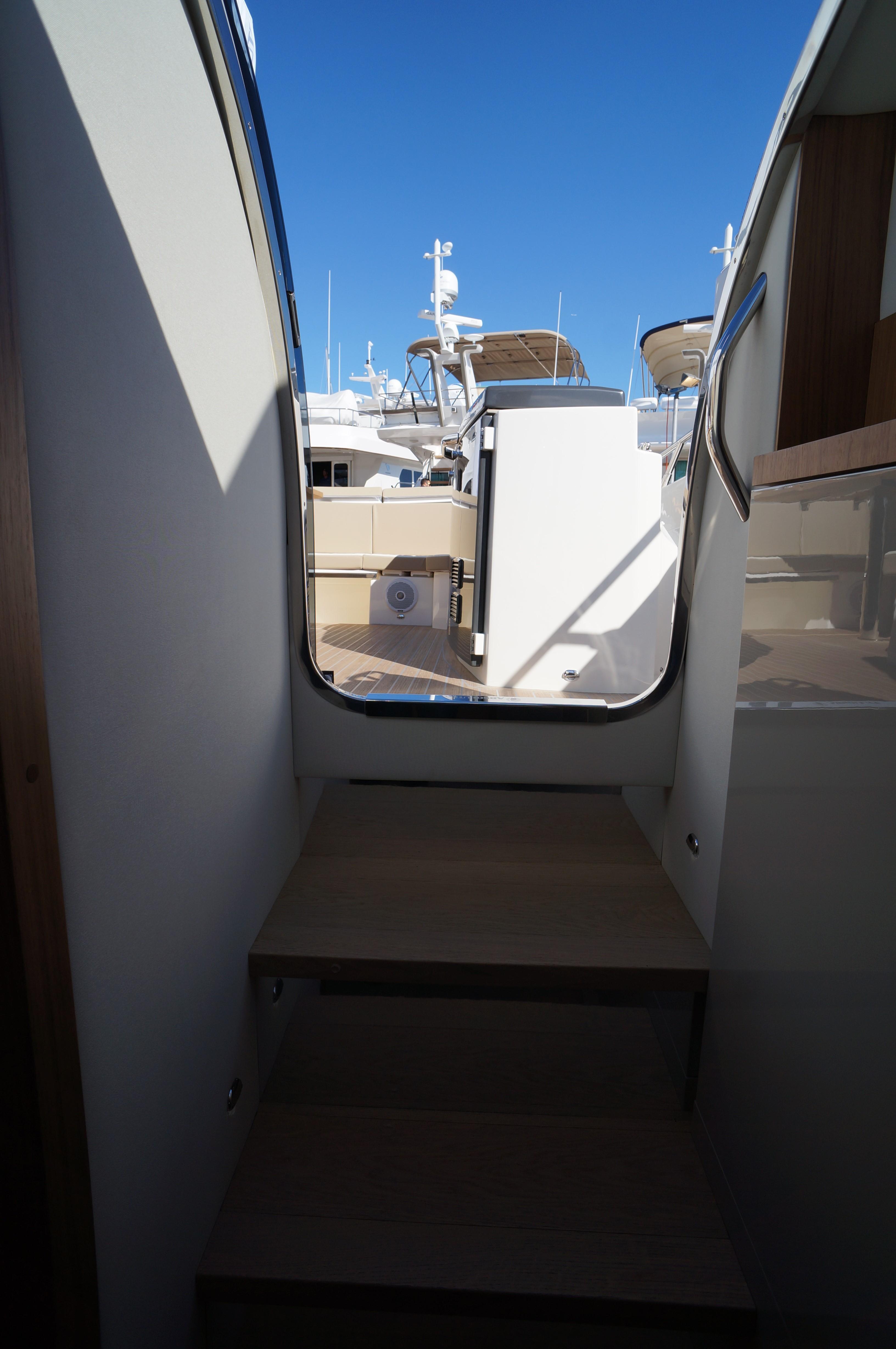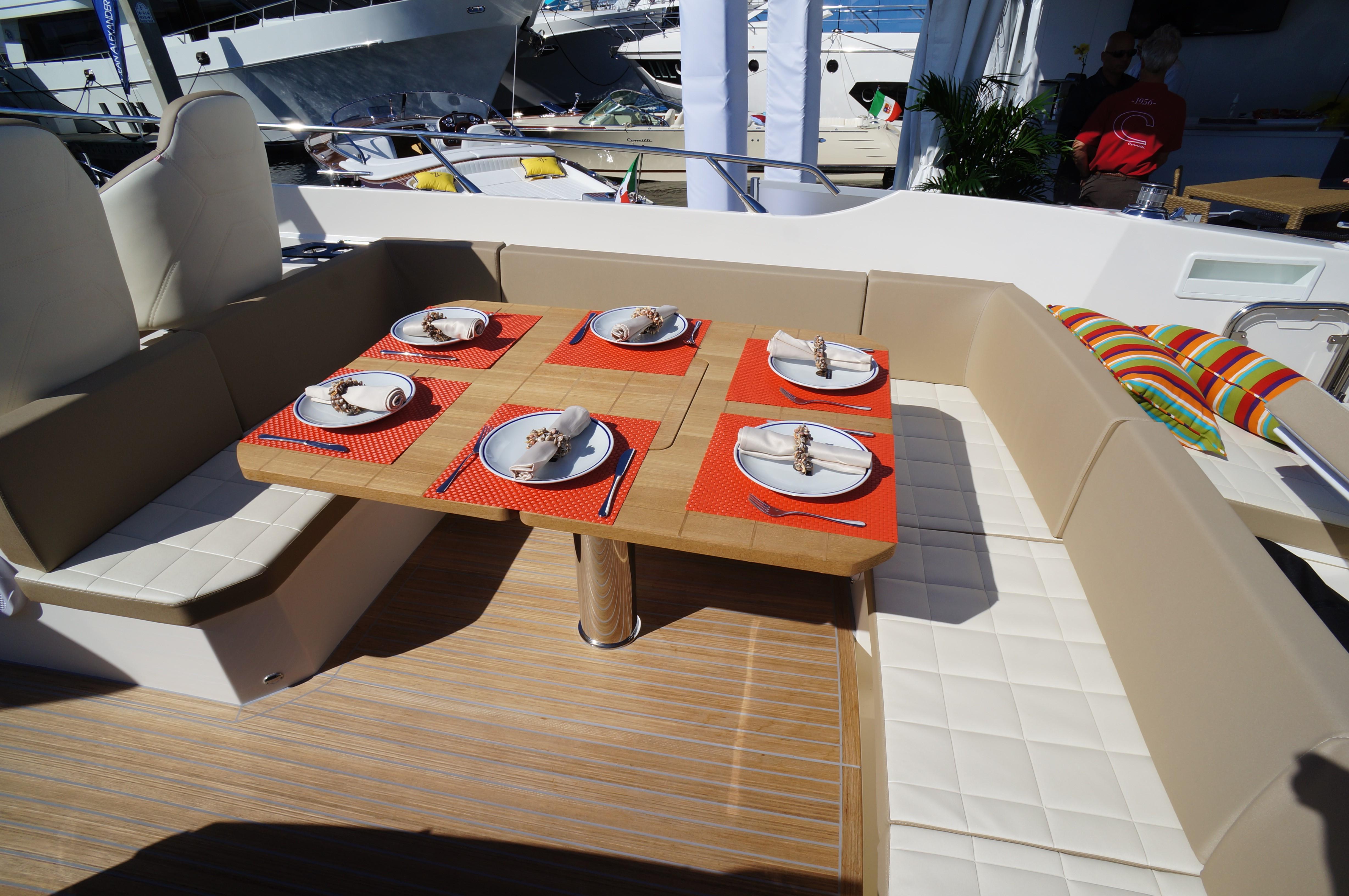 The key to understand this project is all in its name “Sport Line” and its sports nature. You get on board through a small platform and then you enter the cockpit from the safe side passage, well protected by an enveloping gunwale. The U-shape sofa with dining table hosts 6 people in true and full comfort. The kitchen with its special furniture helps to corroborate the on-board pleasant atmosphere with its hob, sink and fridge. The spaces on the deck are enriched by the second bow sundeck with adjustable backrests, which can also comfortably host 3 people.
