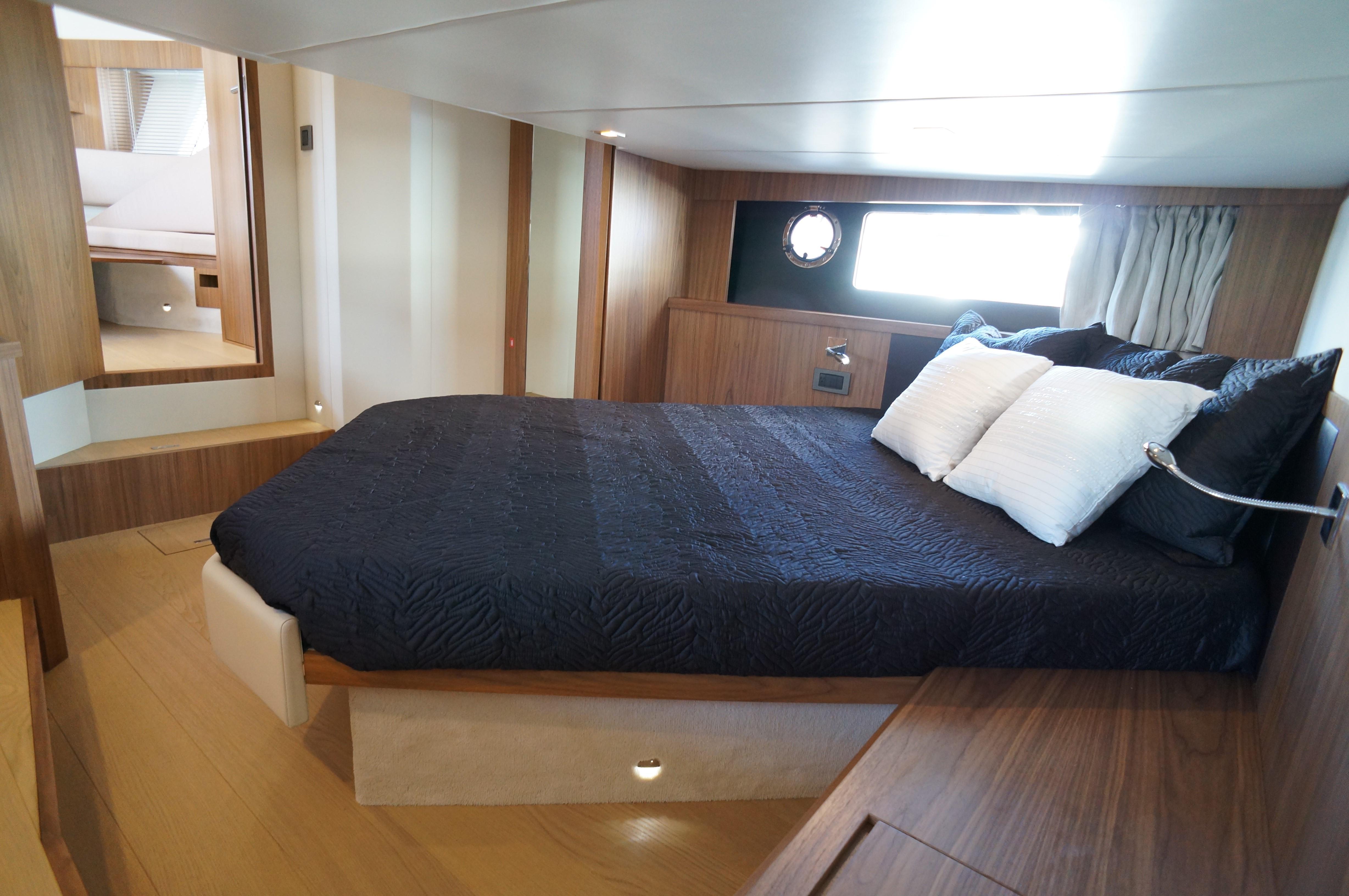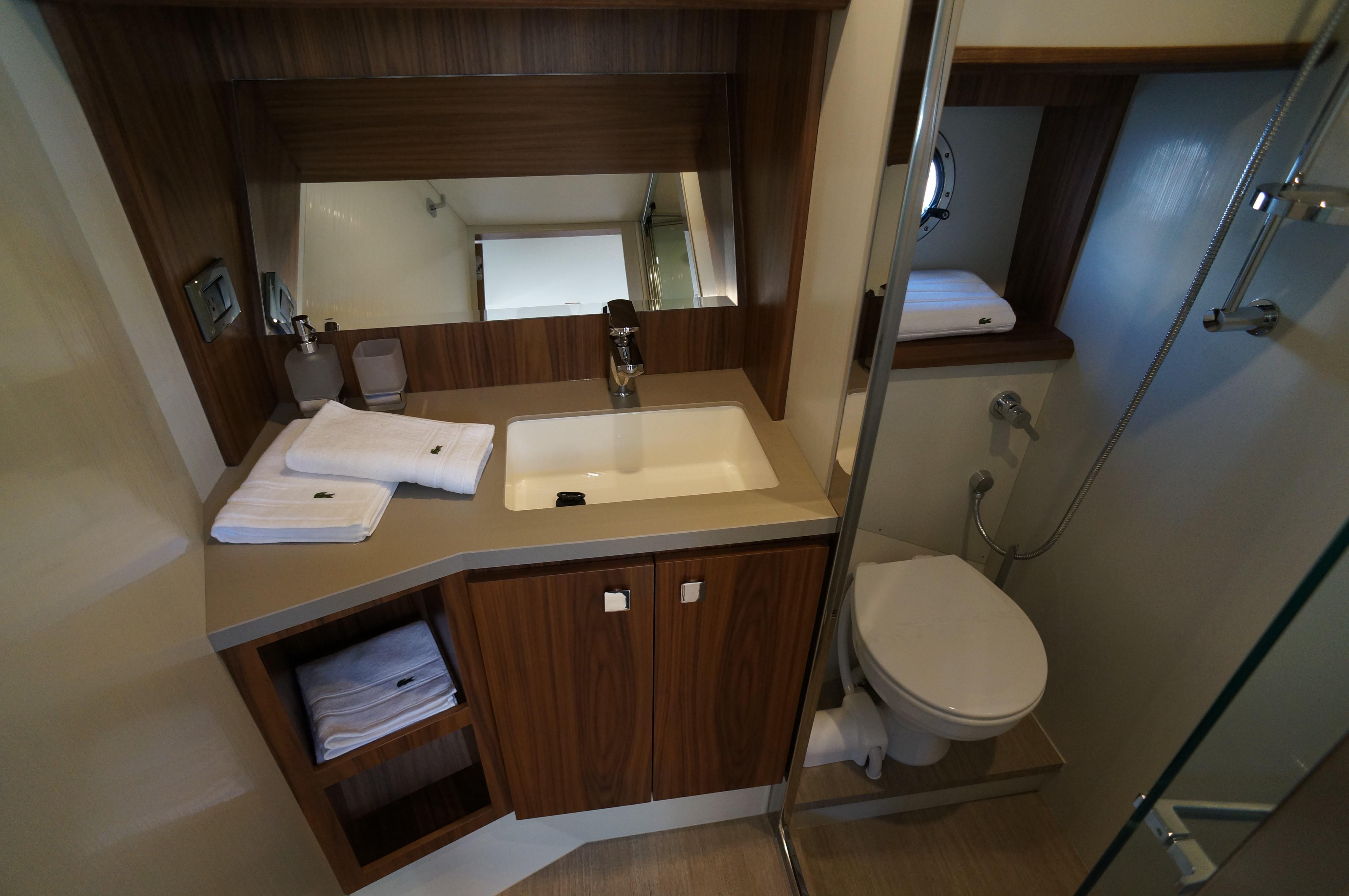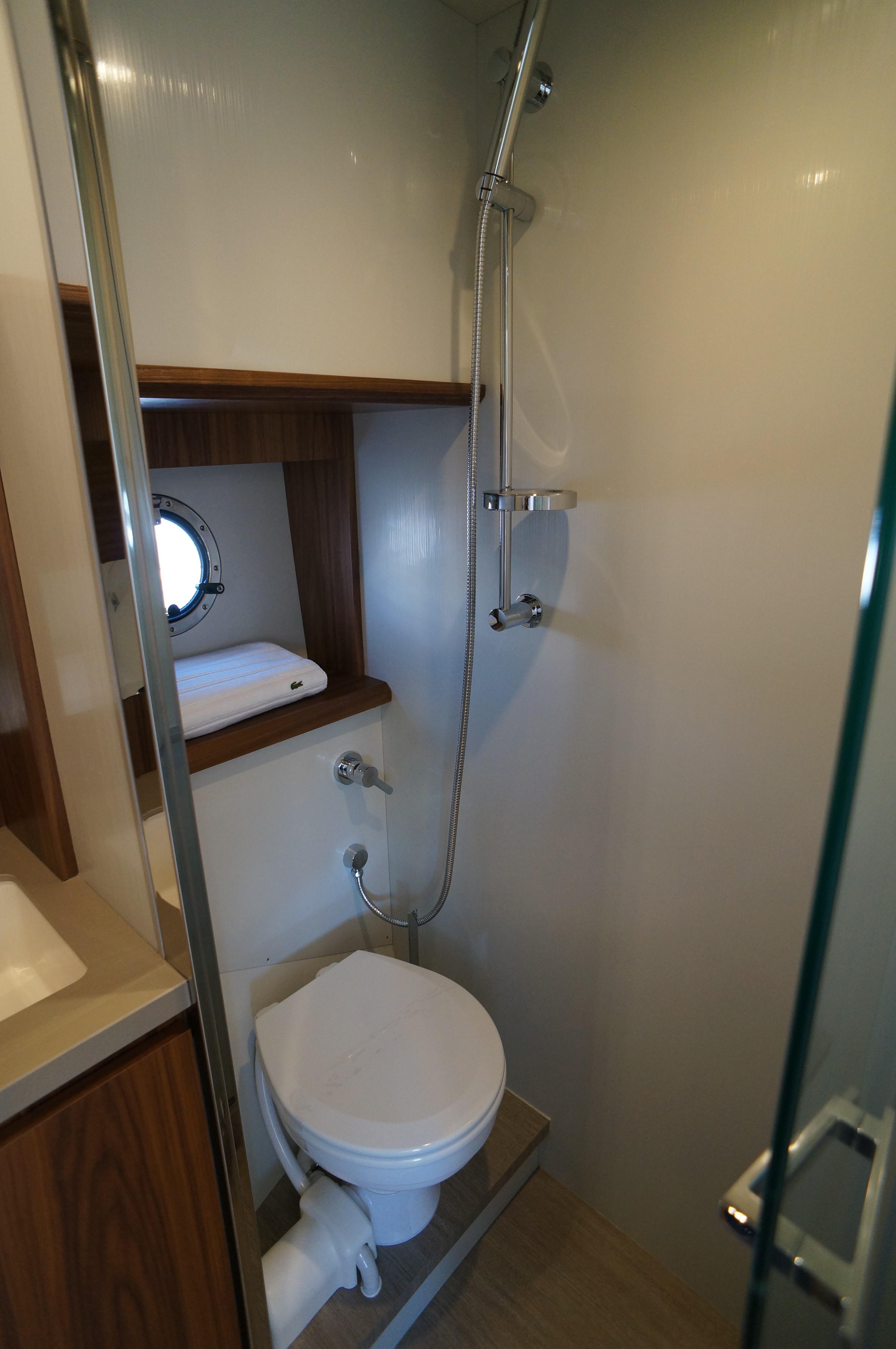 Coming back towards aft, under the cockpit, you can find the second strong attraction of the project: the separate full-beam cabin with wide double bed and spectacular windows just above the waterline. Worthy of mention, the full-functional head and shower at starboard.