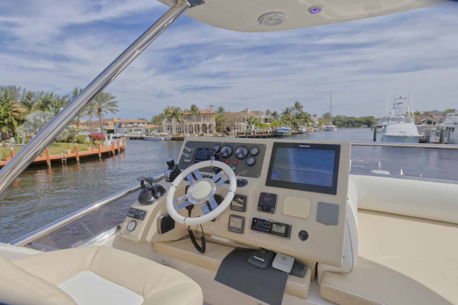 The lower helm, positioned starboard, and upper helm, situated port, are both equipped with factory-installed Raymarine Platinum Package technology. This includes two 15" touchscreen displays (flybridge has a single), separate auto-pilot control, Tridata instrument display, twin Seakeeper LCD panels, quick chain anchor counter, LCD Motronica display, Xenta Joysticks, ZF Marine propulsion gears, electric window controls, and video cameras providing views of the engine room, bridge, and aft deck areas.