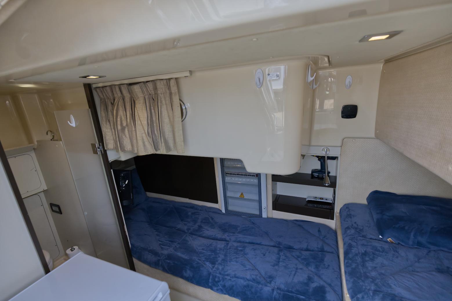 The VIP stateroom, located forward, offers a private en-suite head and 6 port holes, 2 of which open. It features an island queen berth with a beautiful leather headboard and LED reading lights. The spacious en-suite head includes a standing/stall shower and vanity with a large drawer below.