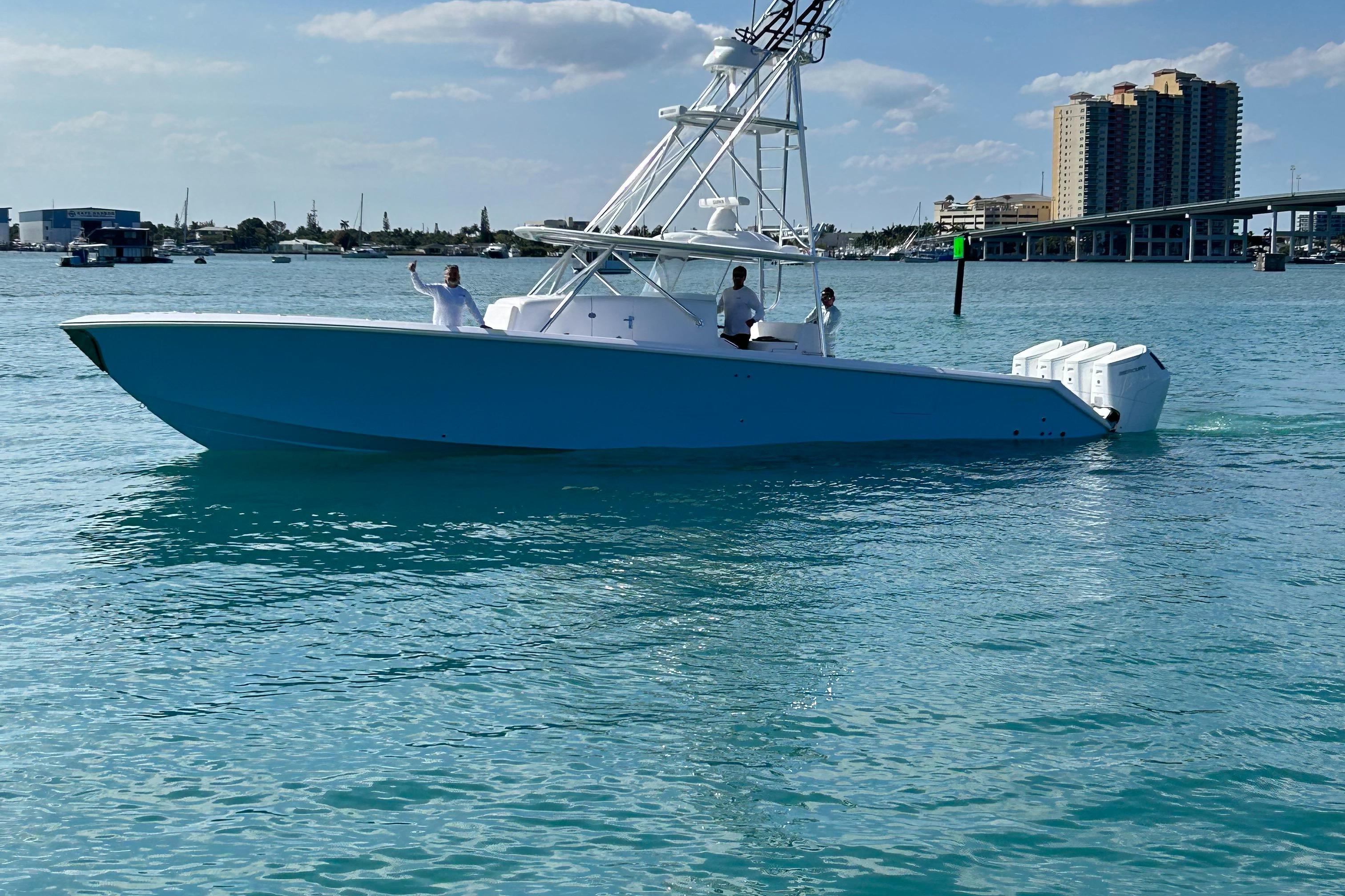 OptionsNorthern Lights 9KW marine diesel gen set with sound shield Sea Keeper 6 Gyro stabilizer Multiple refrigeration packages available Multiple engine packages available (Triple or Quad configurations ) Multiple Hardtop and tower options available full gap tower/ marlin tower Brushless bow thruster ( Can be paired with Mercury Joy Stick ) Stainless steel anchor windlass mounted in anchor locker, flush mounted stainless steel anchor chute with multiple anchor styles available Single or double side door applications available Multiple center console interior designs available Available interior console option features Dinette seating with drop down pedestal to convert into double berth, galley with microwave, cooktop and sink as well as multiple refrigeration options. Enclosed head compartment with fresh water marine head and molded in shower stall sink and medicine cabinet