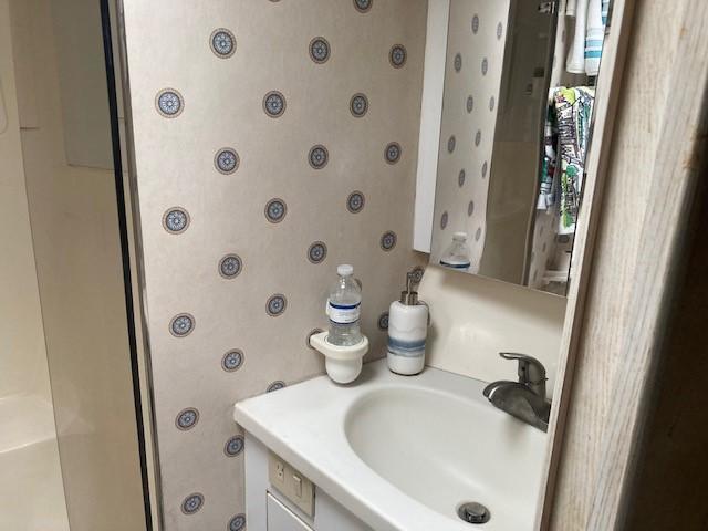 - Corian sink with brushed nickel designer faucet, soap dispenser and hand washer