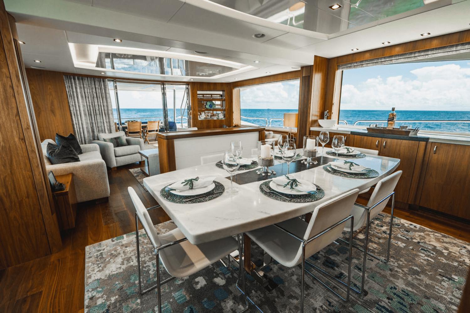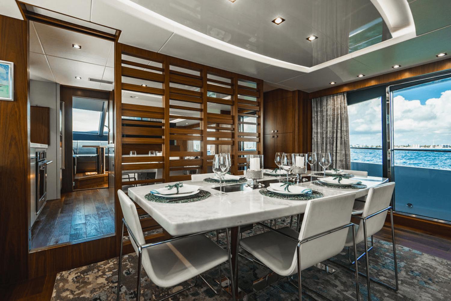 Sunseeker. The layout on Gallivant allows access port and starboard through the salon around the couches and dining table. This allows for an unobstructed traffic patten. There are two couches in the salon, one port and one starboard. Coffee tables are situated in the center of the salon and two lounge chairs are facing aft and two facing forward between the couches. The entertainment center is located behind the forward two lounge chairs in a custom cabinet that contains the salonTV. The TV is on a lift and is hidden within the cabinet when not in use. The cabinet also provides a nice separation between the dining table and the salon. Forward of the salon is a large marble dining table for eight. To the starboard of the dining table is a floor to ceiling sliding glass door that provides ample sunlight and fresh air into the room if desired. To port of the dinning table is a large custom wet bar with ice maker, wine cooler, and marble counter top. Forward of the wet bar is a pocketing door that provides access into the galley. This is a great location for the crew to access the dining area as well as salon discretely. On the starboard side of the dining table there is a hallway leading to the owner and guest cabins, day head, and galley lounging area.