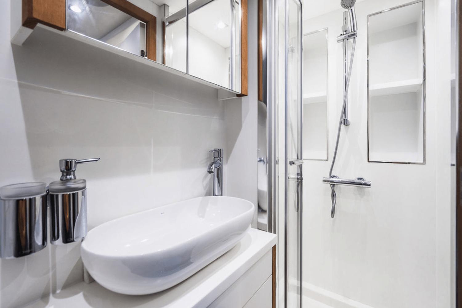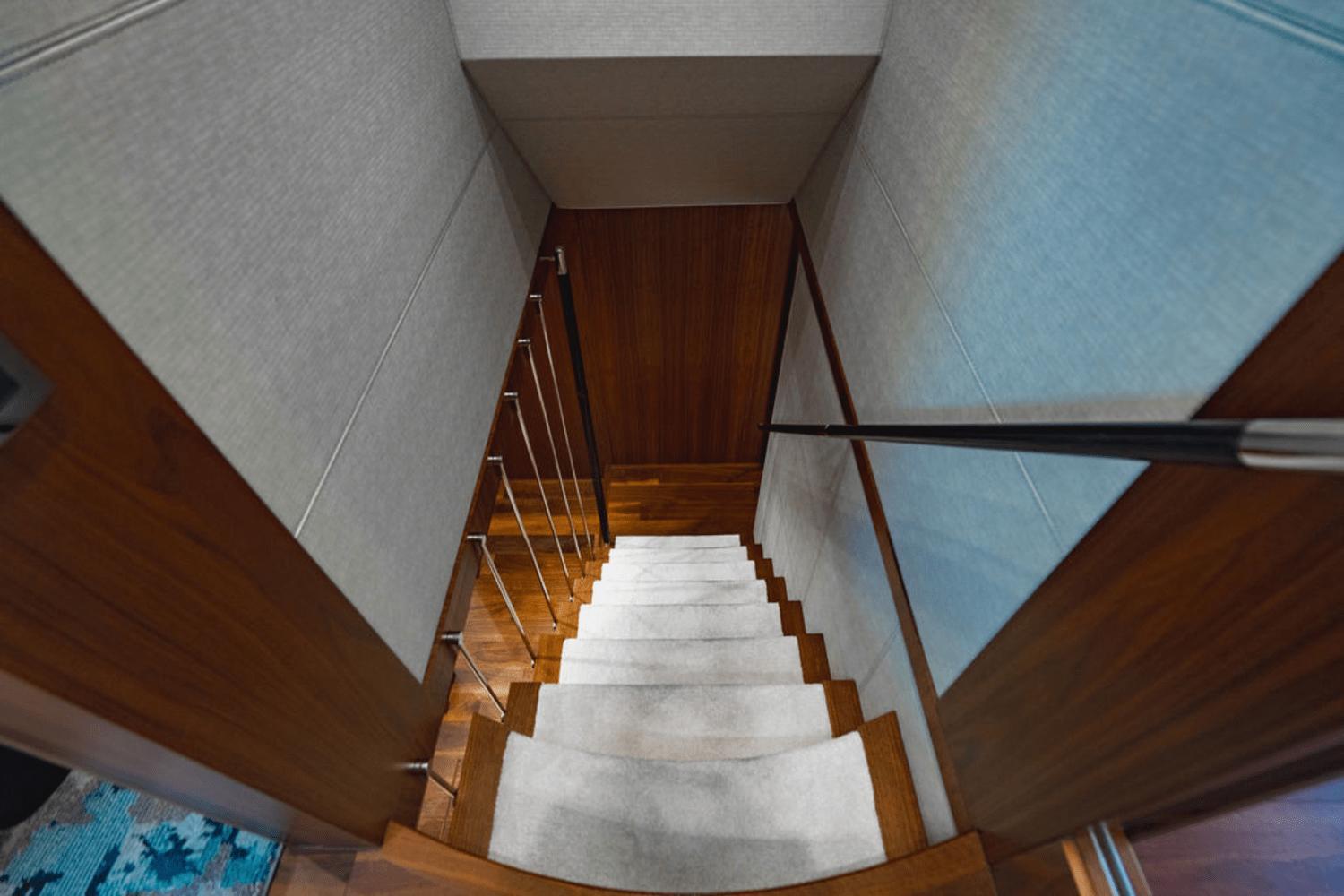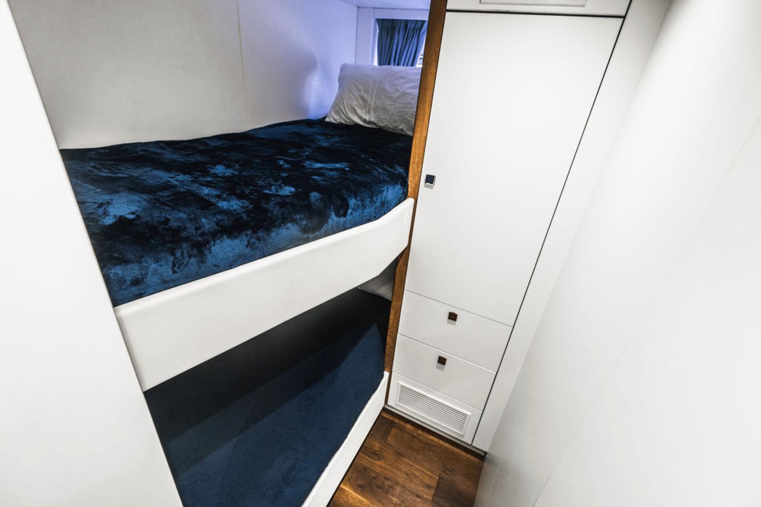 VIP stateroom is located forward in the vessel and accessed via a staircase in the lounge area. This stateroom is more like a second master than a traditional VIP. There is a center lined queen birth, large hull side windows, walk-in-closet, and oversized bath with walk-in shower. The bath is appointed with white and gray veined marble on the floor and walls.