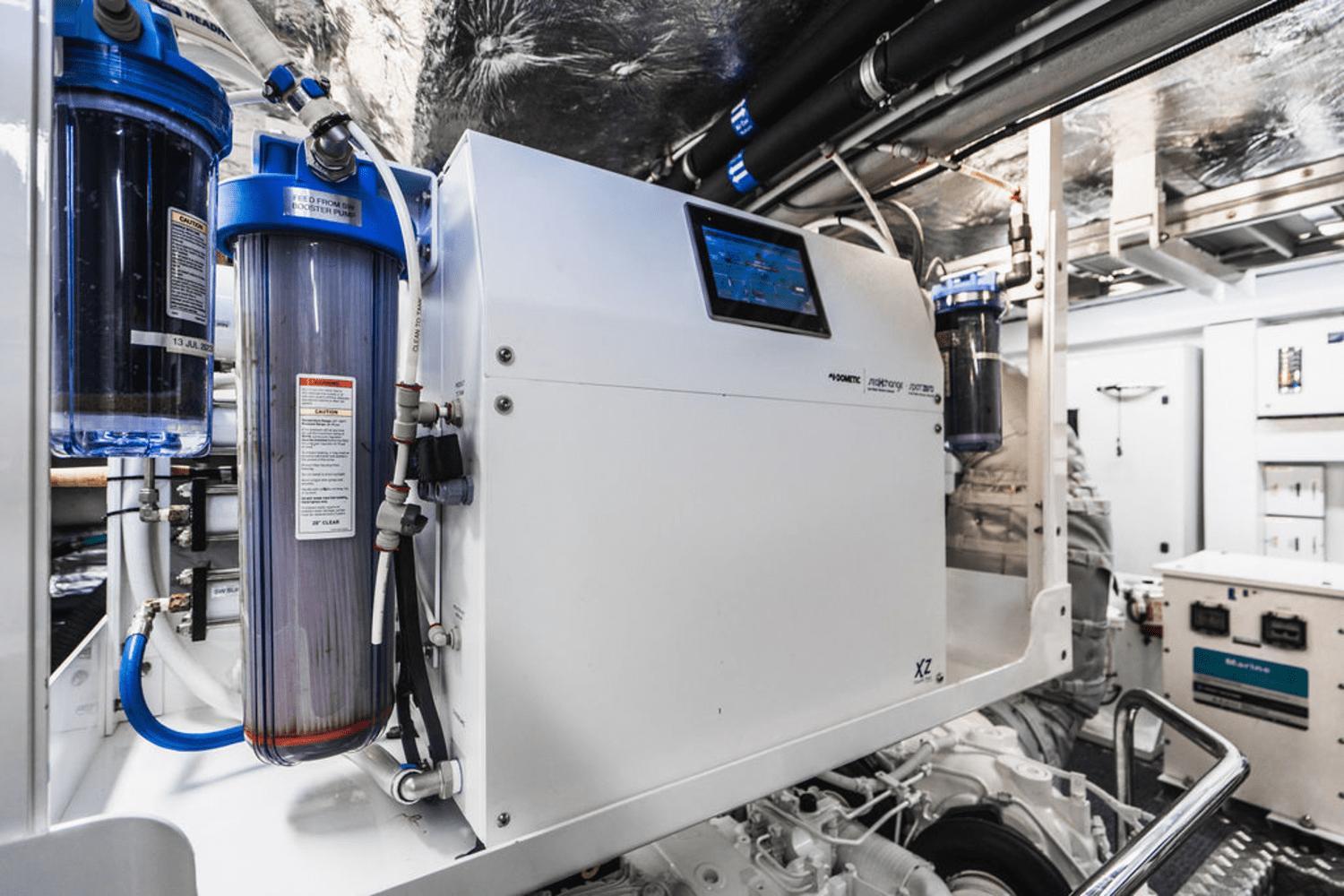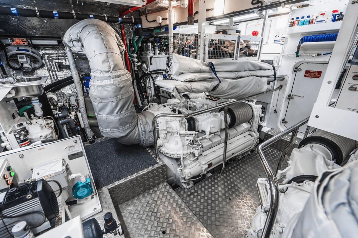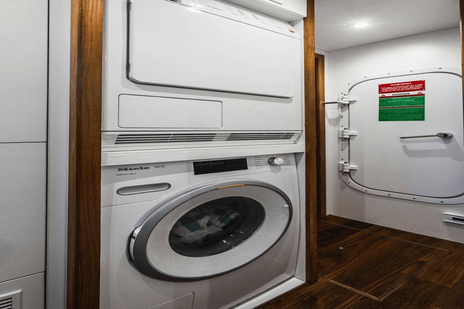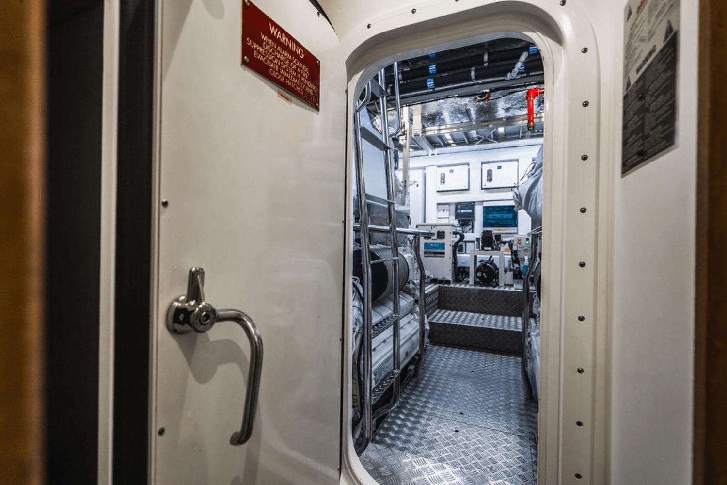 The crew quarters are located in the transom and are accessed from the tender platform. Within the crew quarters there is a large foyer area that accesses two crew staterooms that contain two bunks per room. The crew foyer also contains a crew galley, washer and dryer, and a single head and separate shower. Forward of the crew is access into the engine and mechanical room. The majority of the ship systems are contained in this area. This allows ease of access to service ship systems without entering the vessels interior.