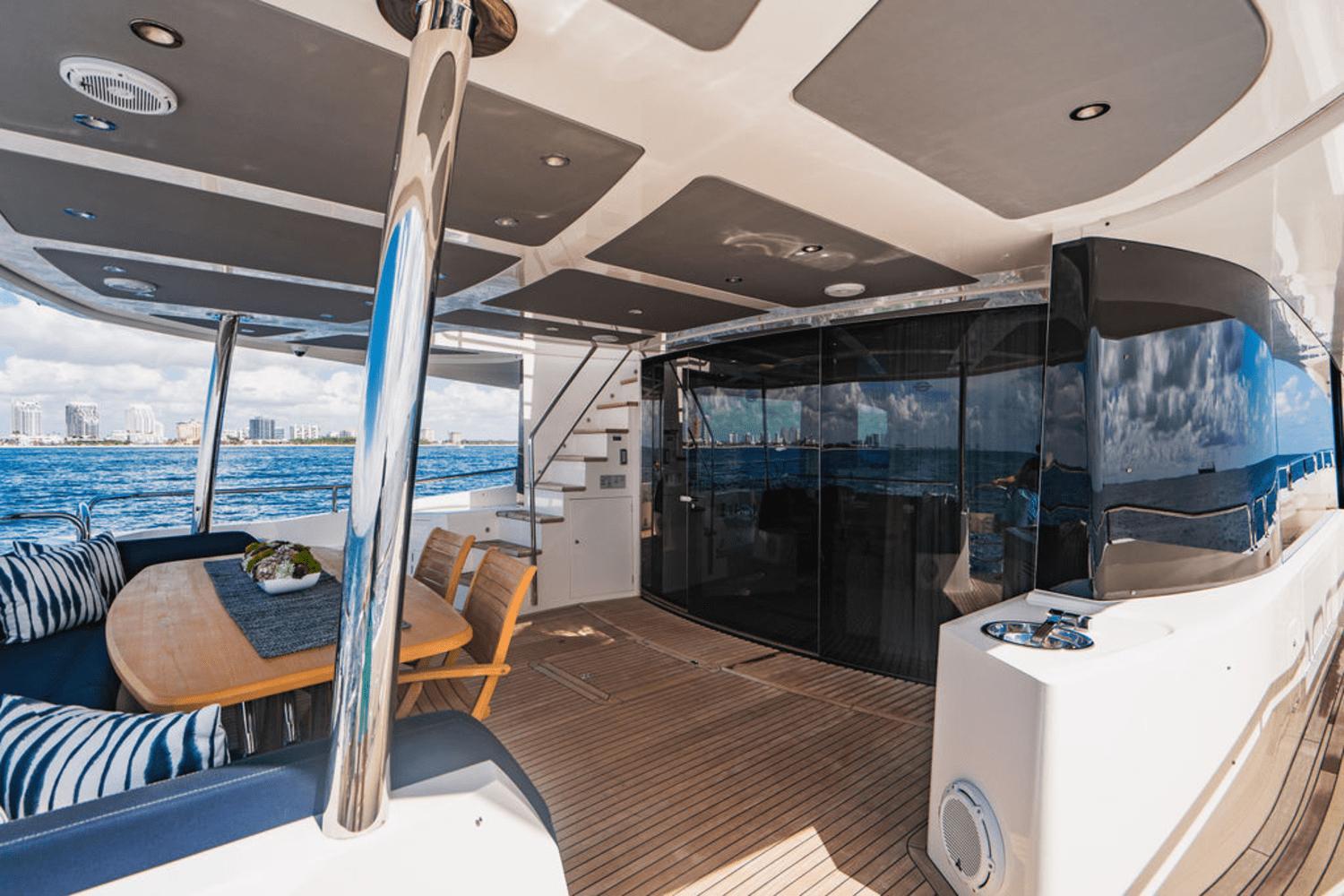 Moving back to the aft deck and up the stairs to the flybridge. When you come upon the bridge you immediately notice a well thought out bridge deck. The forward 2/3’s of the bridge deck is covered by a hard top with an opening center to provide sunlight or star gazing. To port you have a walk behind bar with bar stools on opposite side. The bar is appointed with ice maker, refrigerator, grill, and cooler box built into the bar. Starboard of the bar is a u-shaped couch and large teak table. Forward of the bar and couch is the helm area and observation seating. Aft on the bridge is a large open area with sunlounges. Also, there is an automatic sunshade that’s built into the hard top if you desire shade in this area.