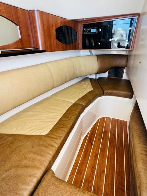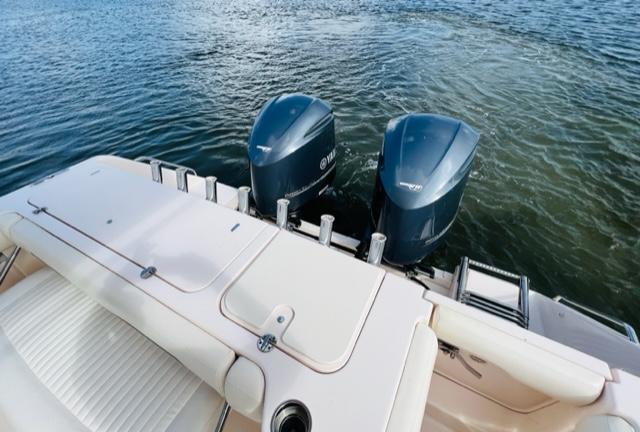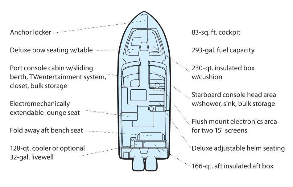 Cockpit / Deck100% hand laid hull & deck Accessory outlet - 12V (4) Anchor windlass Batteries (4) Battery charger system Battery select switches w/extra battery Cleats - flush mount (pop up) Cockpit bolsters Cockpit freshwater shower (recessed) Cockpit lights - blue LED Companion grab rail Compass Cooler - 120-qt. (114 l) aft cooler Cutting board Deck hardware - 316 grade stainless steel through-bolted Dockside power w/galvanic isolator Drink holders (20) Factory engine pre-rigging Fish/ice box - 166-qt. (157 l) aft insulated box w/ob drain Fish/ice box - 230-qt. (218 l) starboard bow insulated box w/ob drain Flush mount electronics area Footrest - helm Forward bolsters Fuel capacity - 293-gallon (1109 l) tank Hardtop w/storage net, spreader lights, down lights, hatches (2), outrigger plates & front and side curtains (ivory) Hydraulic trim tabs w/ indicator & retractor Integrated outboard mounting system w/ swim platform & ladder International lighting Rod holders (4) Rod storage racks - horizontal (6) Rubrail - high density PVC w/ stainless steel insert Seating - electromechanically adjustable port lounge seat w/storage & fold down Corian®-topped wood-grain table Seating - electromechanically operated helm seat Seating - fold away aft bench seat w/cushion Seating - port & starboard bow cushions Seating - wraparound companion bench seat Steering - hydraulic tilt w/power assist Steering wheel - 316 grade stainless steel Stereo system w/AM/FM tuner, VHF receiver, MP3 auxiliary audio connections/amplifier, Bluetooth®, remote control & fold down storage; speakers - aft (2), bow (2) & helm (2) Stern eyes - heavy-duty 316 stainless steel Storage - forward anchor locker w/rode storage Storage - port bow drawer Storage - port box under wraparound companion bench seat Table (2) - Corian®-topped wood-grain stowable table at bow & wraparound companion bench seat Transom door - fiberglass Washdown - freshwater, forward and aft Washdown - pressurized raw water Water tank - 44-gallon (167 l) freshwater Wet bar w/refrigerator, sink, storage drawers, trash bin, drink holders (2) & fire extinguisher holder (integrated with electronically operated helm seat) Windshield - walk-through tempered glass windshield Windshield wipers (port & starboard)