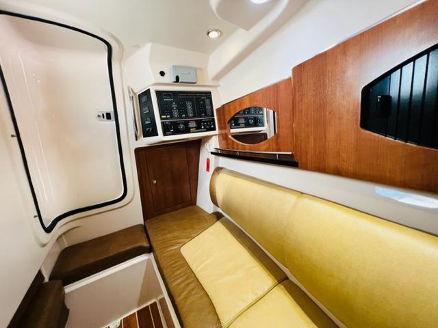 Console InteriorCherry and holly soles Portside cabin console w/electronically operated sliding berth, bench seat, closet, drawers, mirror, lighting, tinted screened window & bulk storage Starboard console w/VacuFlush® head (10-gallon) (38 l), shower, sink, drawers, lighting & bulk storage