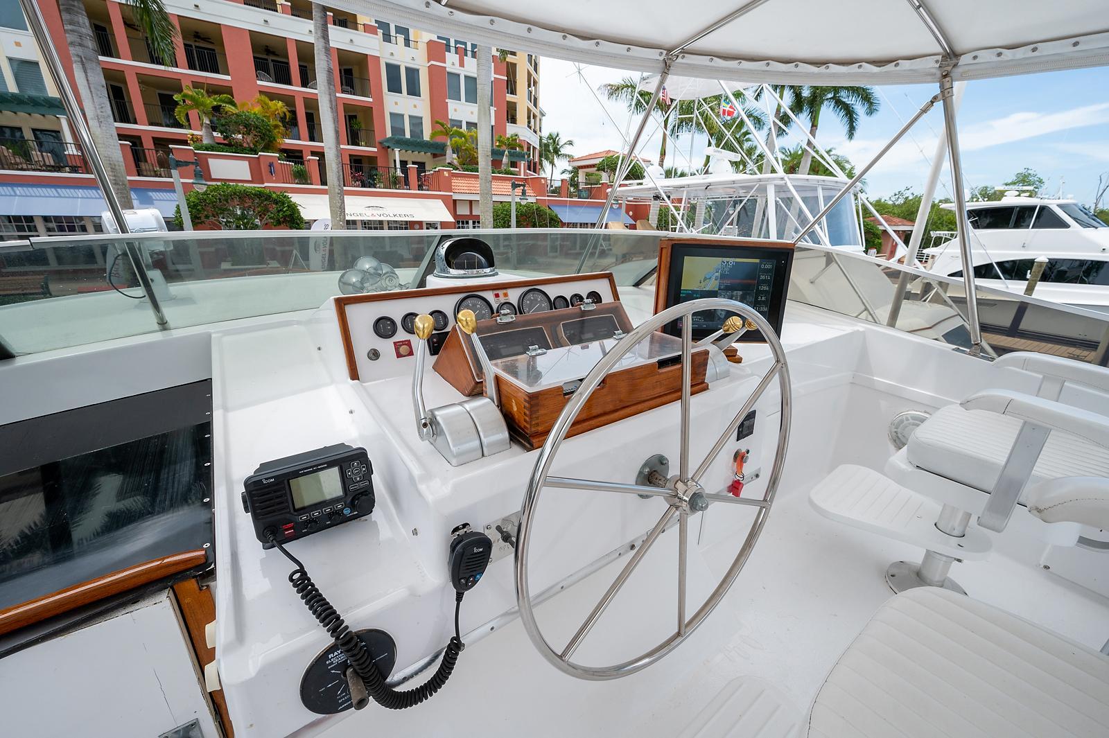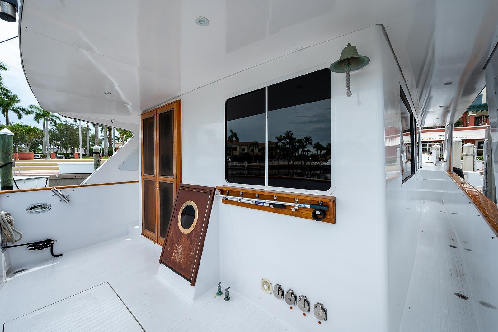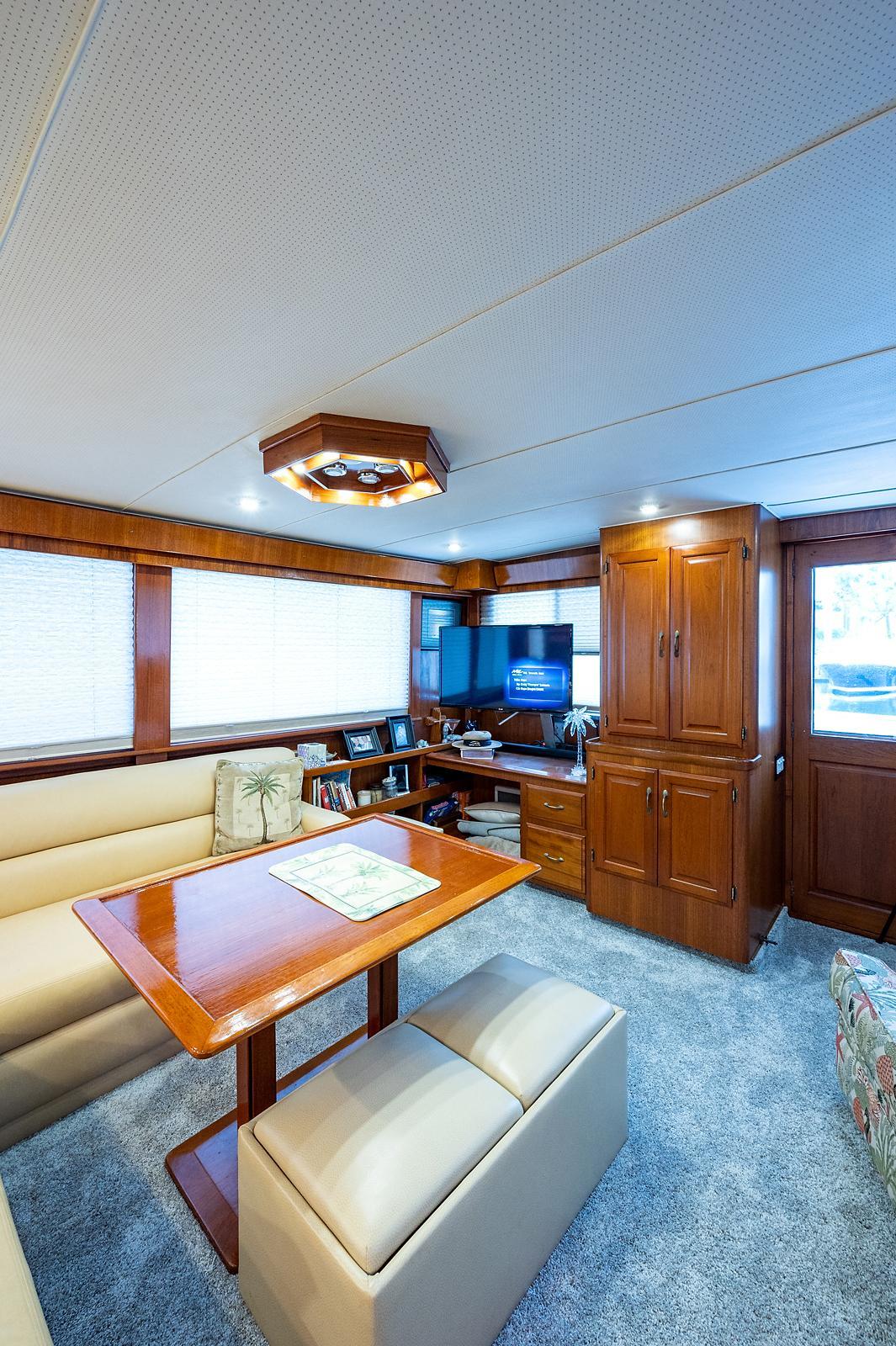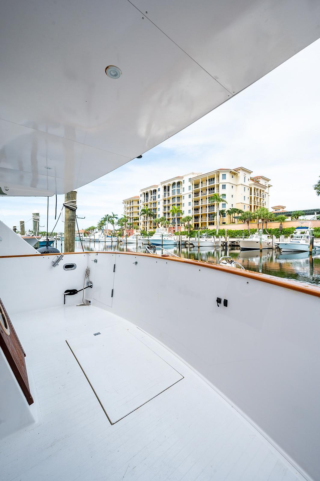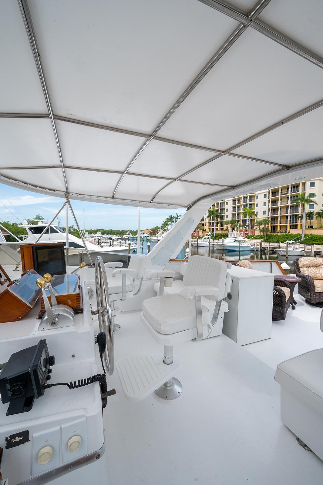 The flybridge offers a fully appointed, centerline helm, guest seating an open-air lounging area on the boat deck amidships, and the dinghy on davit aft. Engine room access is provided through a centerline door in the cockpit area. There are full walkaround decks which are covered as is the cockpit. 6'4" Cabin Headroom.